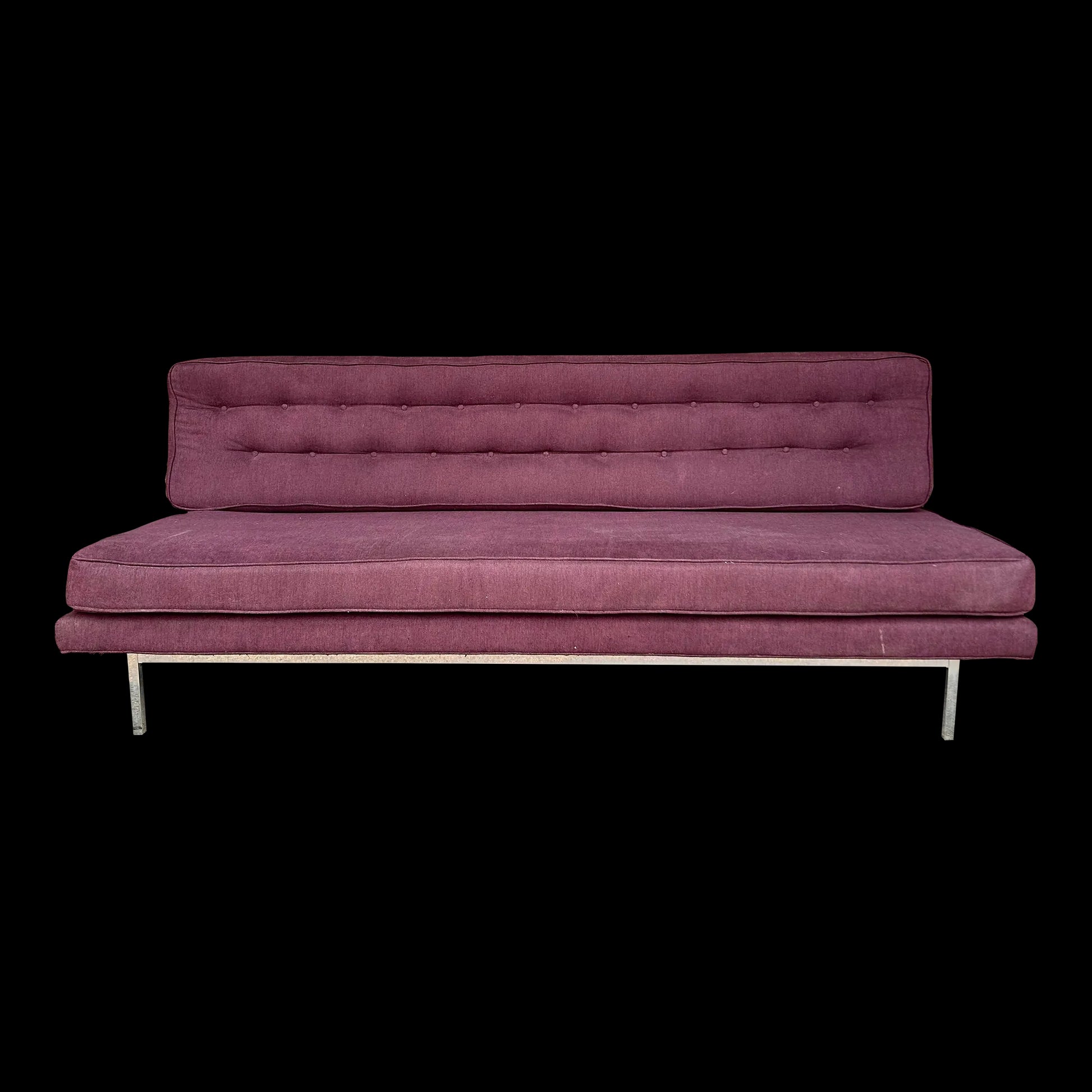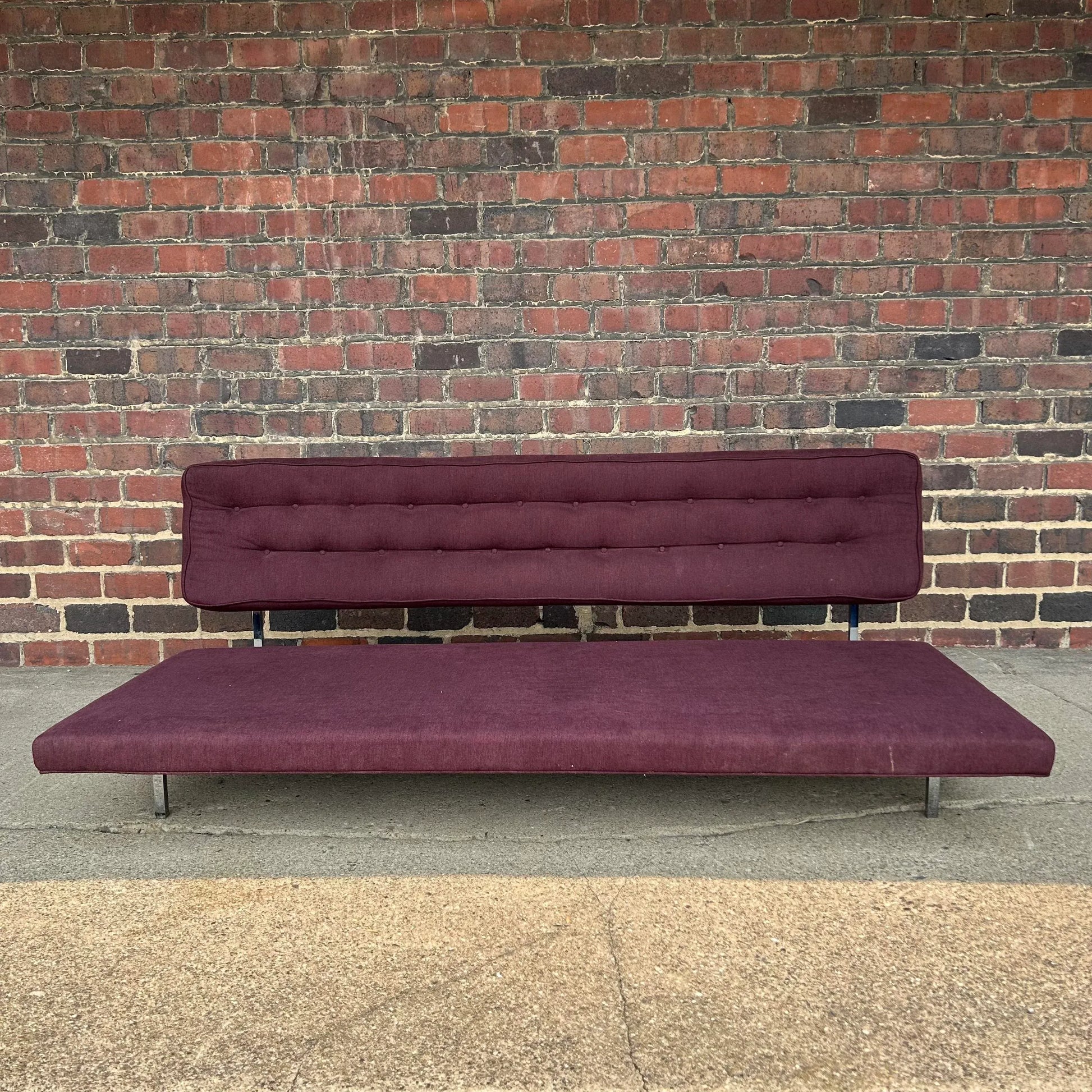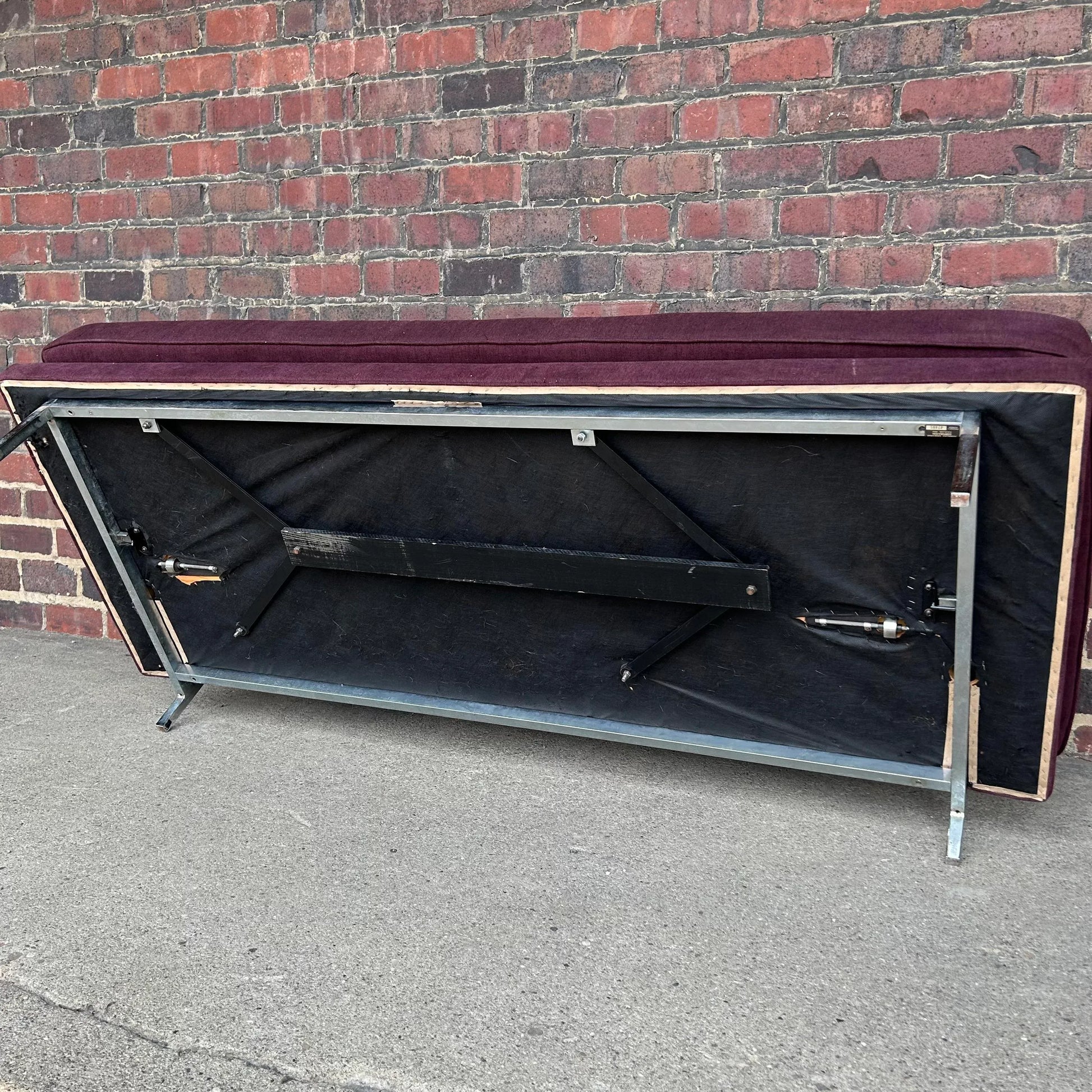Convertible sofa daybed by Richard Schultz for Knoll. This sofa features purple fabric and a chrome base. This would be perfect piece for having guests stay over without taking up too much space. When daybed is out, the seat depth expands to 32”, full depth is 42”