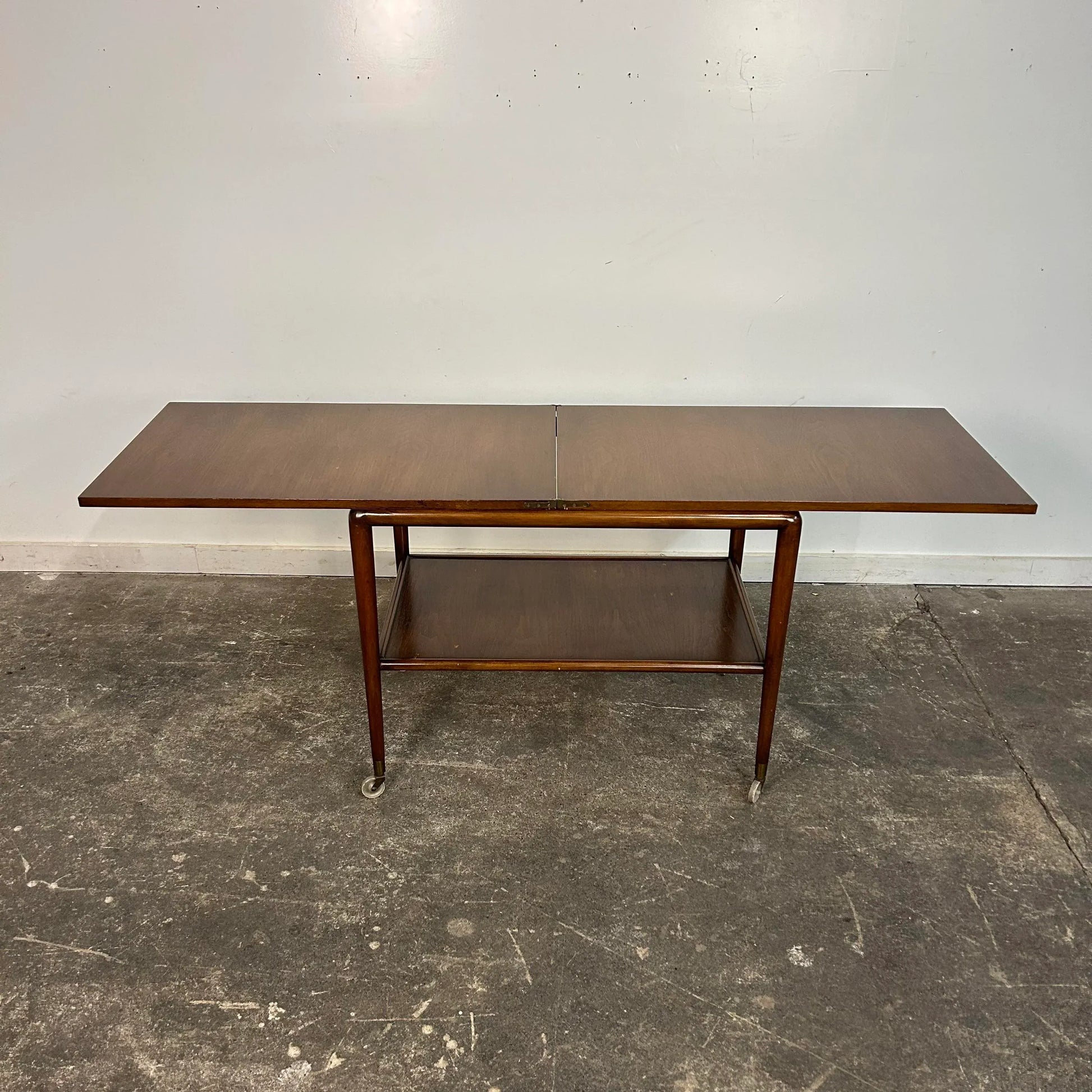 Mid century modern bar cart by Robsjohn Gibbings. This piece has an extendable fold out table, bottom tier for storage, and brass capped legs.