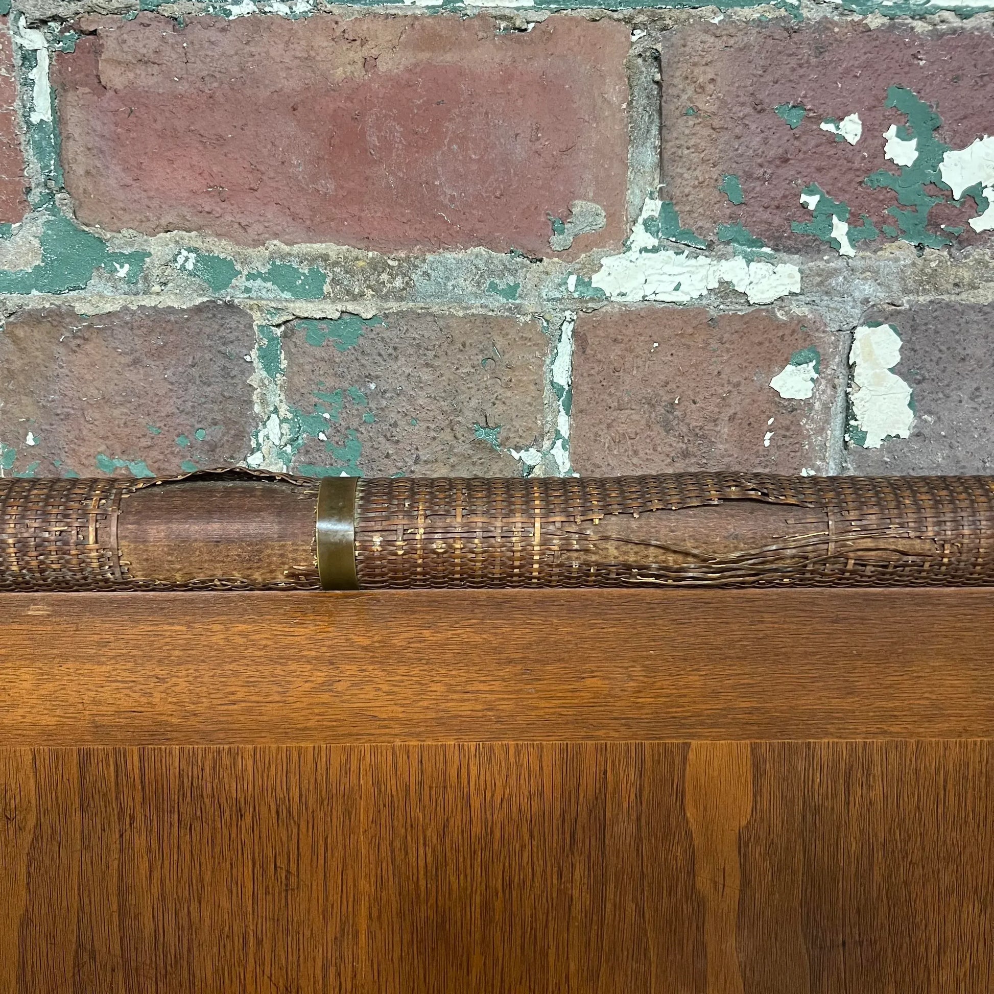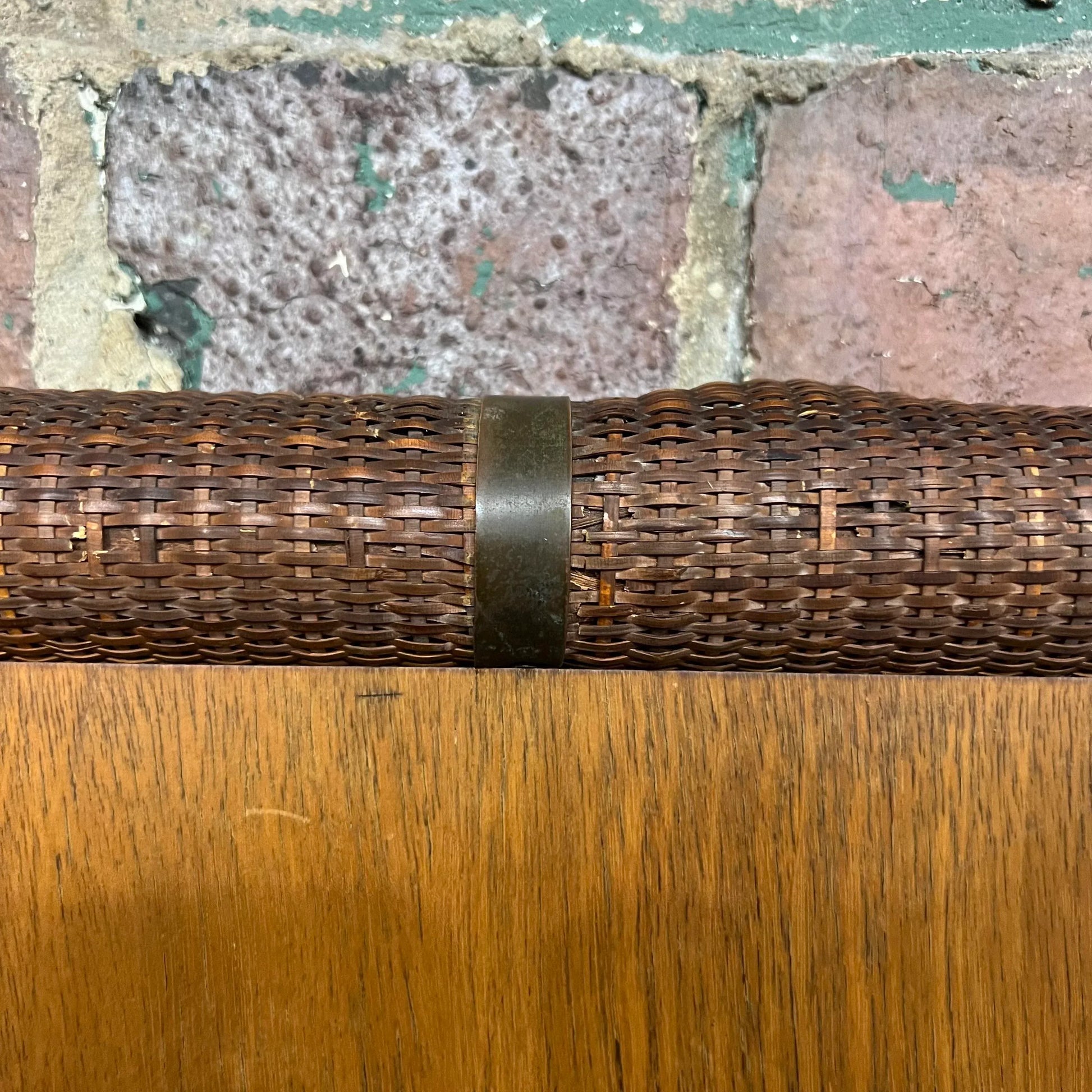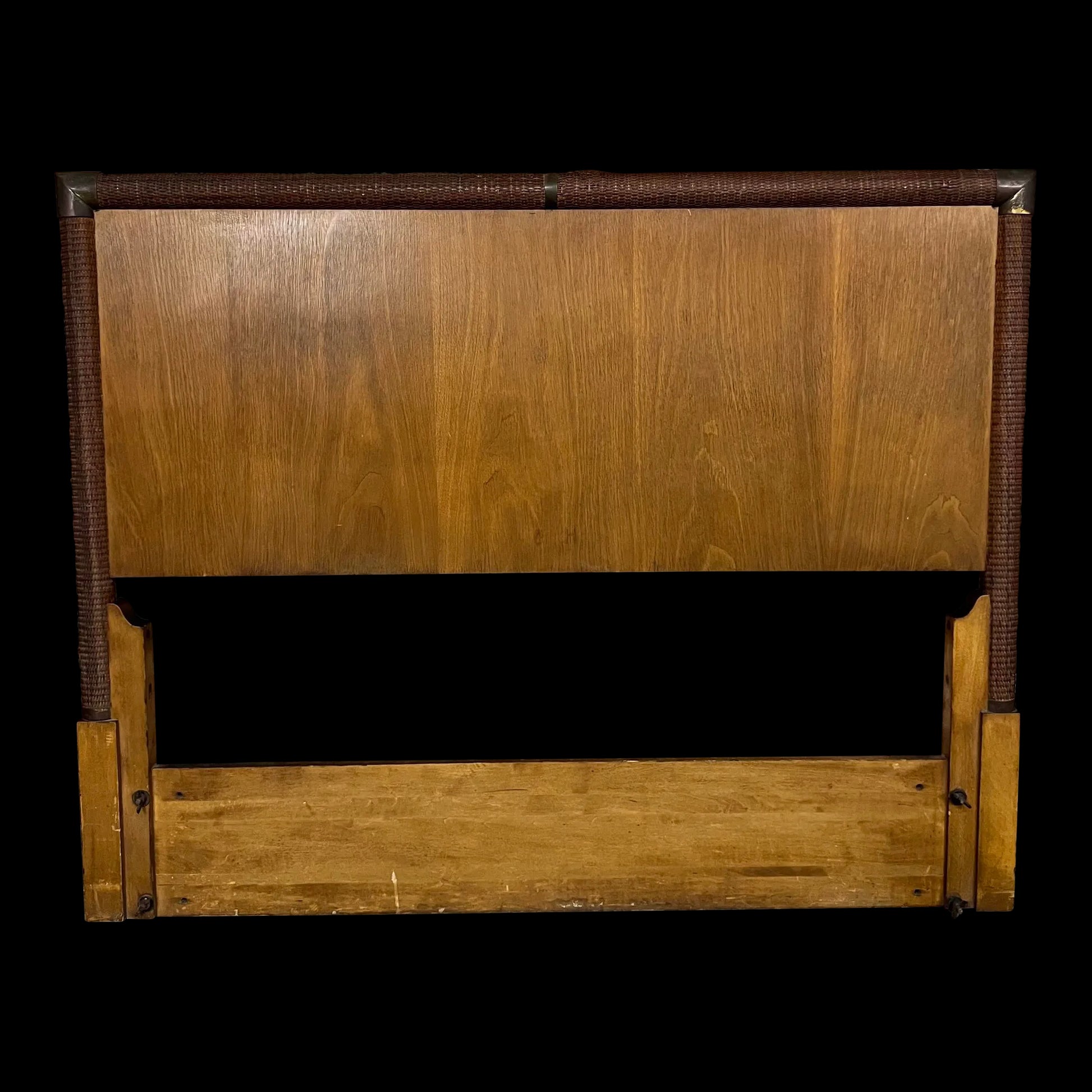 Mid century modern twin size headboard by Robsjohn Gibbings. The edges of the piece are wrapped in wicker. There is brass detailing that has a good amount of wear and patina.