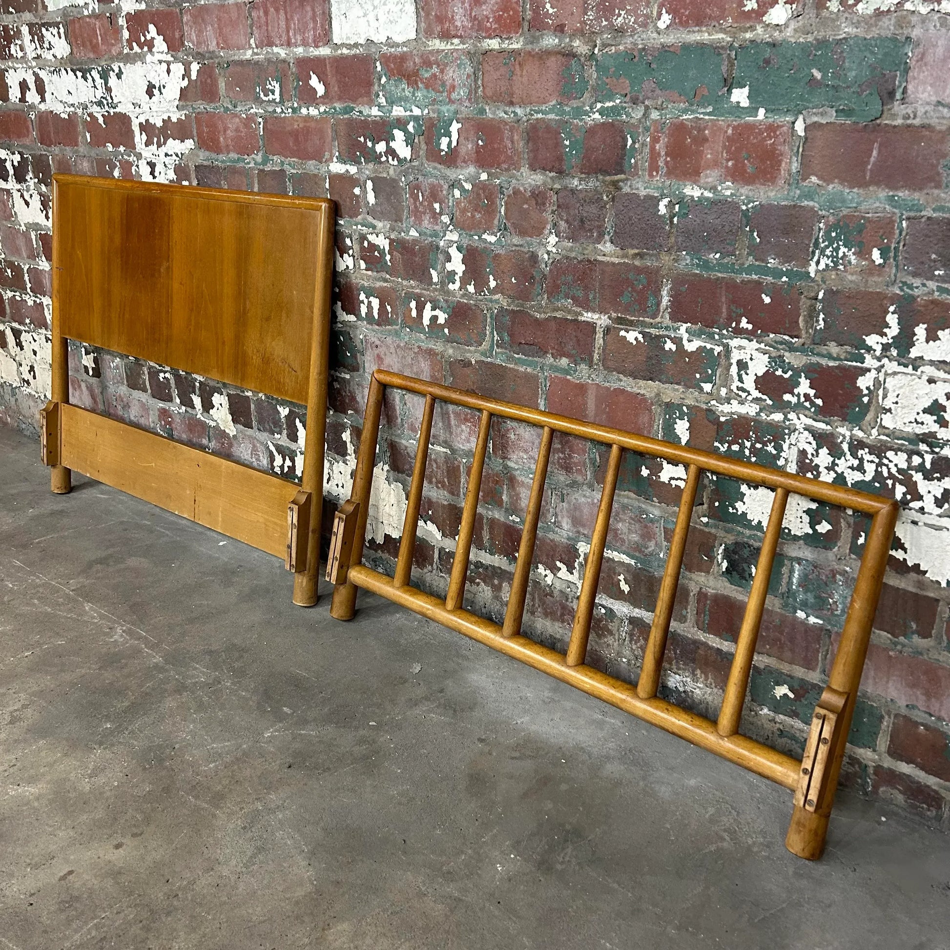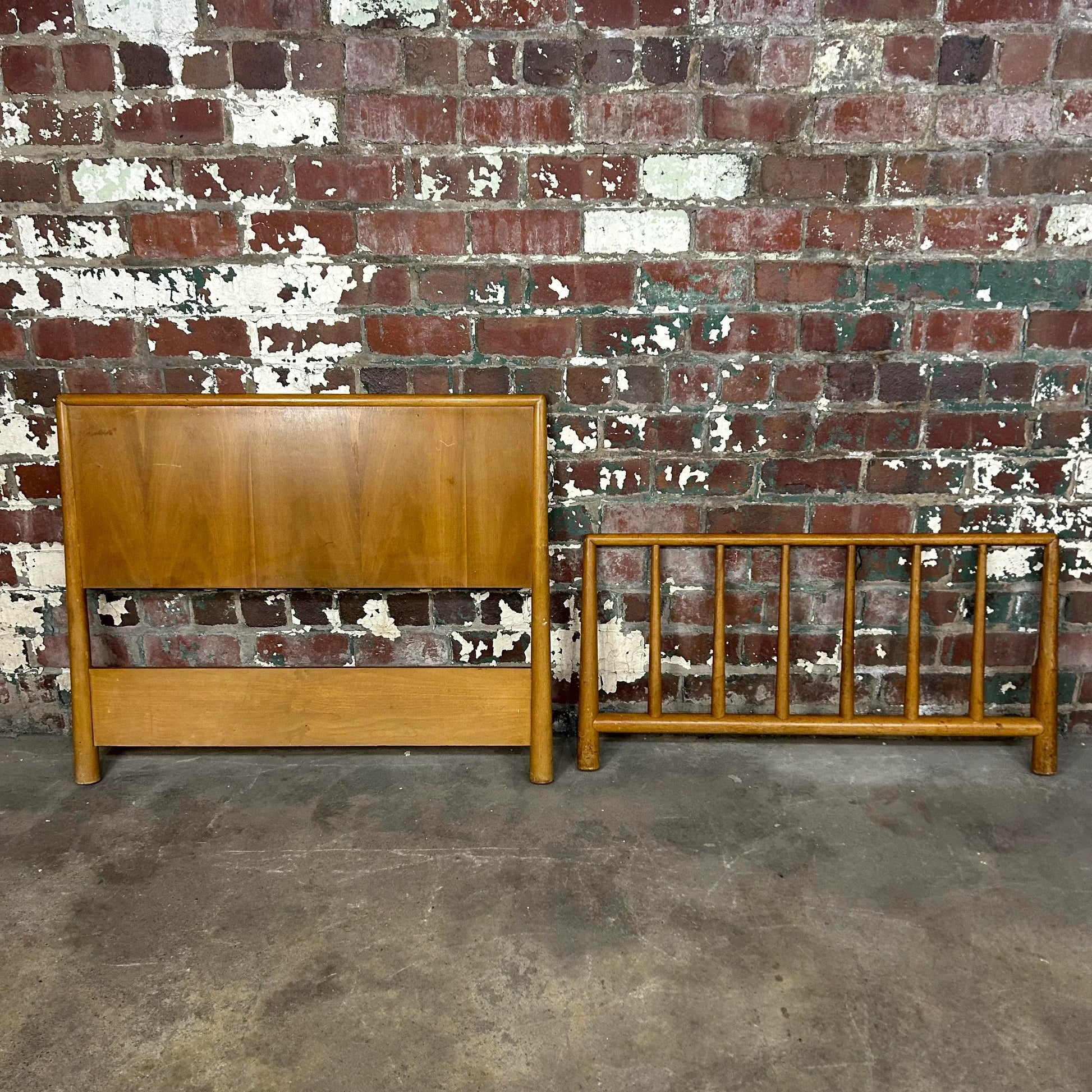 Mid century modern twin size headboard and footboard designed by Robsjohn Gibbings. The headboard is a sleek rectangular shape with Gibbing’s classic curved lipped edges. The footboard is a beautifully designed minimal piece with spindles. Footboard measures 42.5” W x 3.5” D x 21.5” H