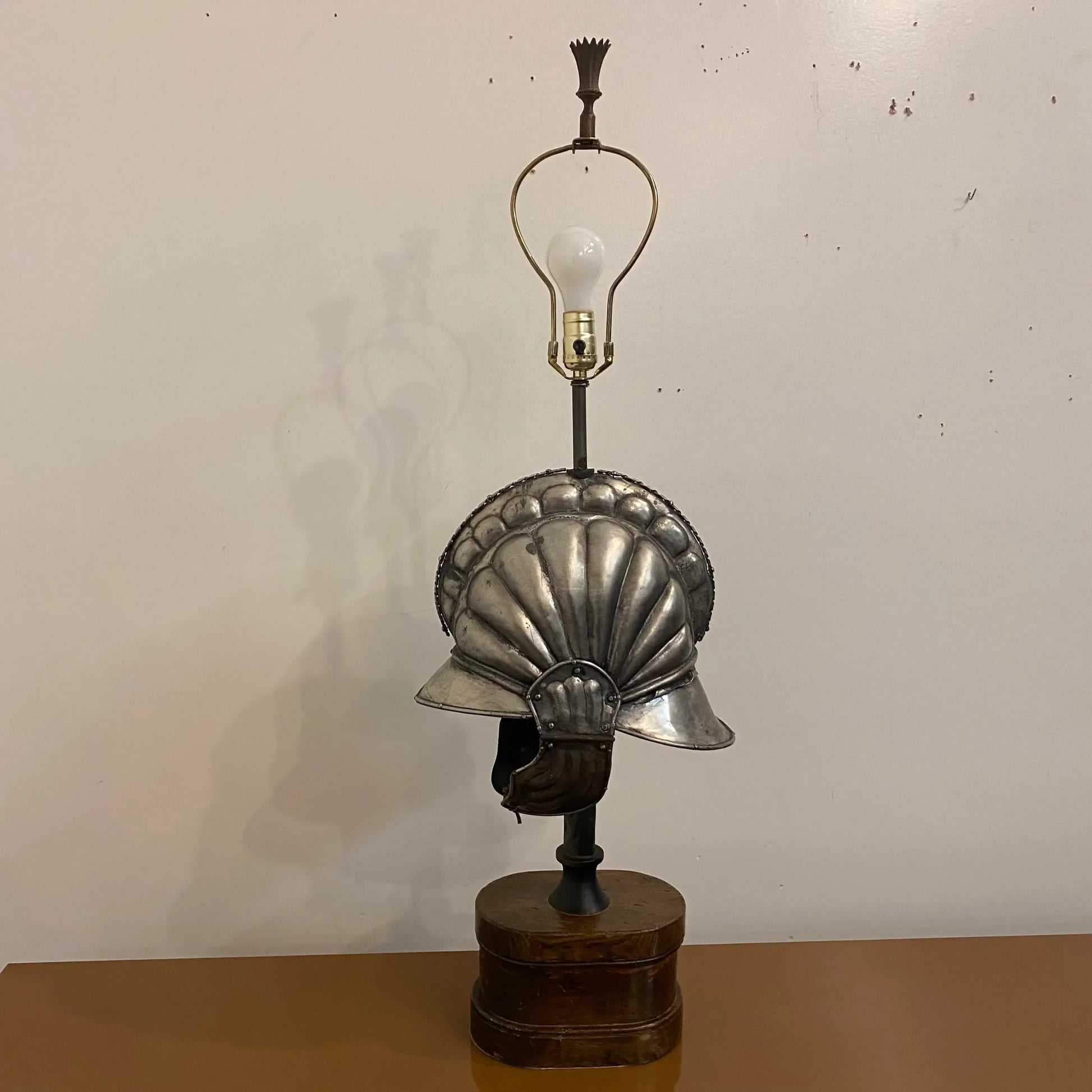 This lamp is very heavy. The body is a metal Roman style battle helmut sitting on a wooden base. The base and the shade or both oval shaped.