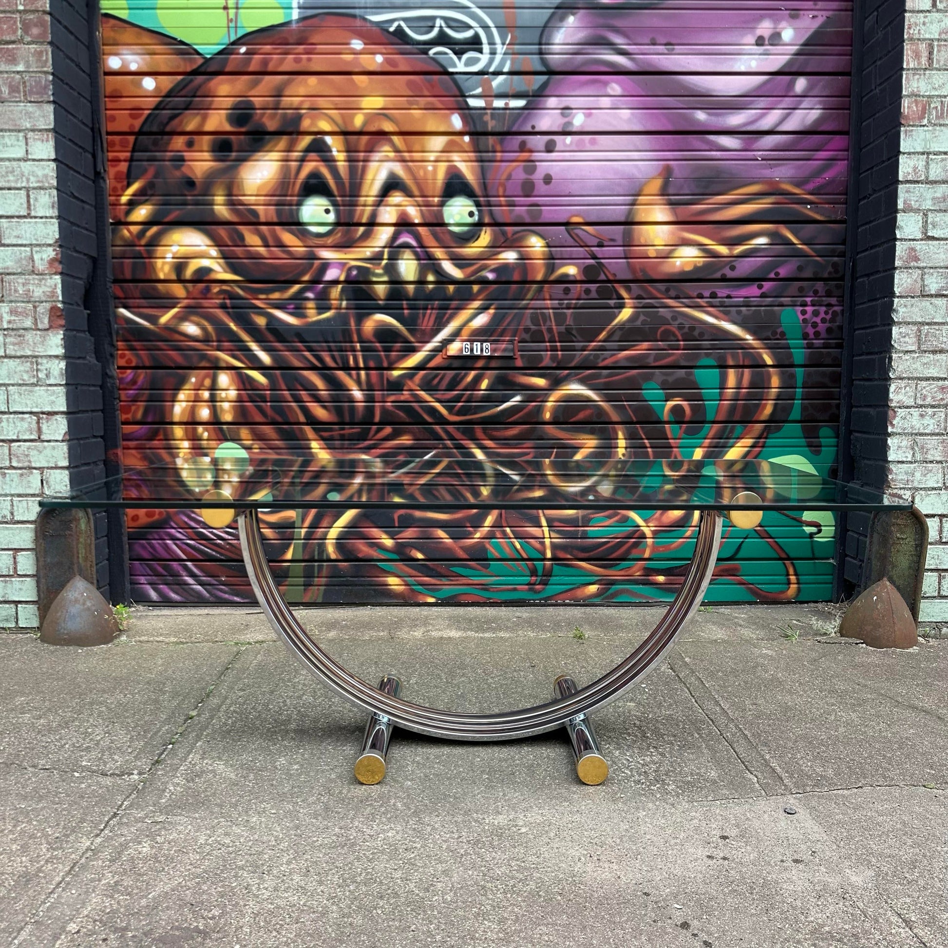 This elegant dining table by Romeo Rega is as much of a sculptural art piece as it is a functional dining table. The art-deco harp shape features a chrome and brass accented base with a 1/2” thick glass tabletop.