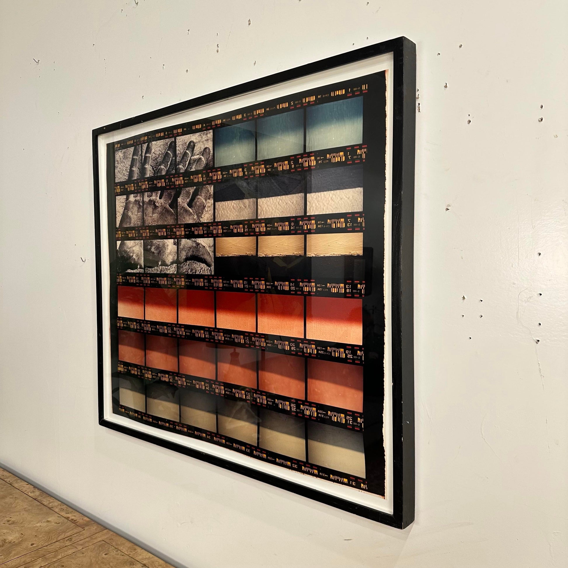 Ruth Litoff “Identity” collage depicts a flag with a hand in the top left corner. The artist is featured in a documentary called 32 Pills, which follows Litoff’s sister’s quest for understanding Litoff’s life, work, and death by suicide.