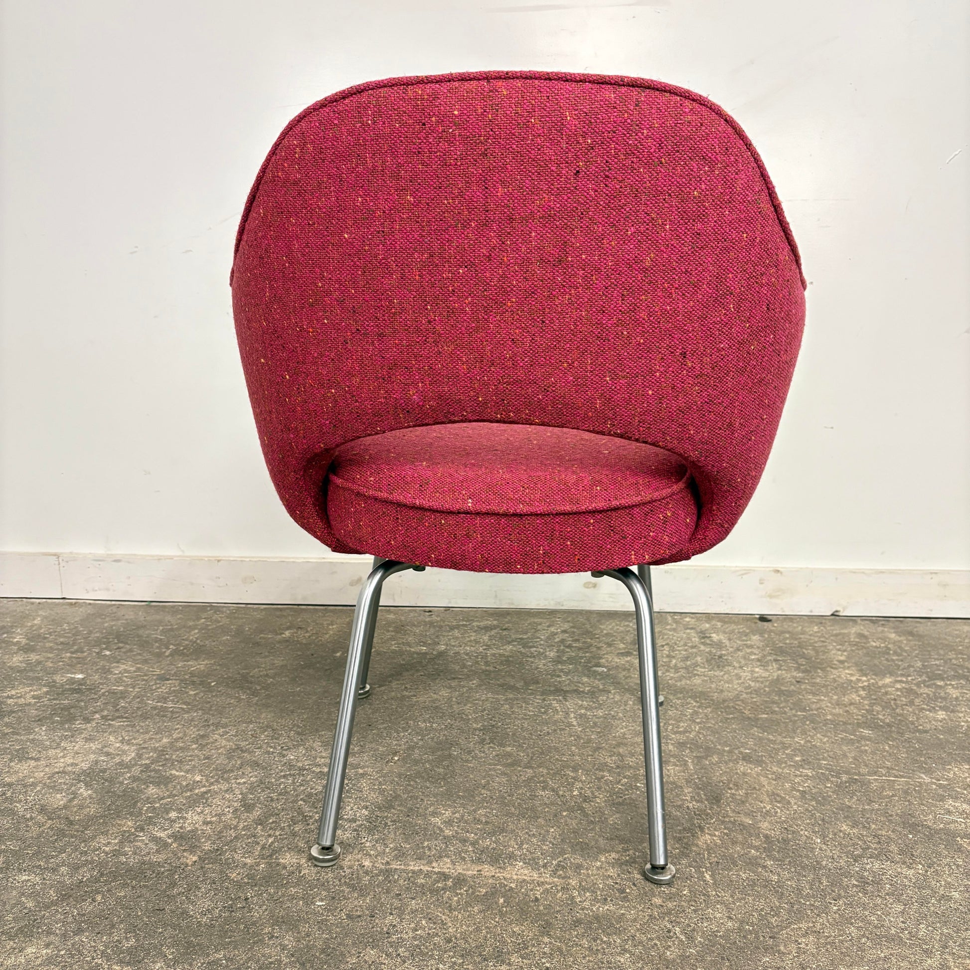 Eero Saarinen “Executive” armchair chair for Knoll that’s been reupholstered in a fuchsia Pierre Frey textile. The chair legs are a chrome metal.