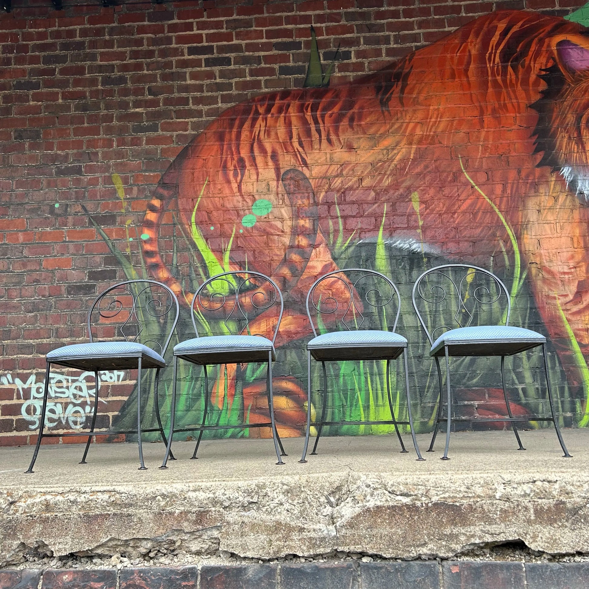Set of 4 iron outdoor patio chairs by Salterini with blue patterned seat cushions.