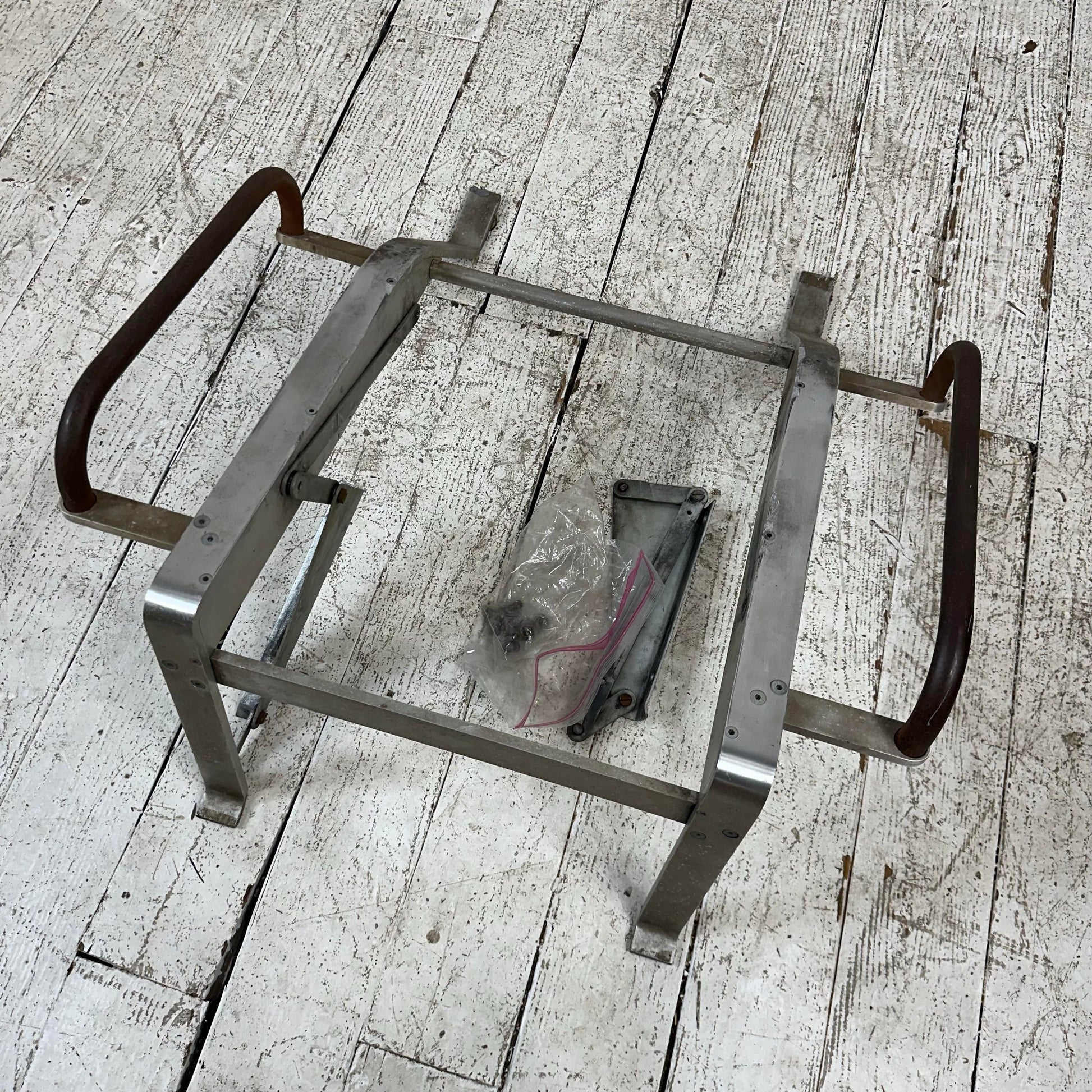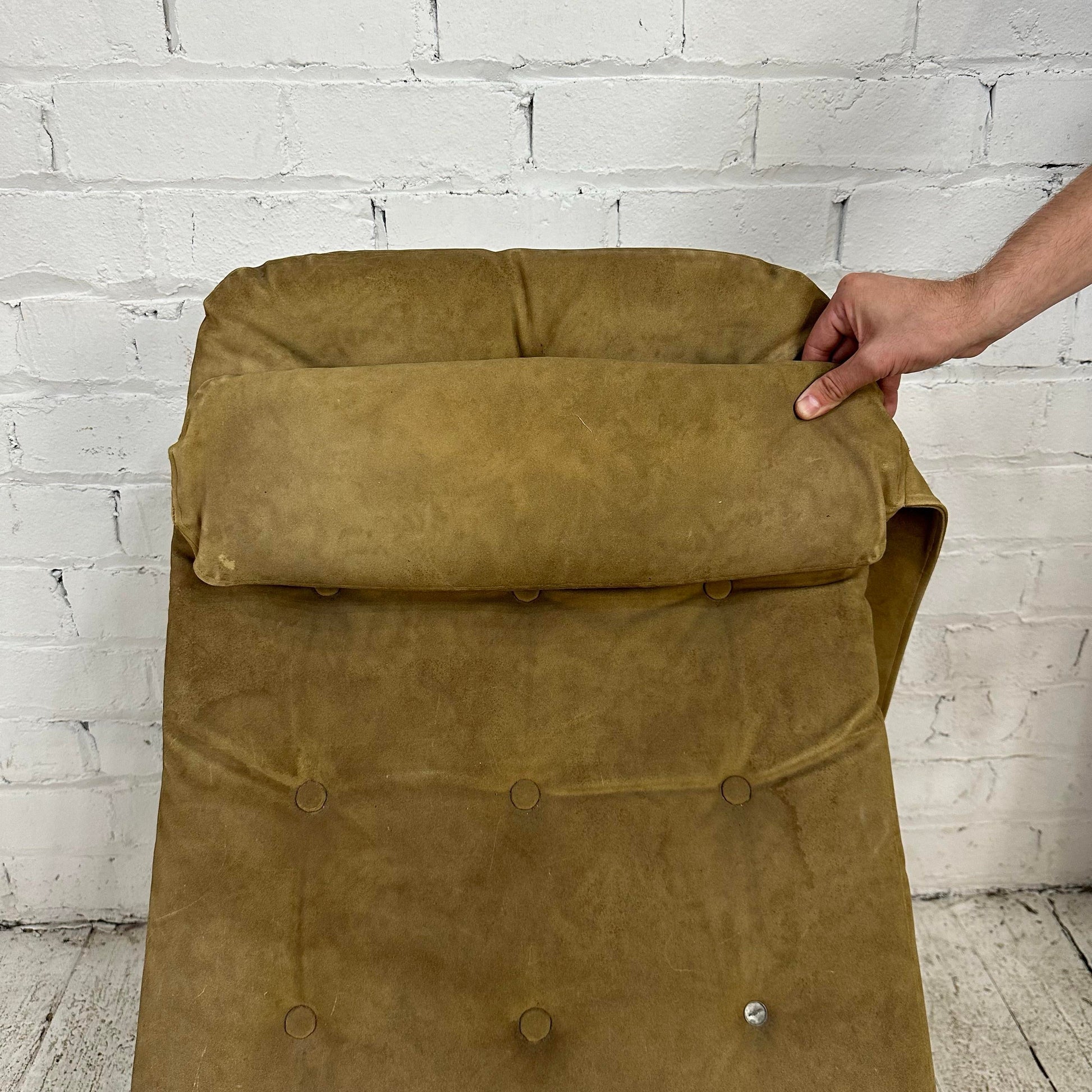 This Striking danish design chaise lounge is reminiscent of the iconic Grasshopper chaise designed by Kastholm Fabricus. We are unsure of the maker of this chair but is definitely vintage and well made of stainless steel. The arms are saddly no longer wrapped in leather but this is the intended design. There is No makers mark.