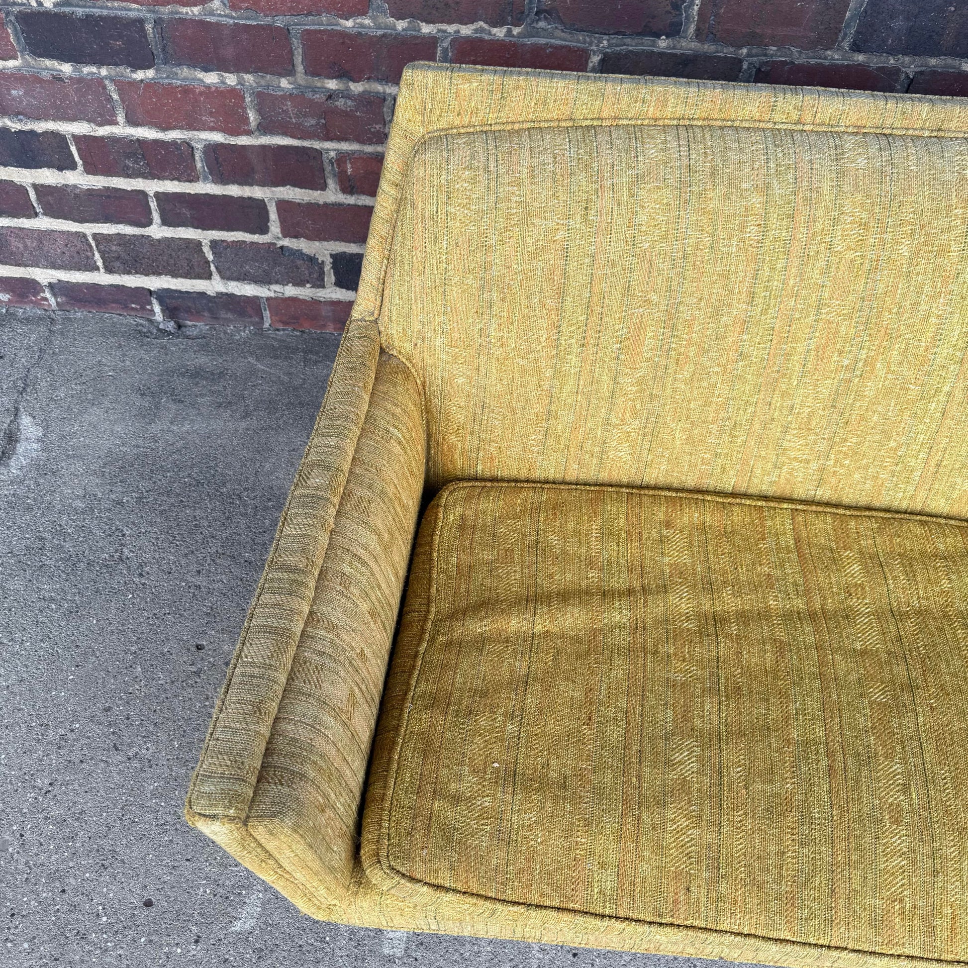 This gold-colored Selig Sofa has a solid, well-constructed frame with excellent angles and a striking silhouette. The current fabric shows wear and it should be reupholstered, but the bones are fantastic. A great candidate for a fresh new look—unique and full of potential.