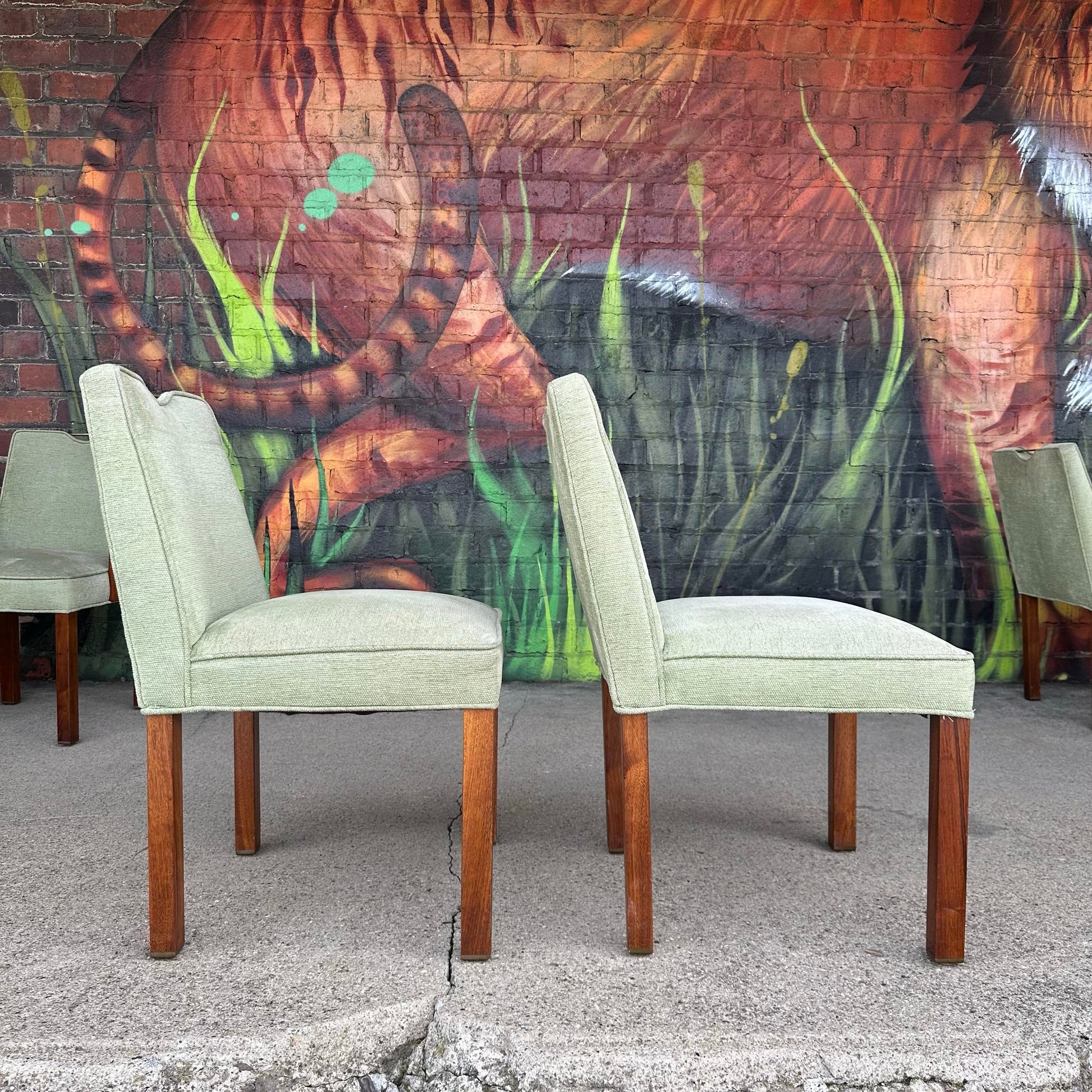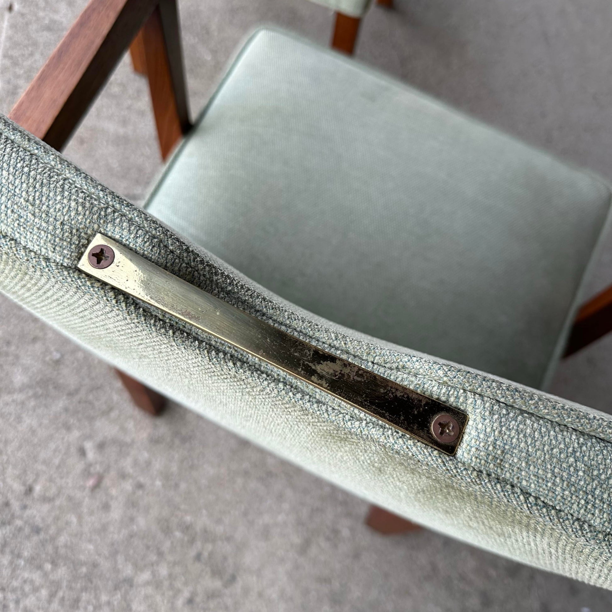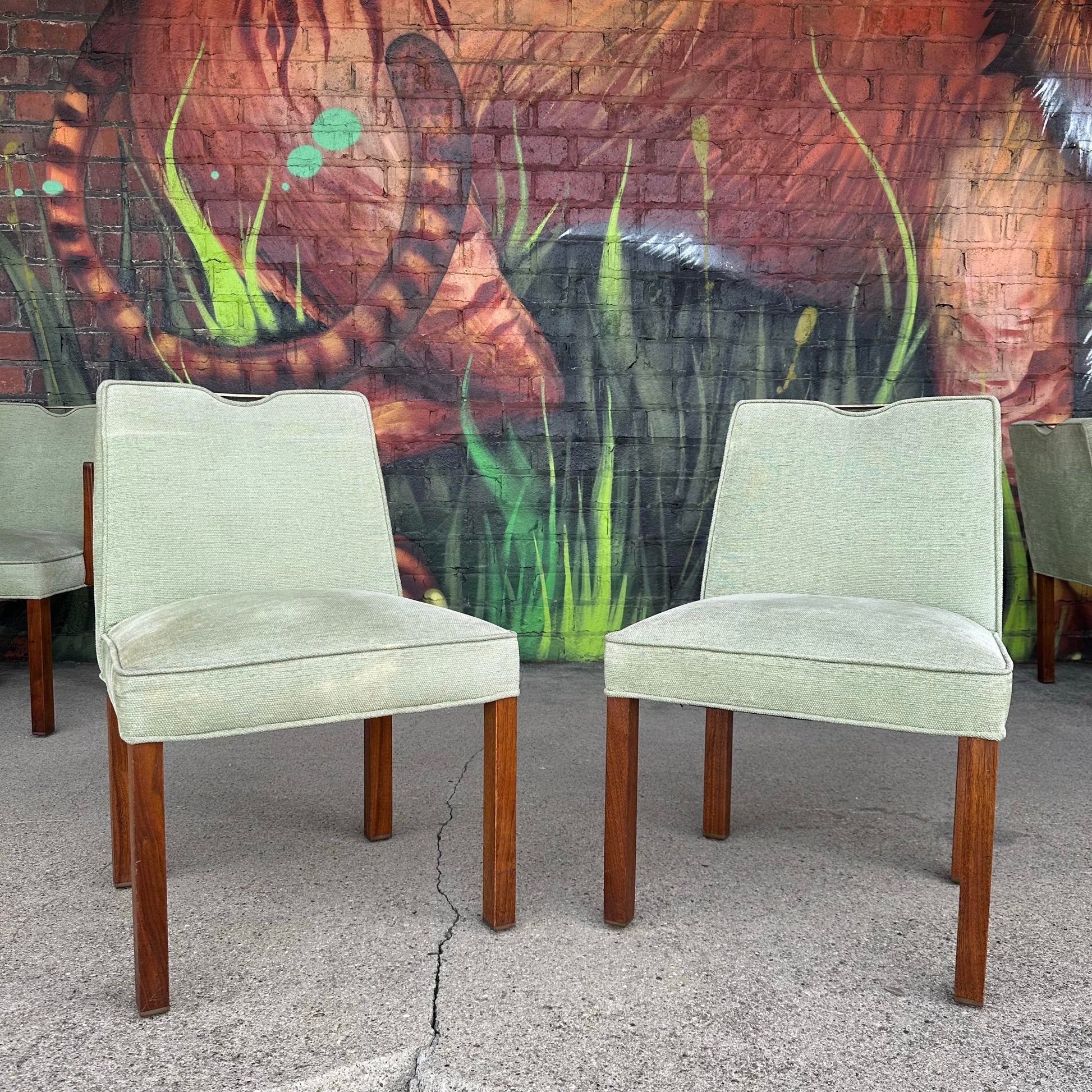 Mid century modern Set of 12 Edward Wormley for Dunbar With Brass Handles and Brass Feet Model 4710A. This set of chairs features walnut legs with brass capped feet. Upholstered seat and back and a brass handle detail. The chairs have been previously reupholstered and the tag has been removed.