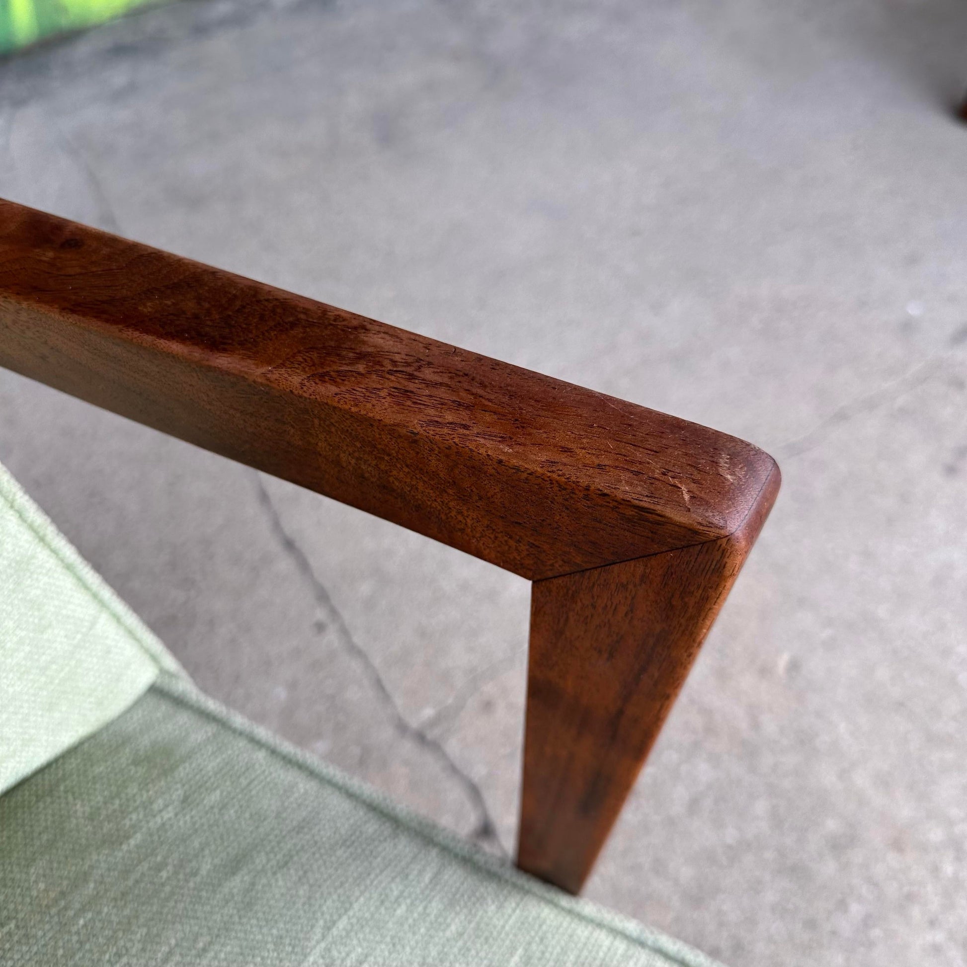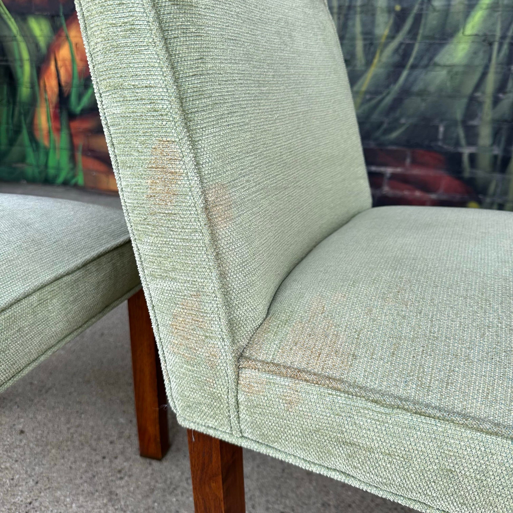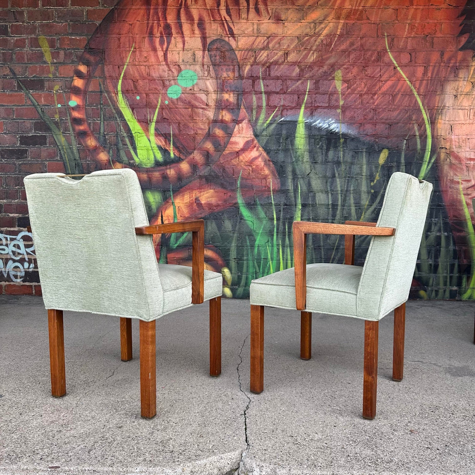 Mid century modern Set of 12 Edward Wormley for Dunbar With Brass Handles and Brass Feet Model 4710A. This set of chairs features walnut legs with brass capped feet. Upholstered seat and back and a brass handle detail. The chairs have been previously reupholstered and the tag has been removed.