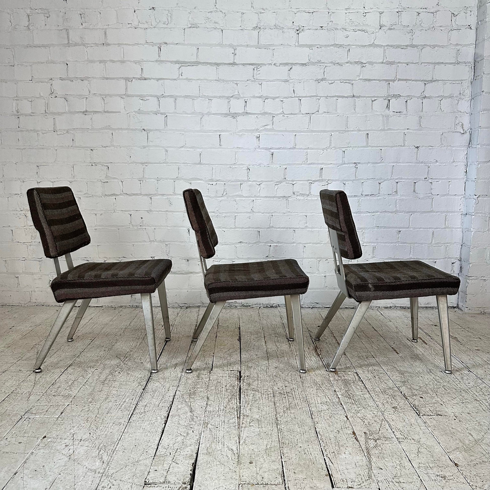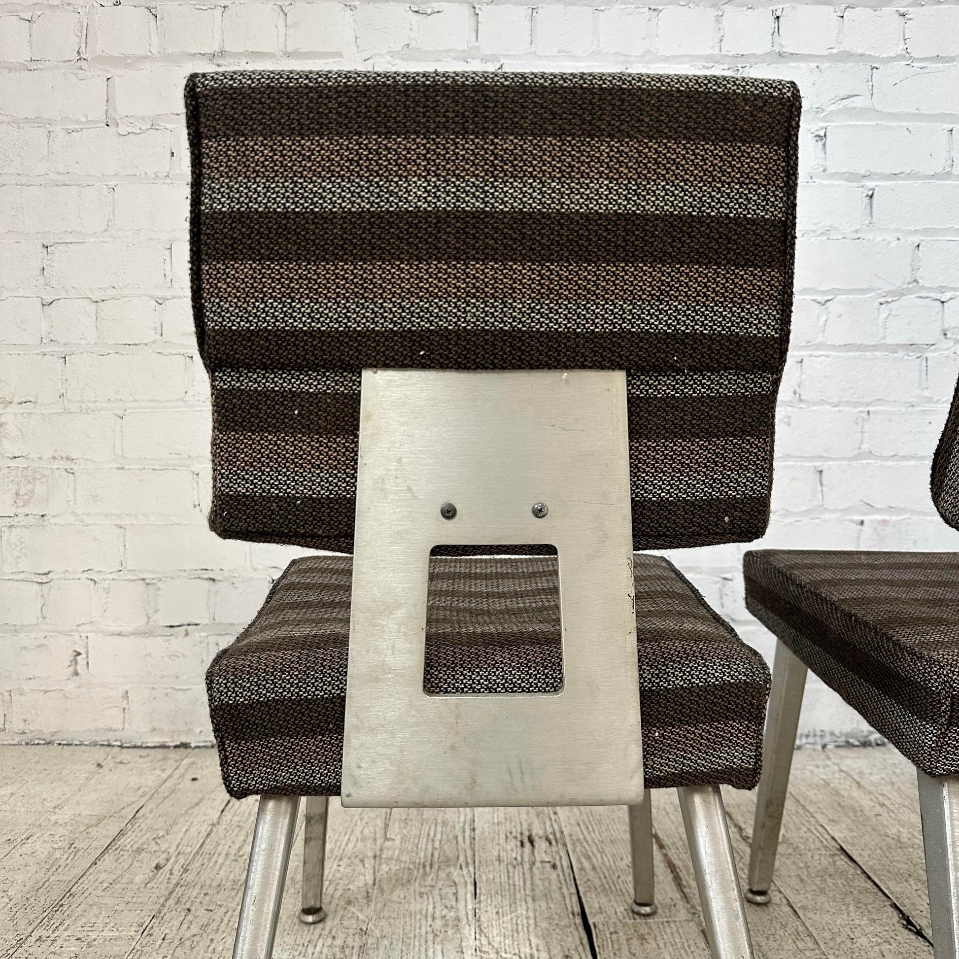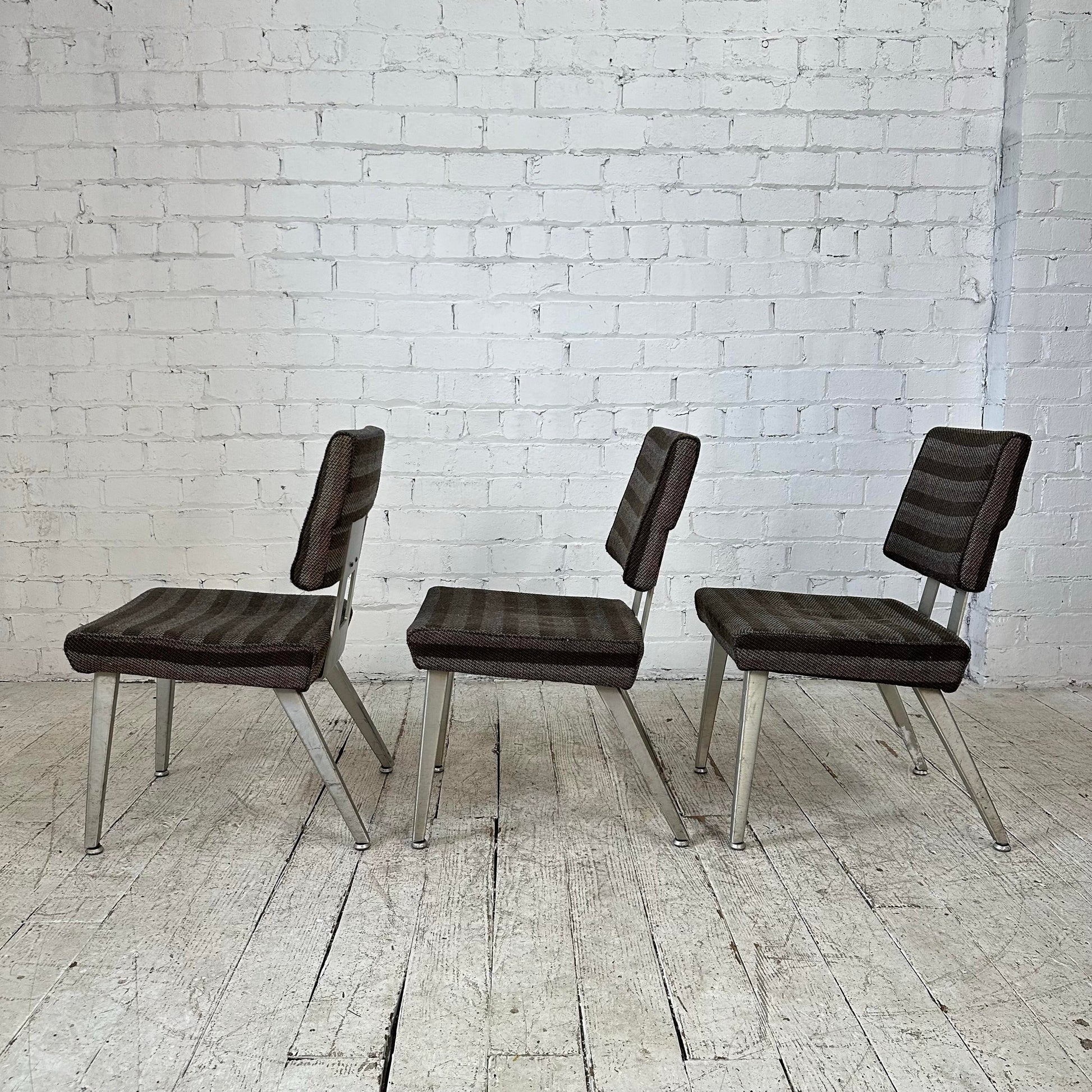 Mid century modern Set of 3 Gf Good Form Aluminum Chairs. Circa the 1960s. This set of chairs features aluminum frames, exposed back rest and legs and upholstered cushions. These chairs have a great mid century modern look and could be used in a variety of different settings. There is a makers mark under the seat of the chairs.