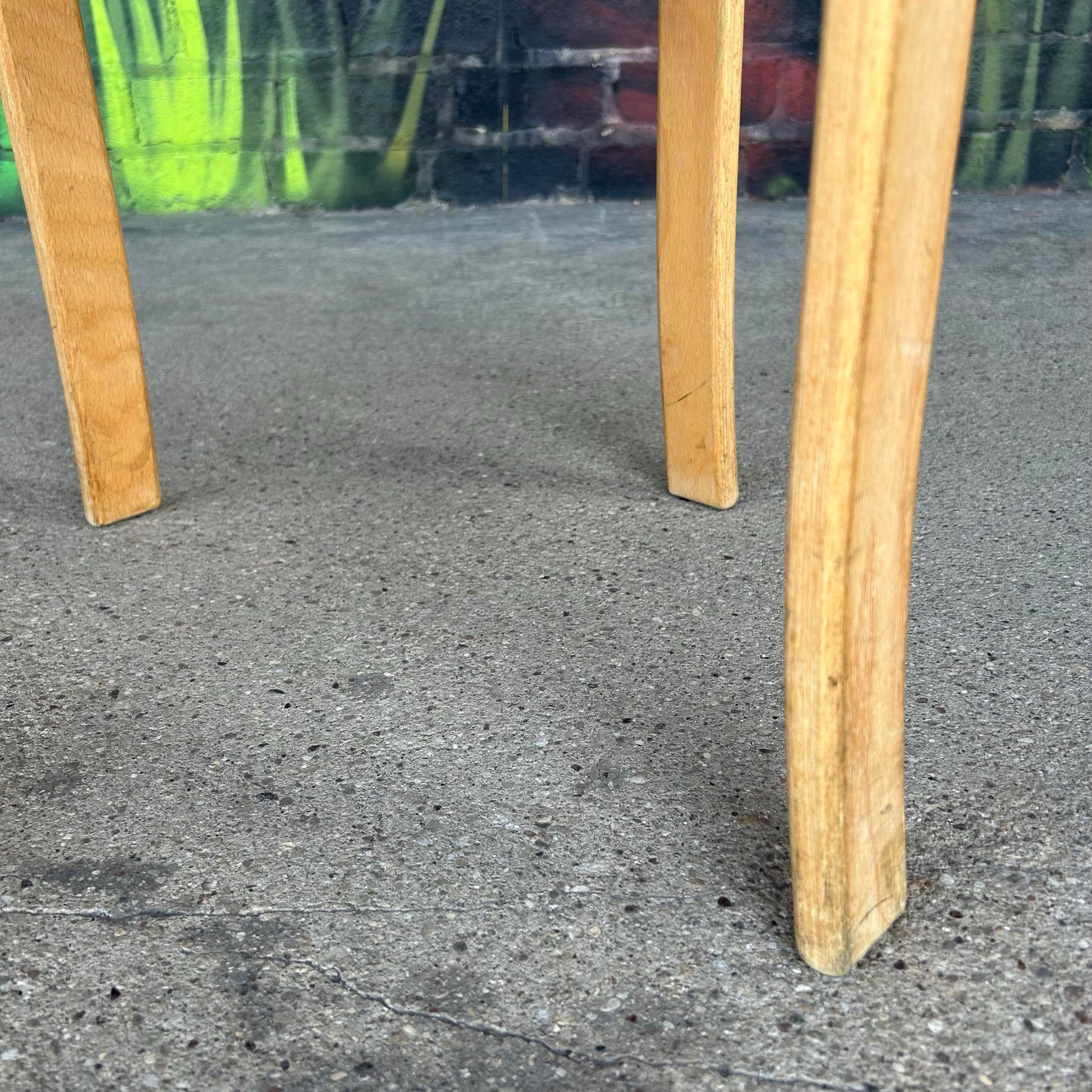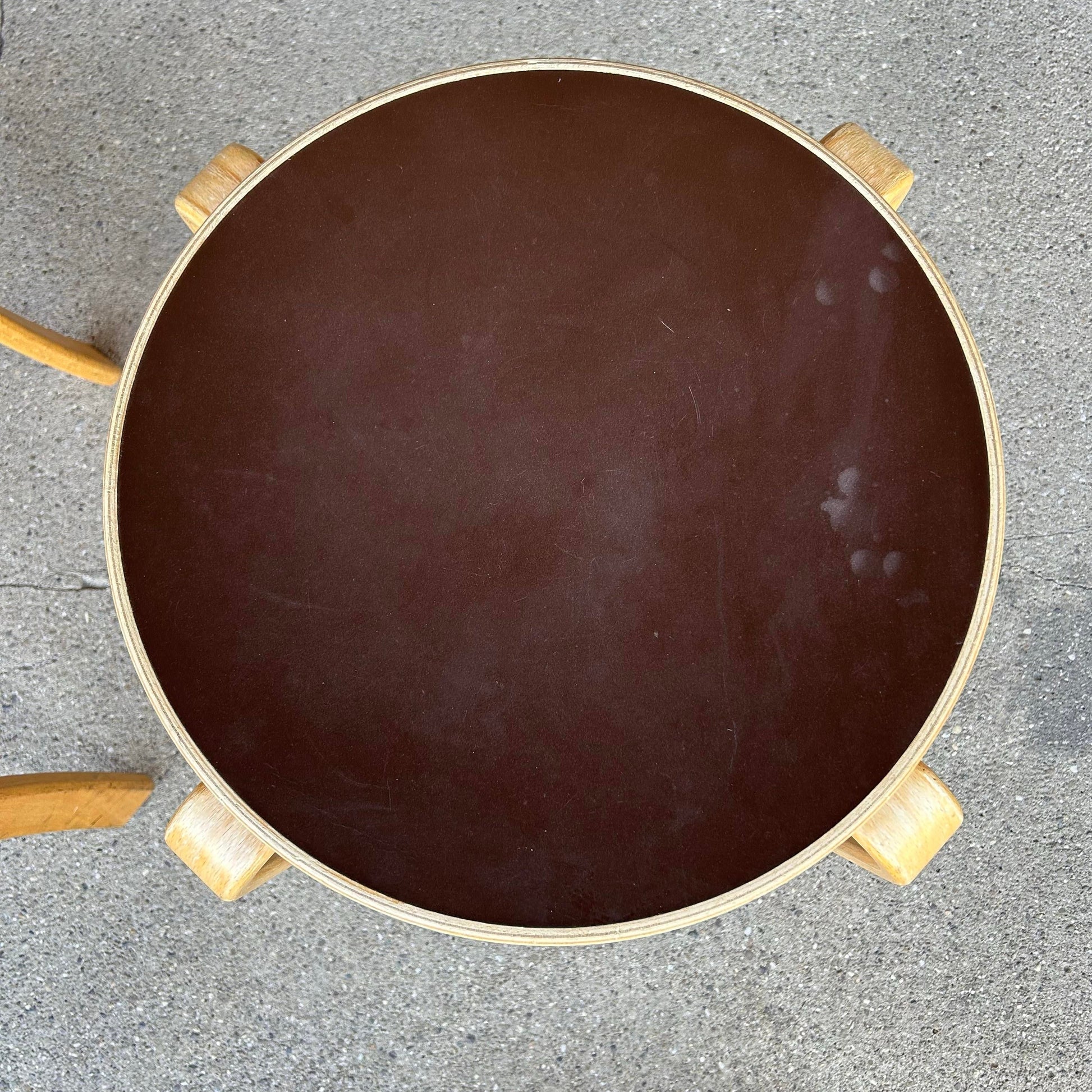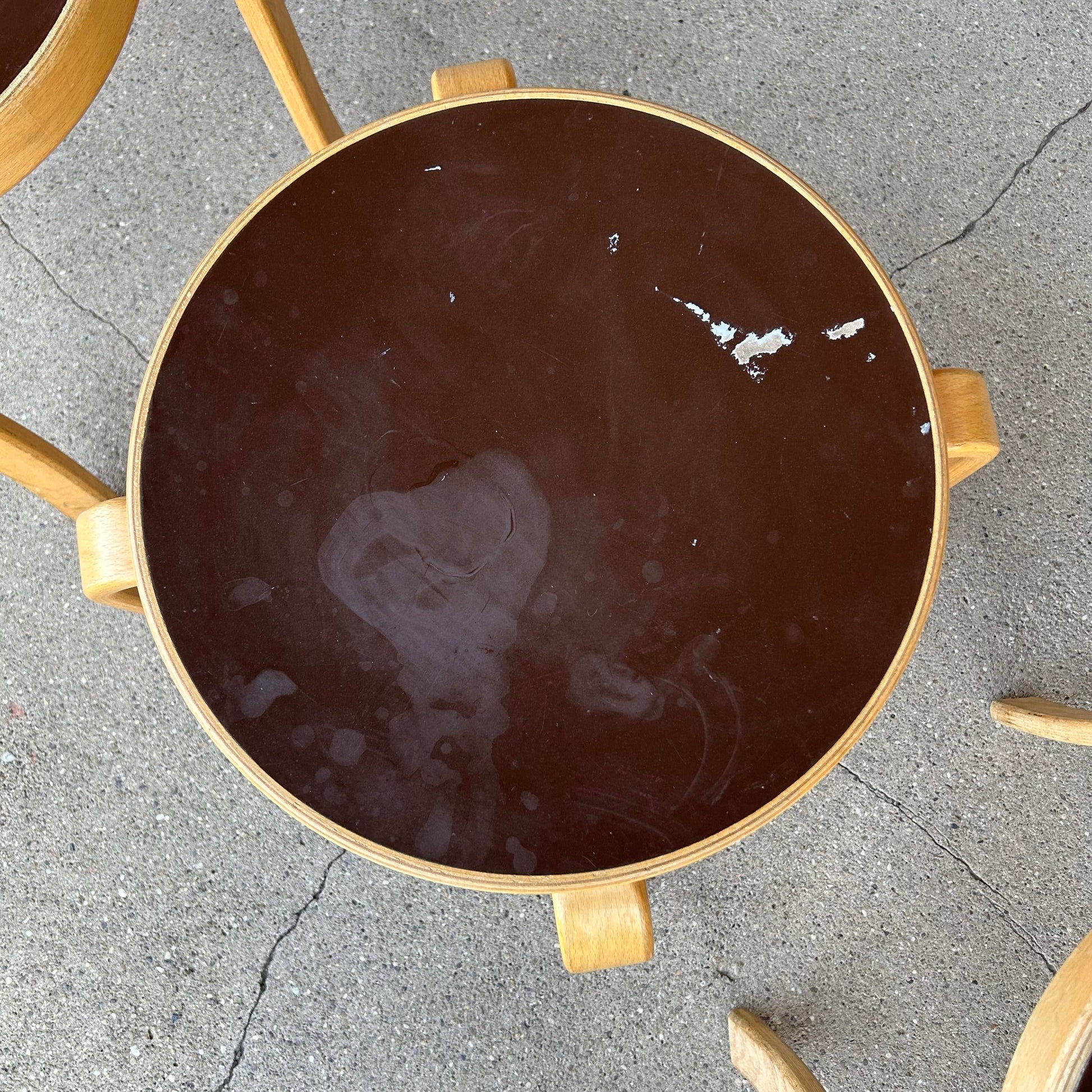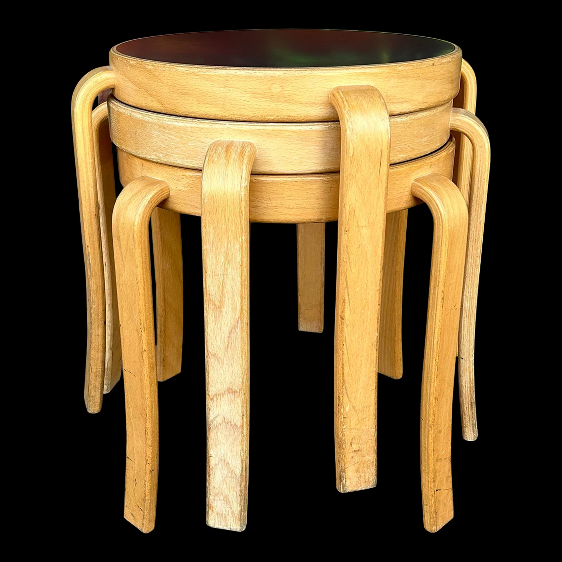 The set of three stools are versatile and can be used in a variety of scenarios. They can be used as stools or side tables and are also stackable. The Bentwood and lightweight feature is a nod to its minimal danish design. We purchased the stools out of TRW, which is no longer in business. They have the makers mark on the bottom side M. O. Wood laminates by Rudd international made in Washington DC via Denmark.