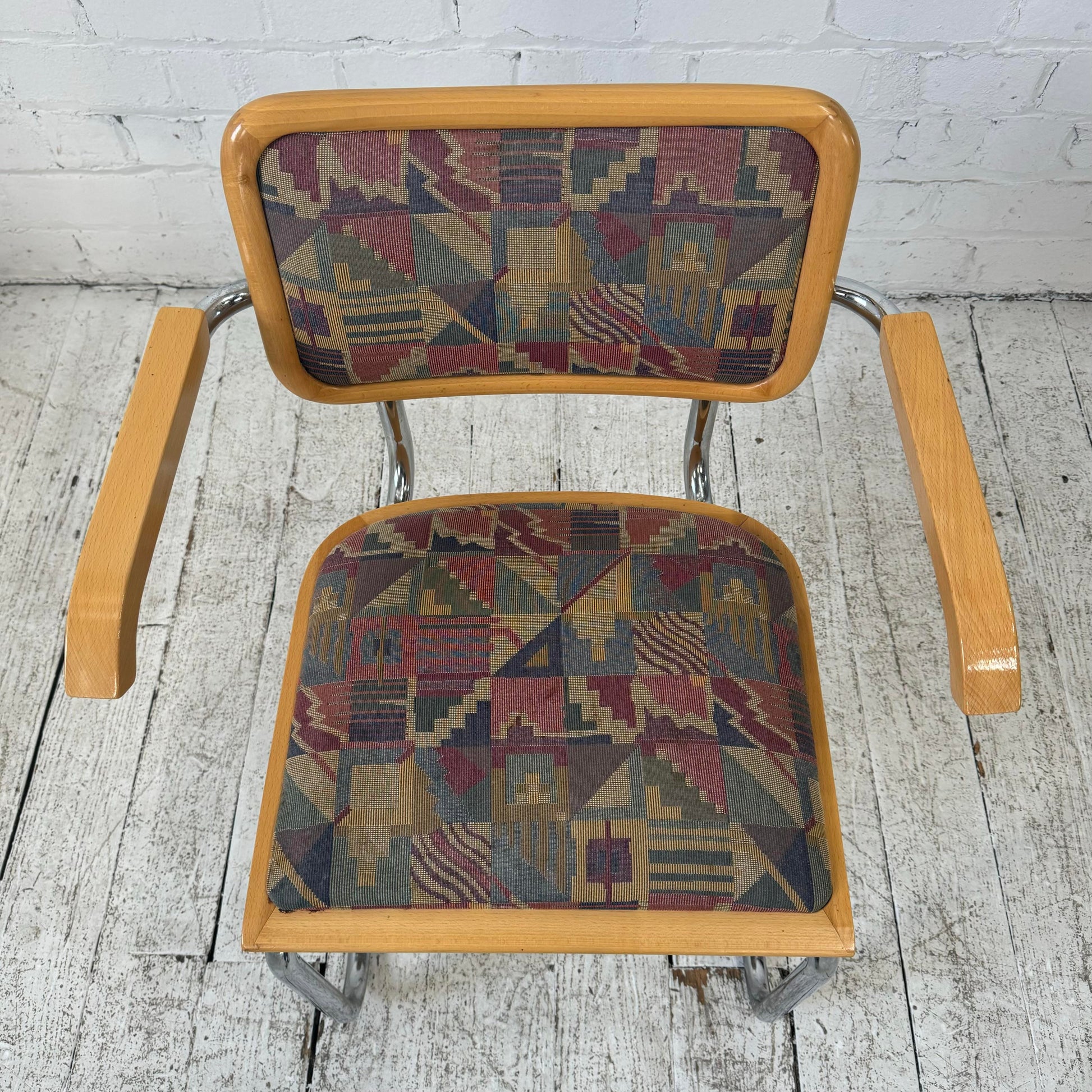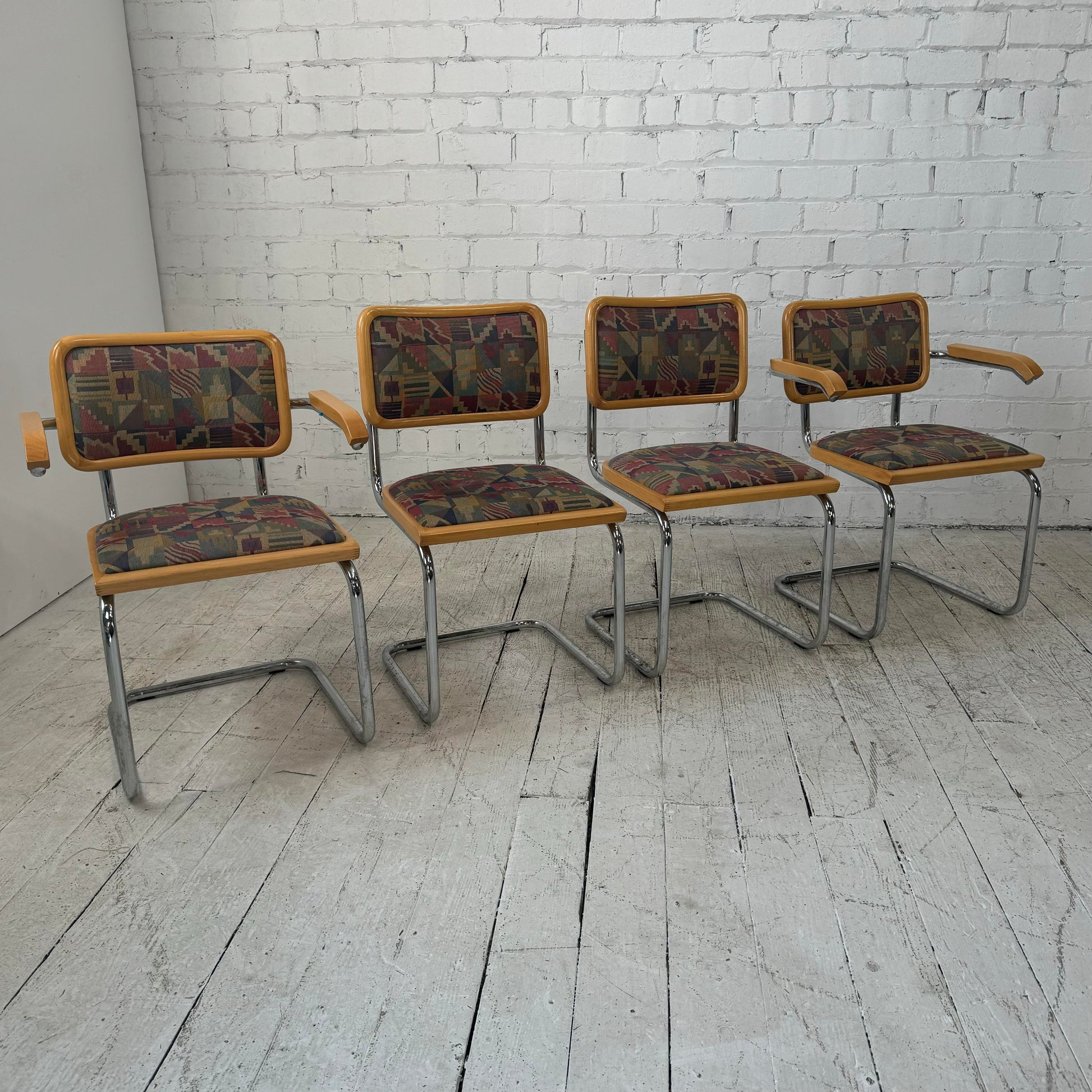 Marcel Breuer Cesca Arm Chairs Set of four cantilever dining chairs marked “Made in Italy”. These chairs are a classic design with a tubular chrome body and a blonde wood frame. These particular chairs have a bright and colorful fabric featuring colors of pink, blue, green, purple, gold, and beige. There are two arm chairs and two side chairs.