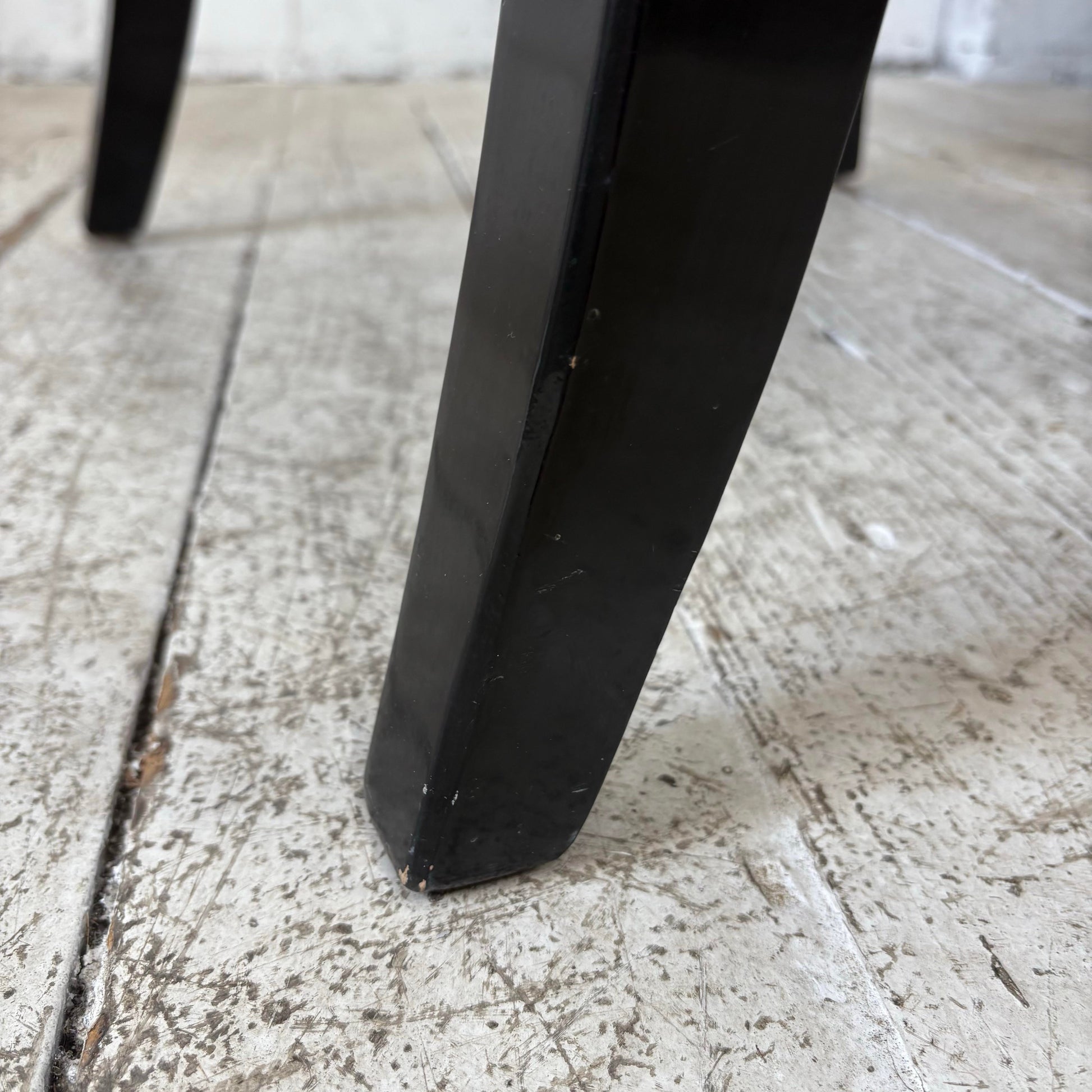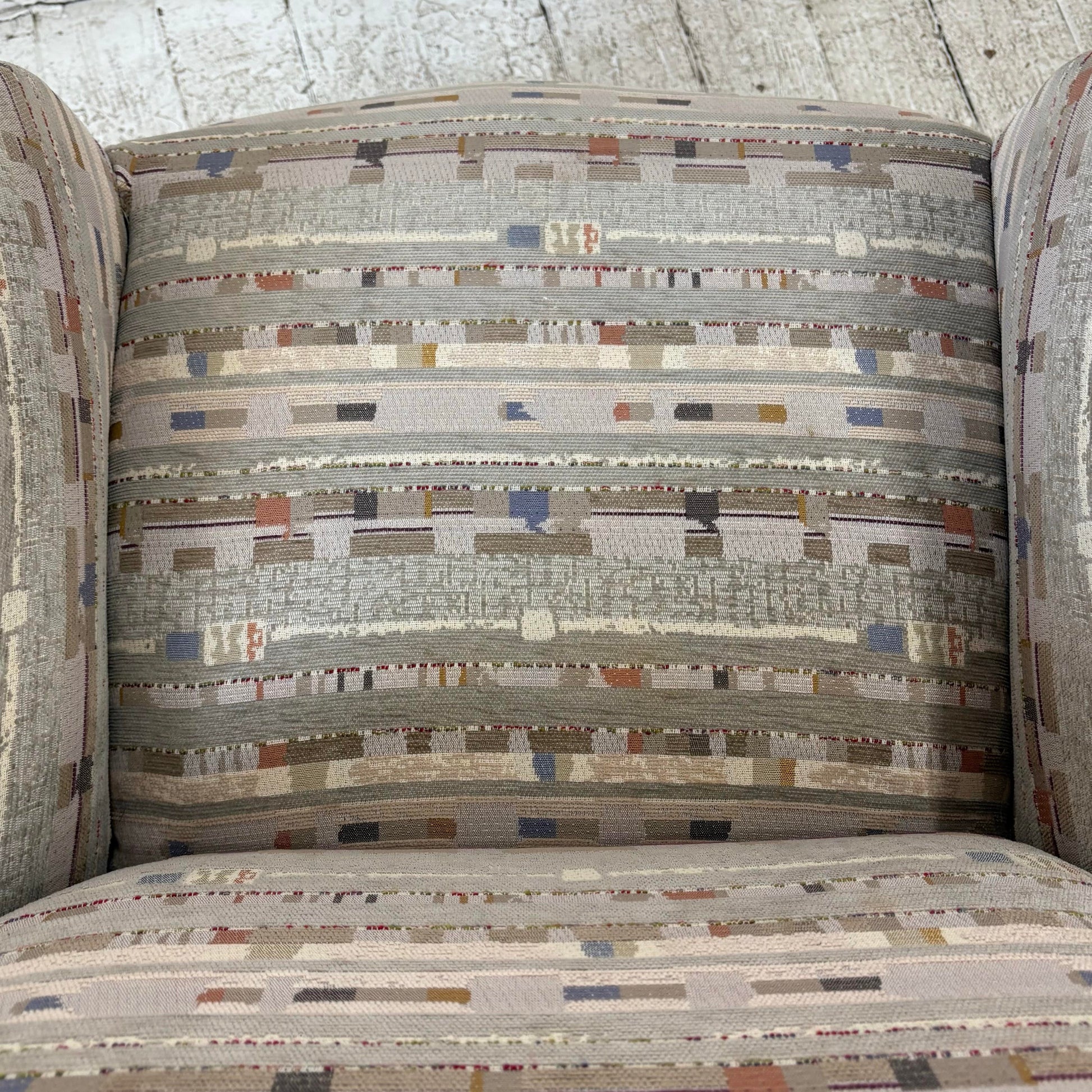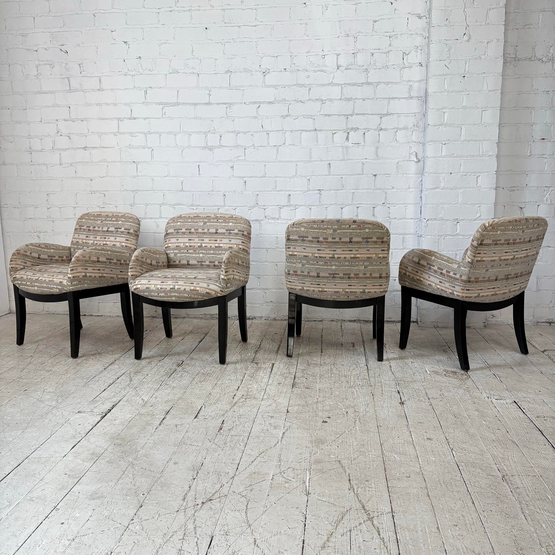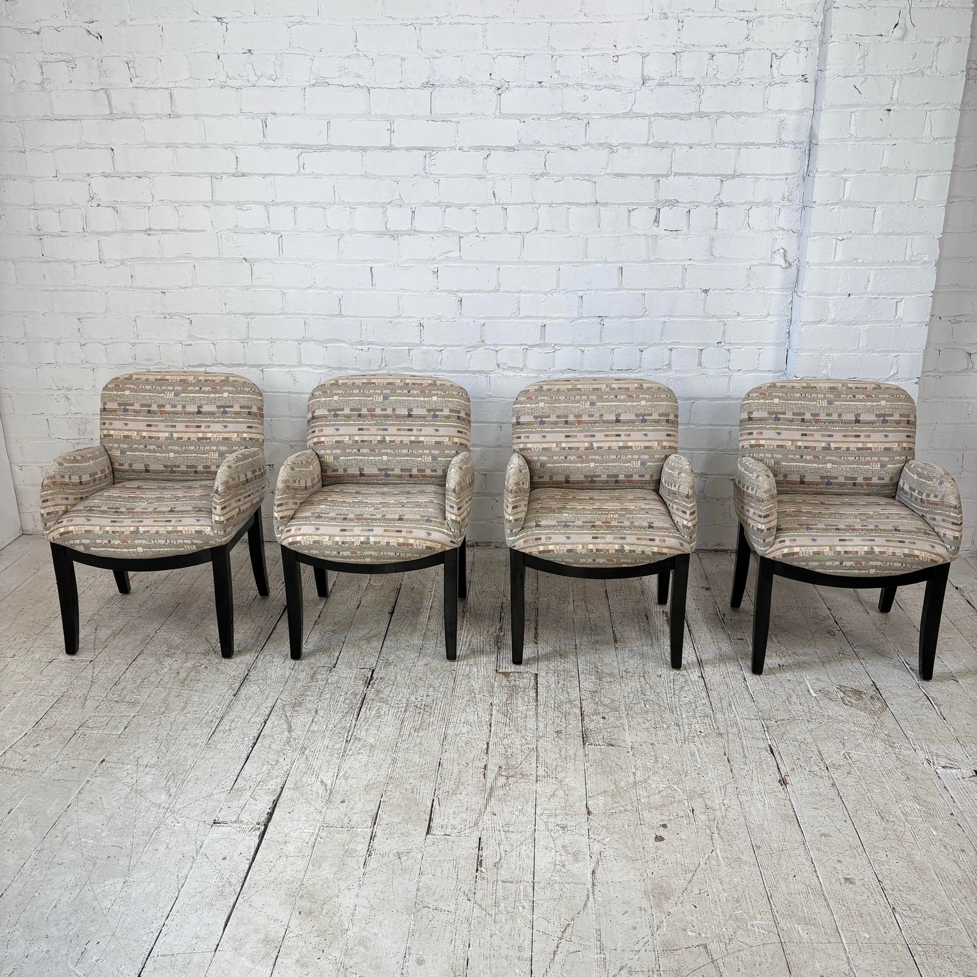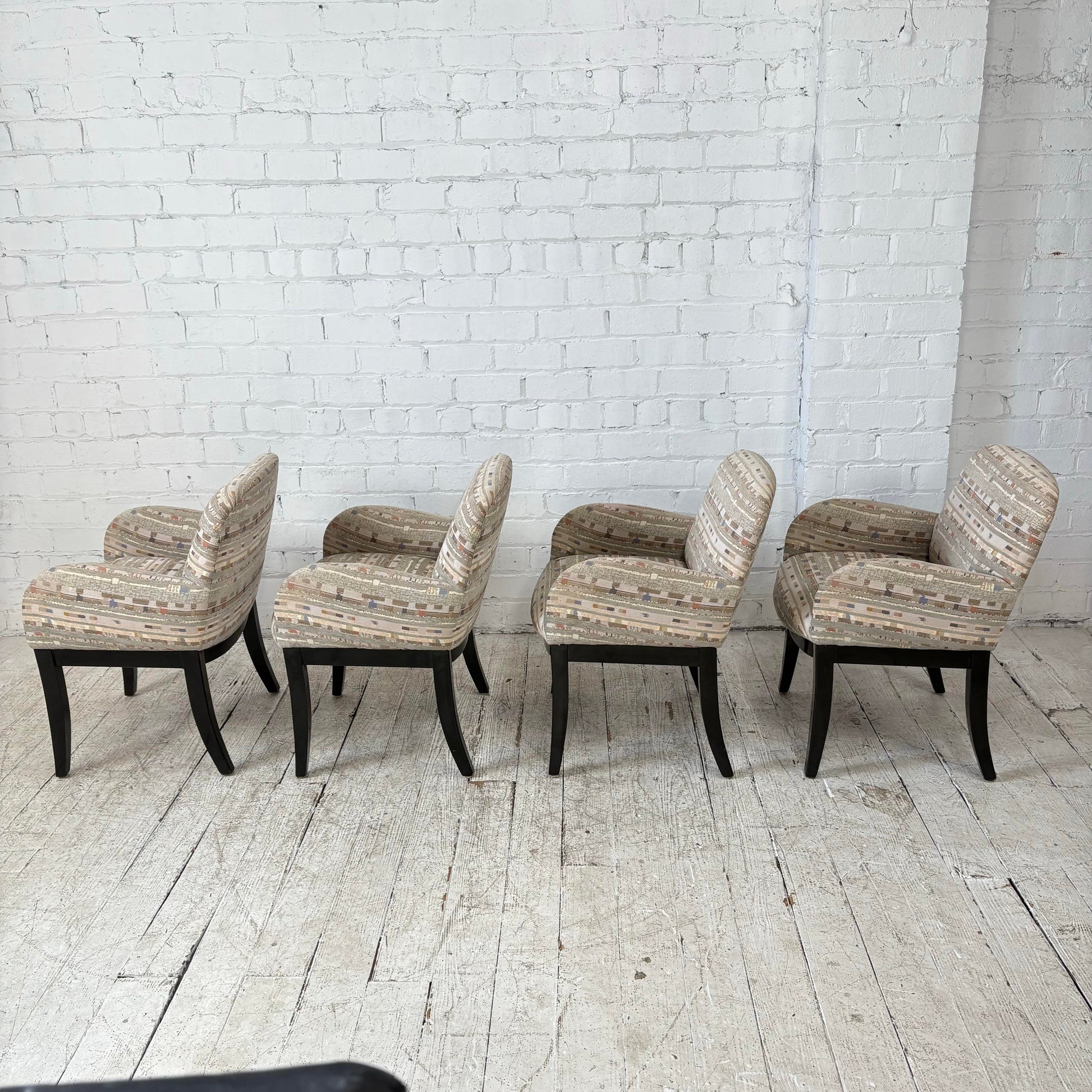 Set of 4 dining chairs by Milo Baughman. These chairs are currently covered in a patterned fabric that is not original to the design, and makers mark has been removed or covered.