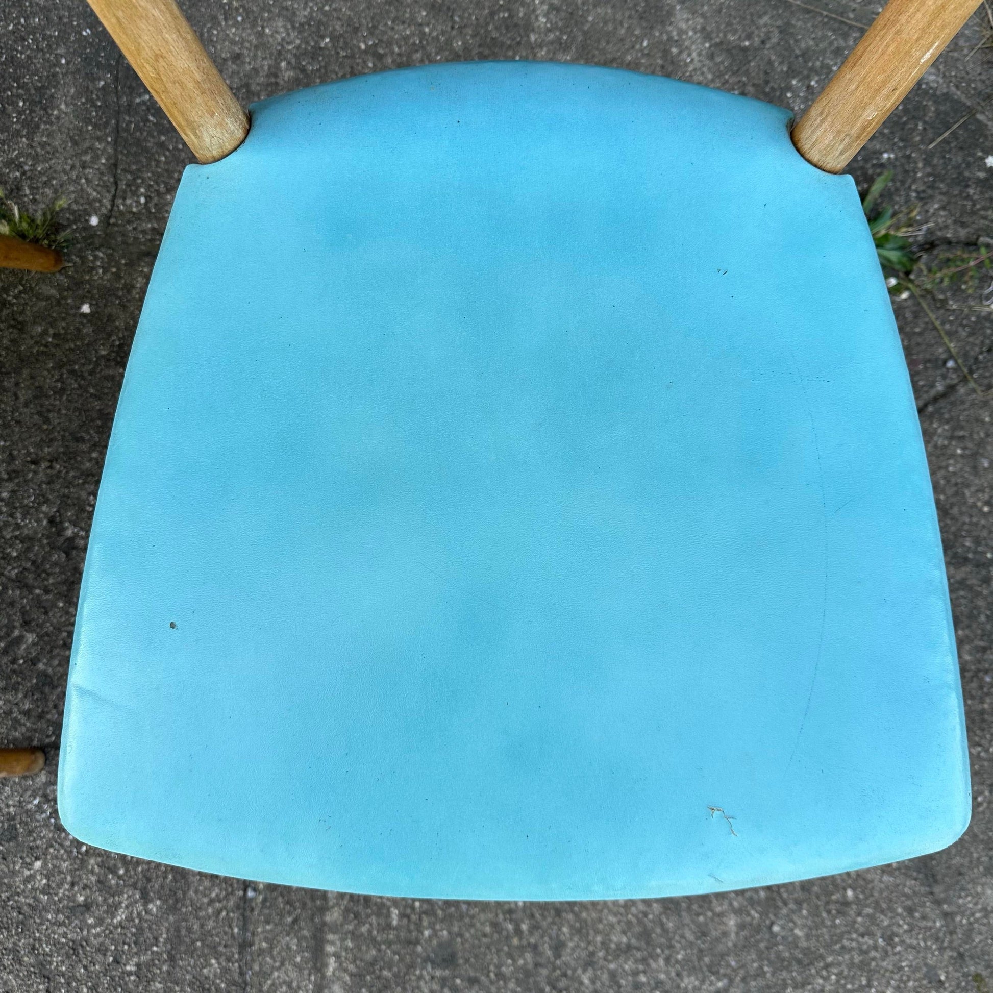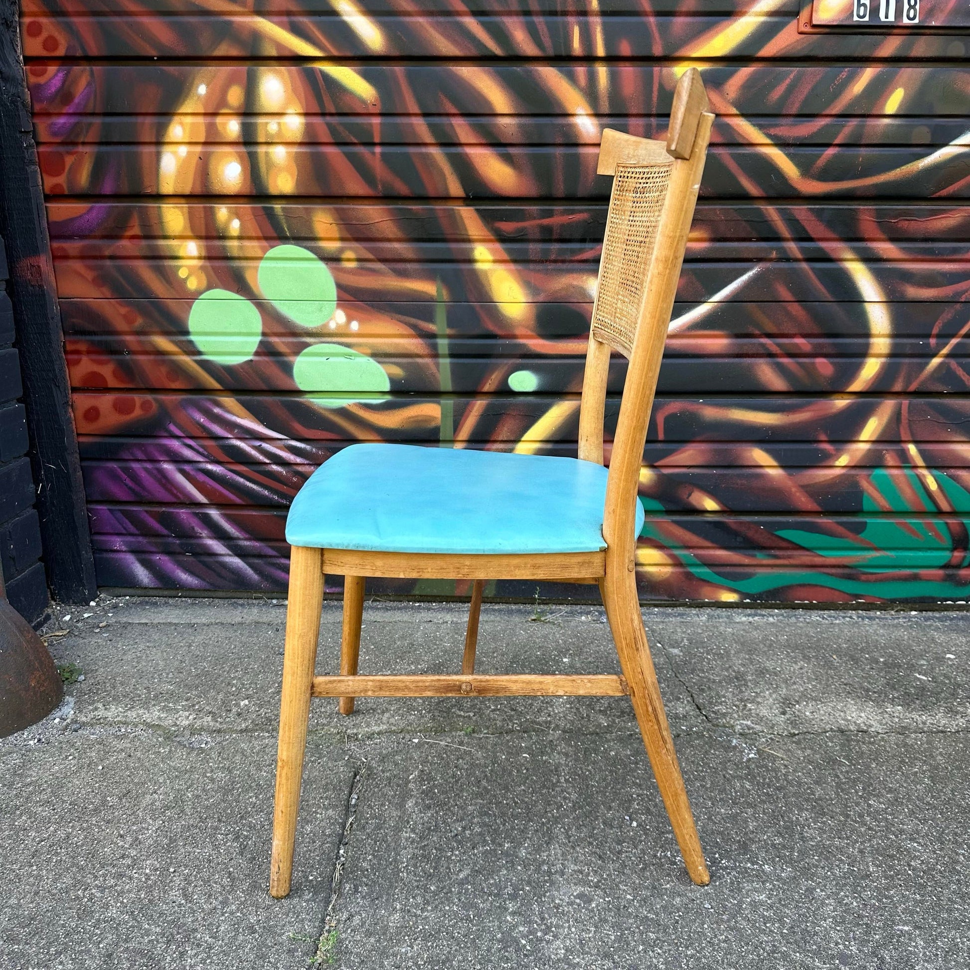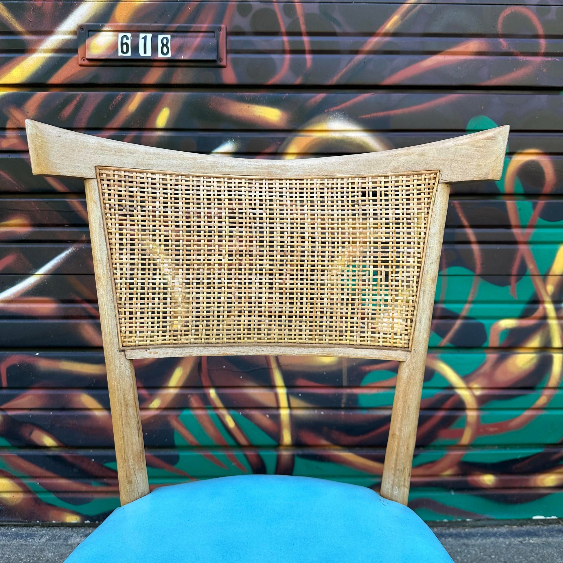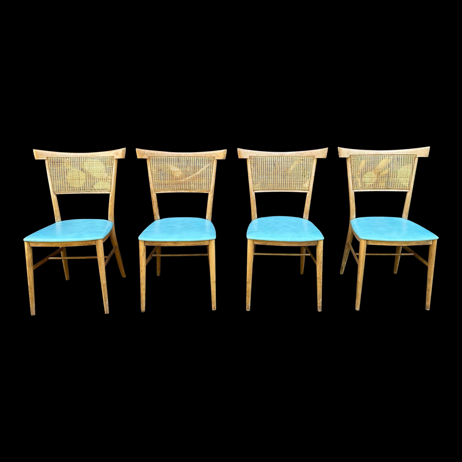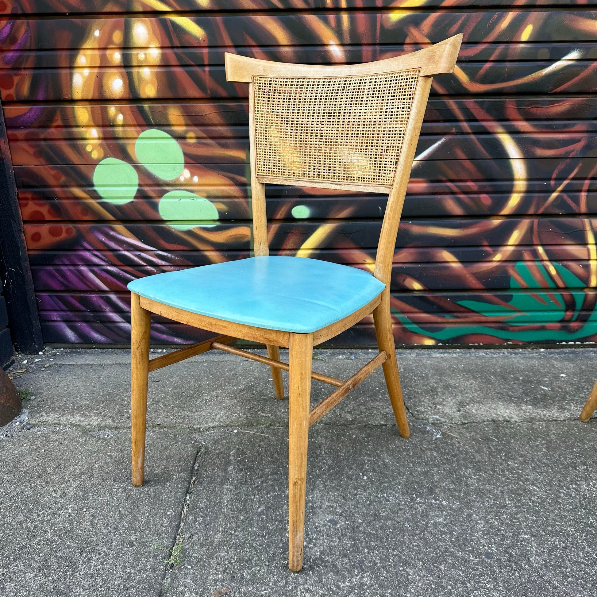 Paul McCobb for planner group dining chairs Planner Group with Caned Backrests and maple wood base. The seats are covered in a turquoise vinyl seat. The chairs are unmarked.