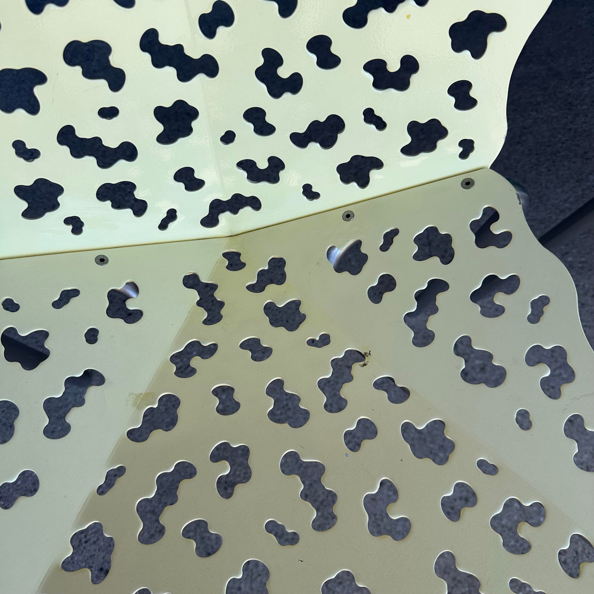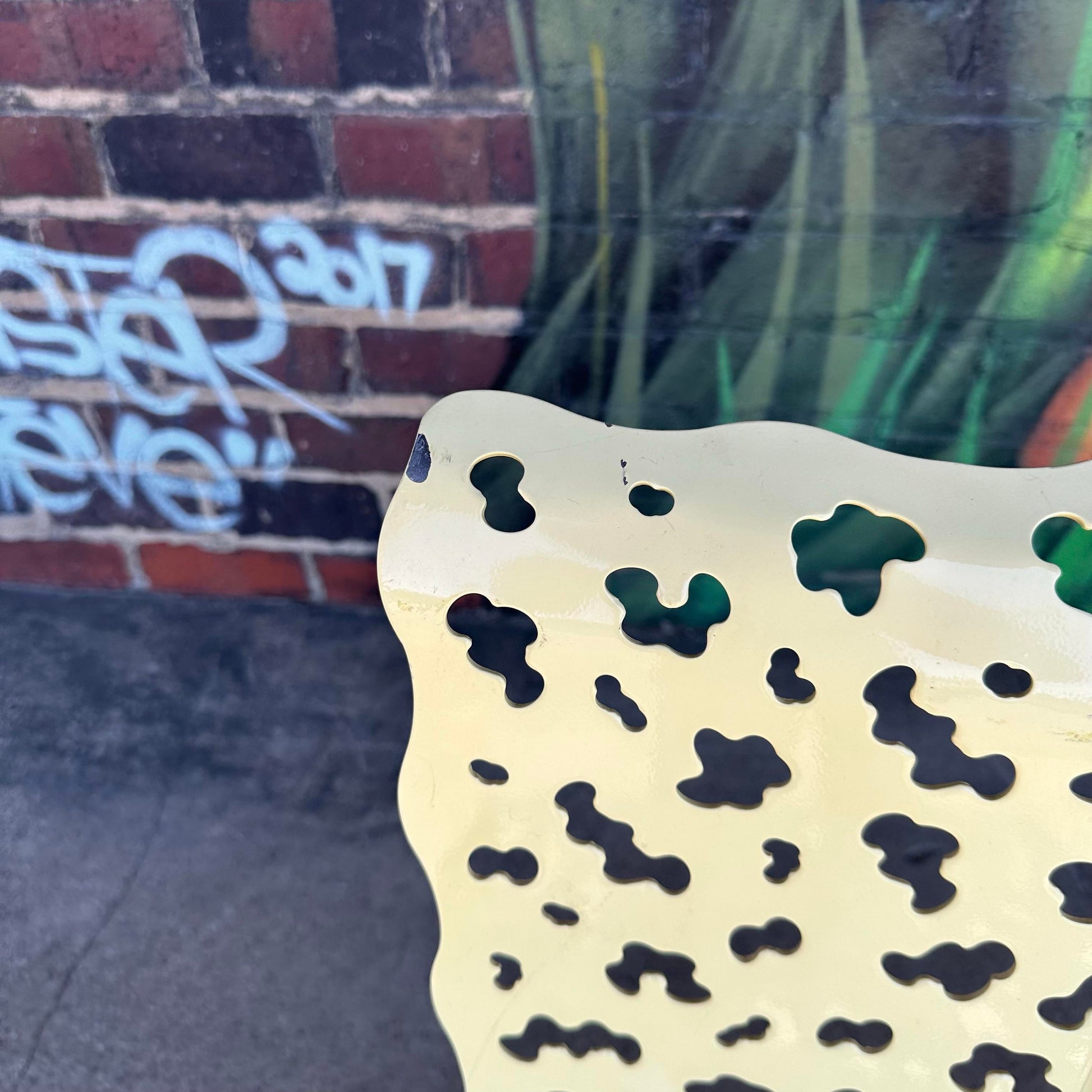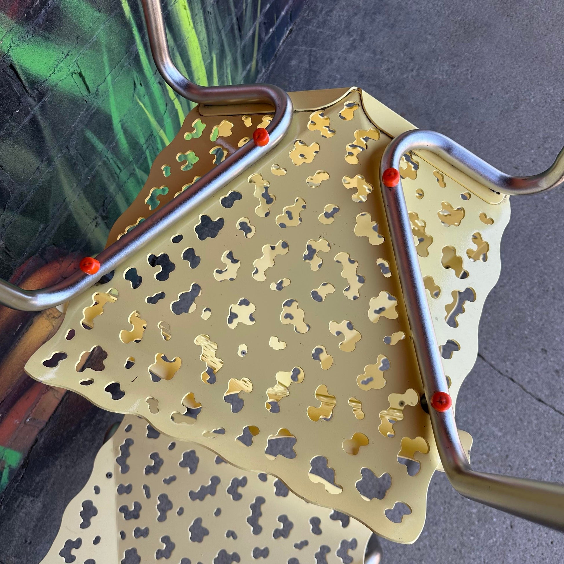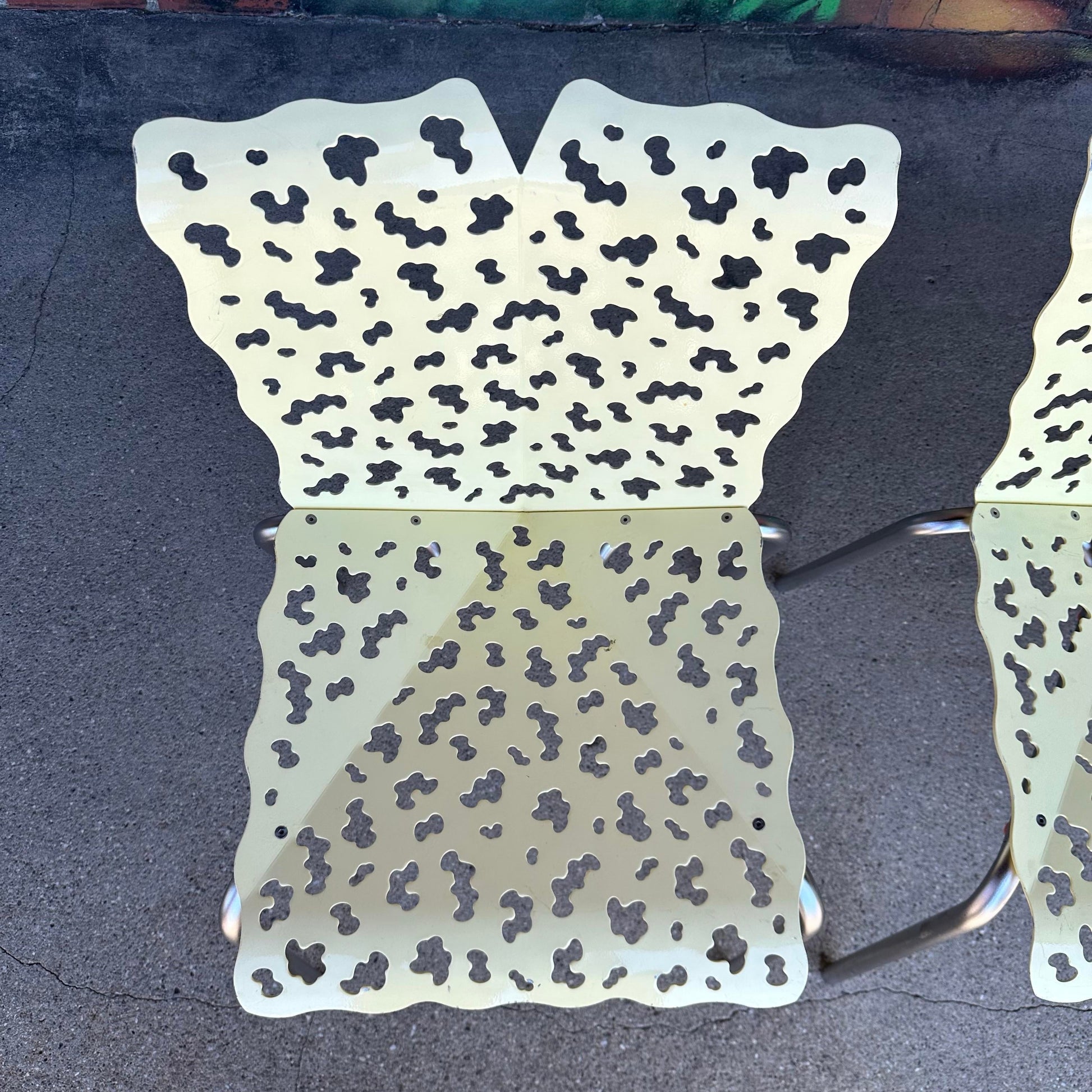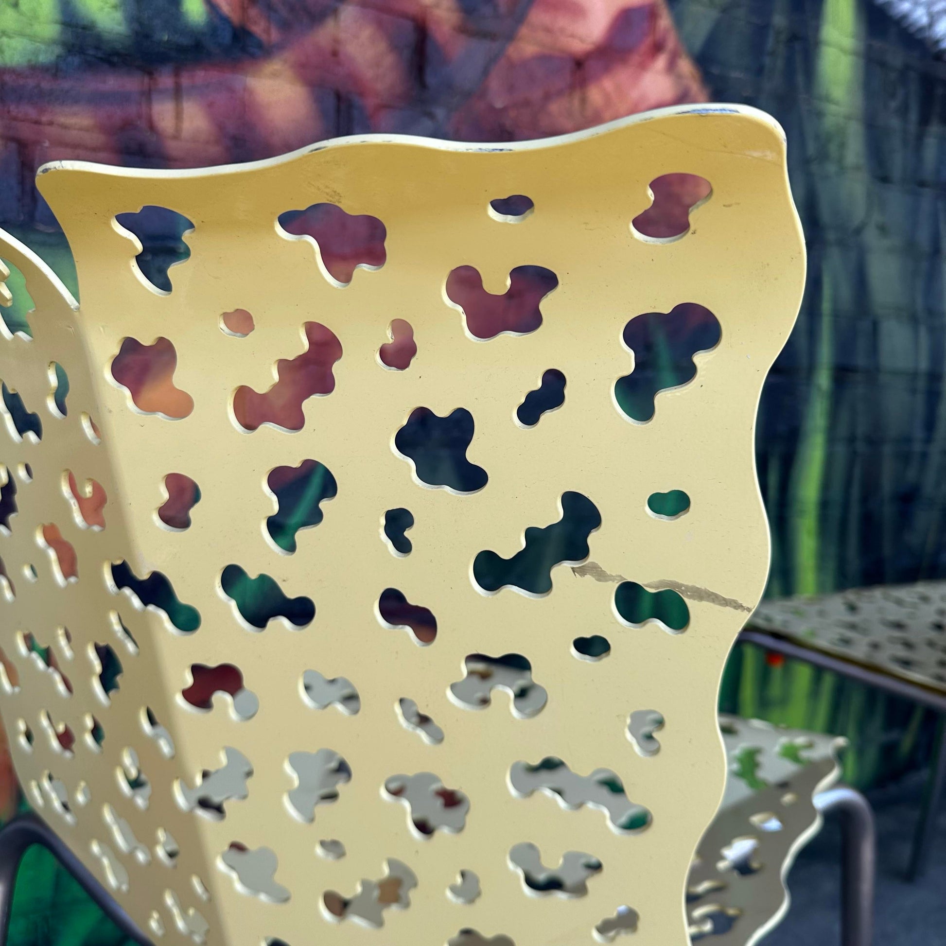 This vintage contemporary cutout chair, designed by Richard Schultz, features a sleek, modern design with a unique cutout pattern. A stylish addition to any contemporary space. The chairs are made of metal cutout seat and back and aluminum legs.