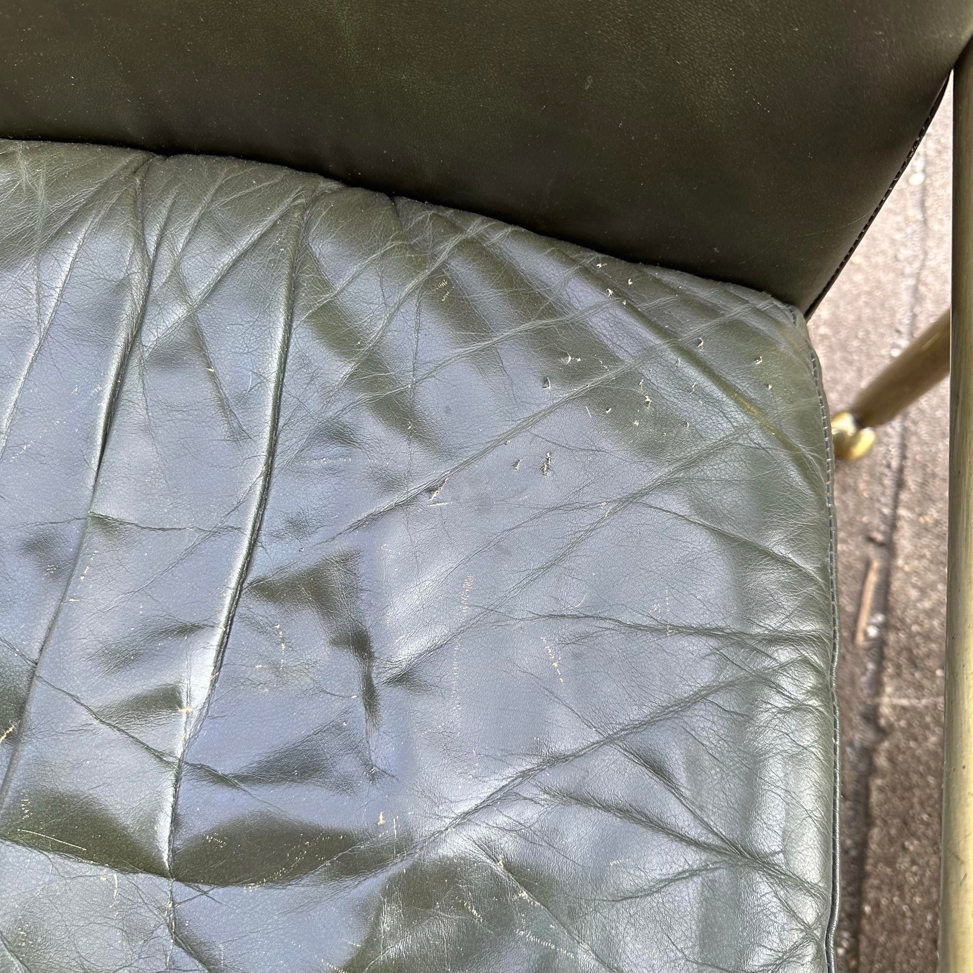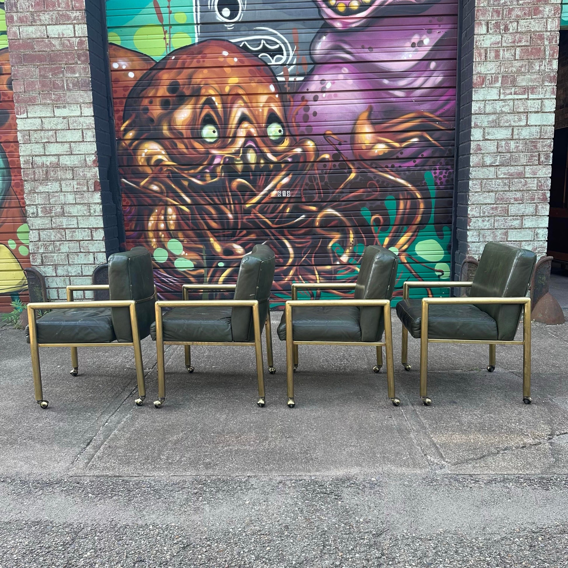 Set of 4 brass chairs. This set has casters and is currently covered in green leather. These could be used in the office or as rolling dining chairs.