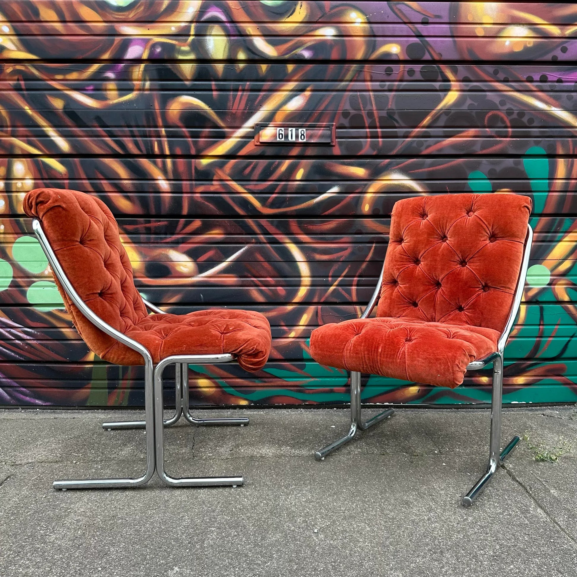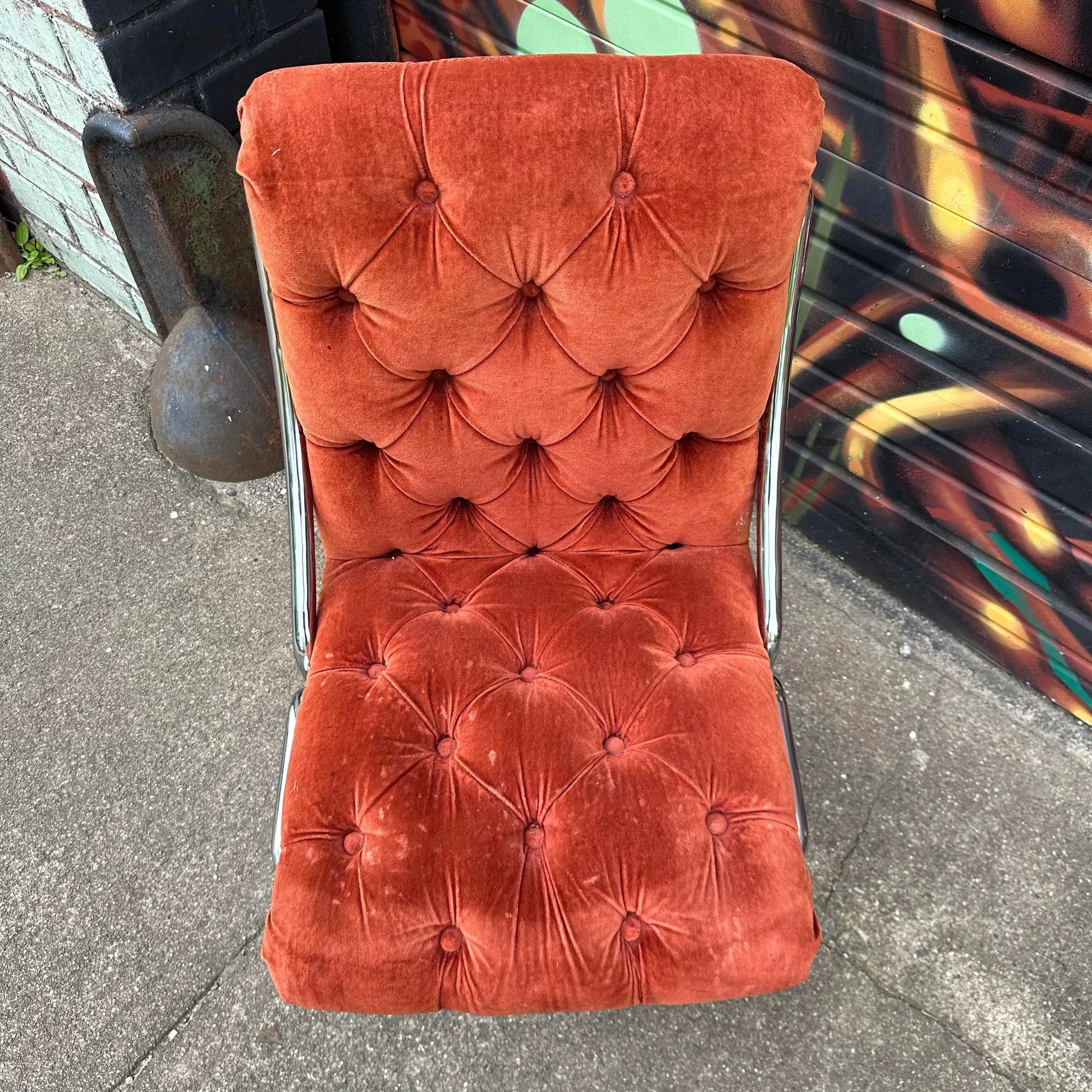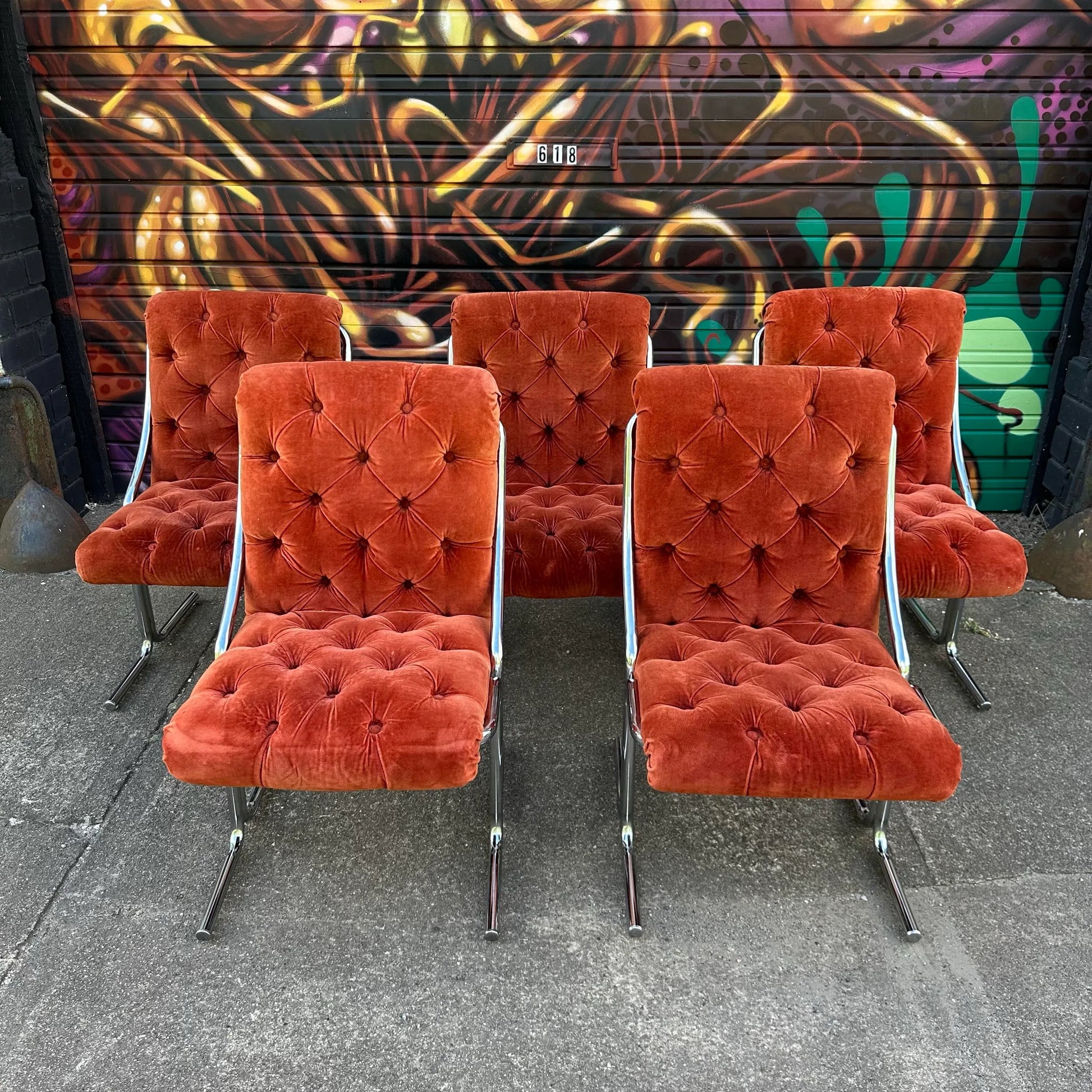 Set of 5 chrome base dining chairs with burnt orange tufted velvet seats. Labeled ChroModern