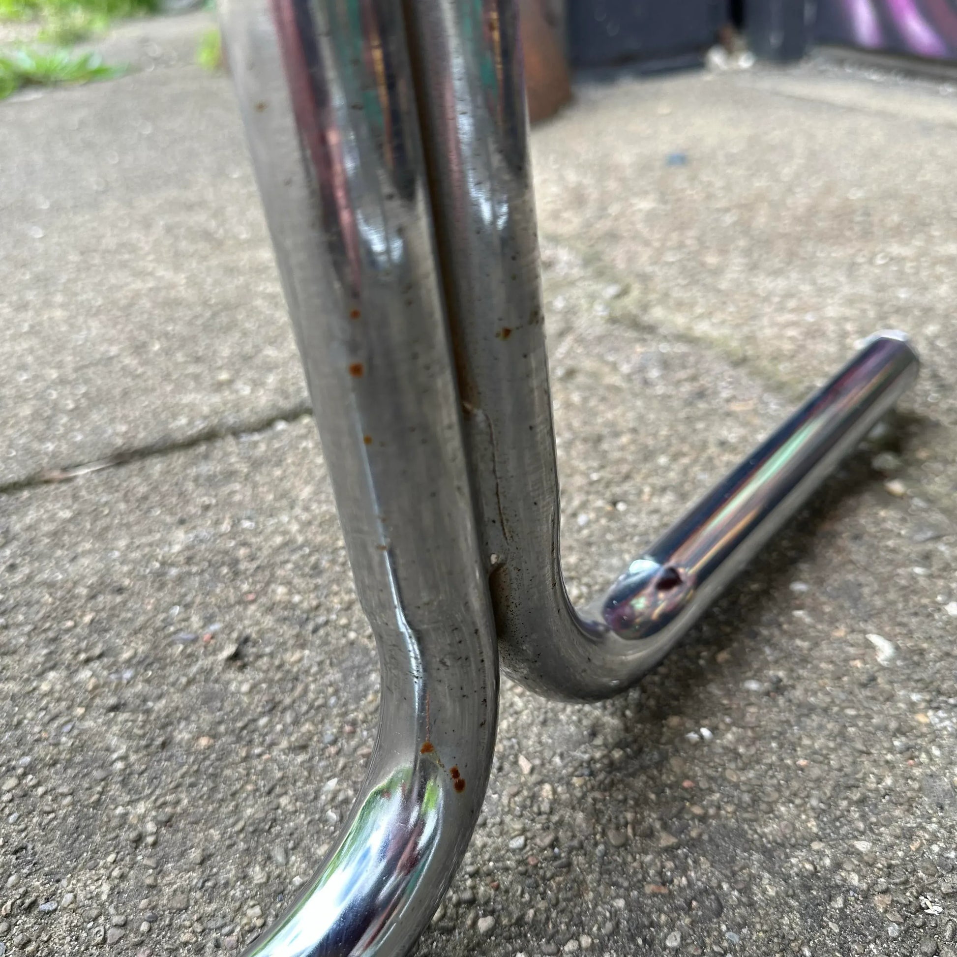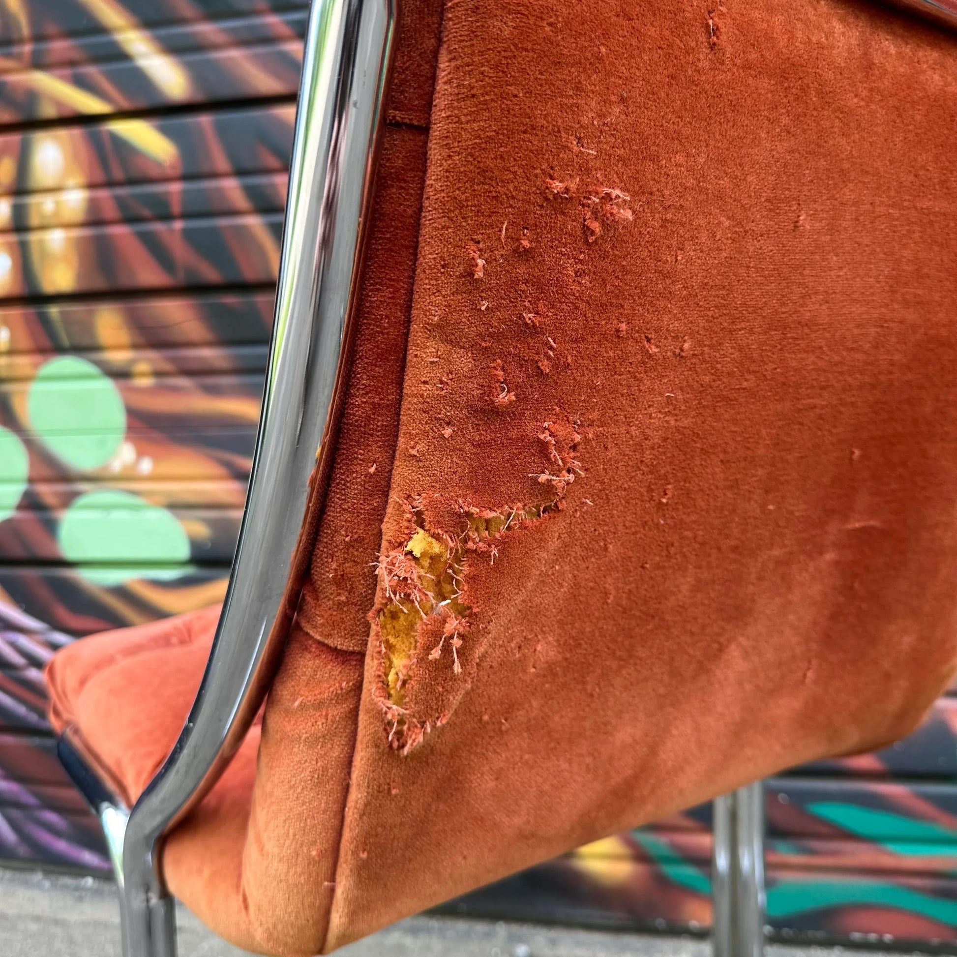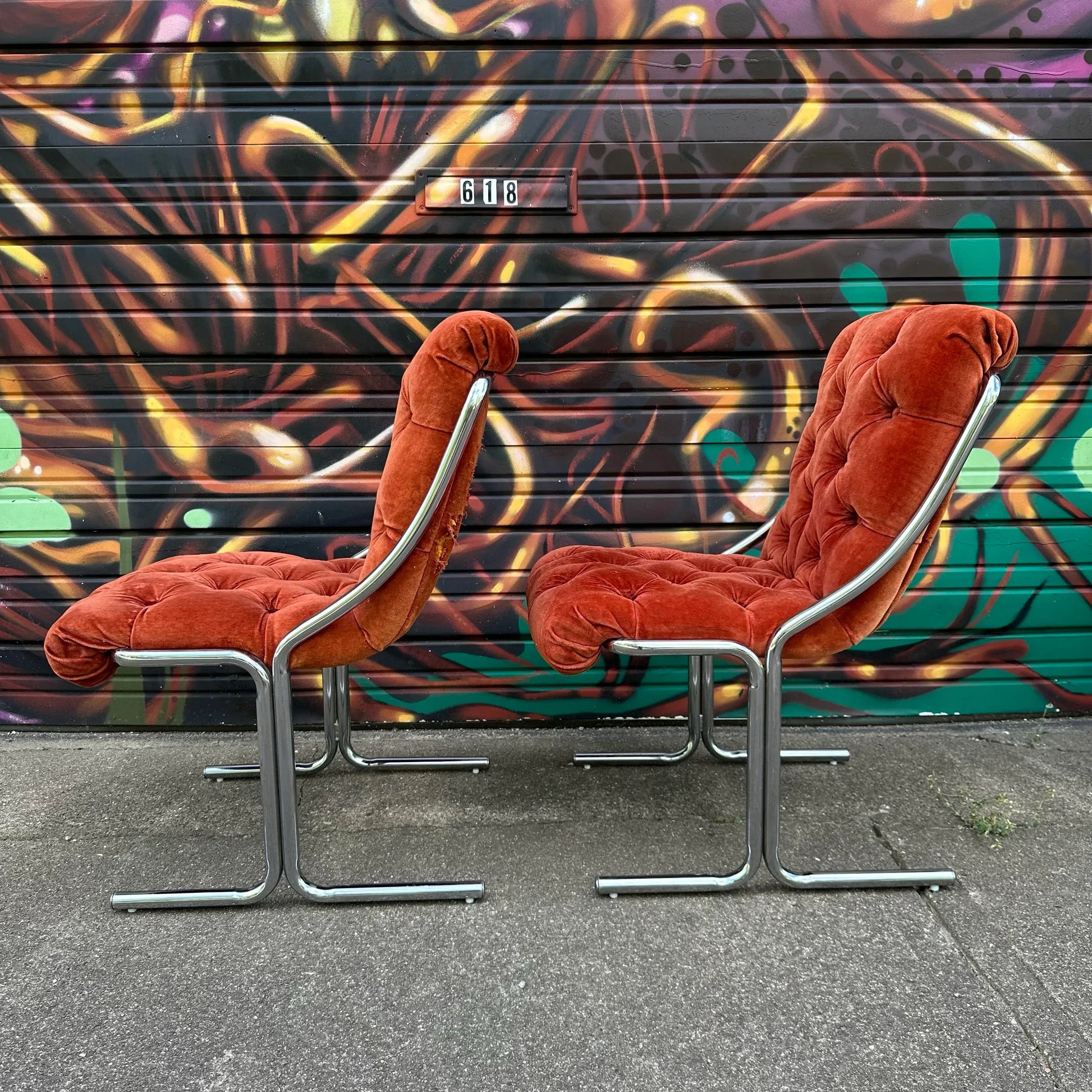 Set of 5 chrome base dining chairs with burnt orange tufted velvet seats. Labeled ChroModern
