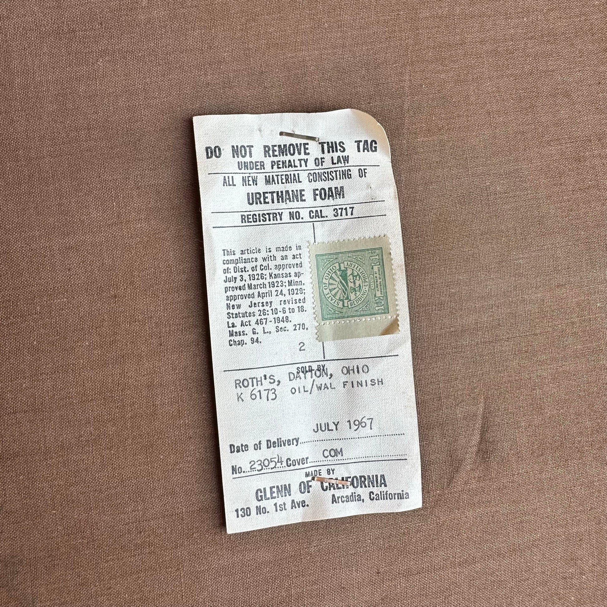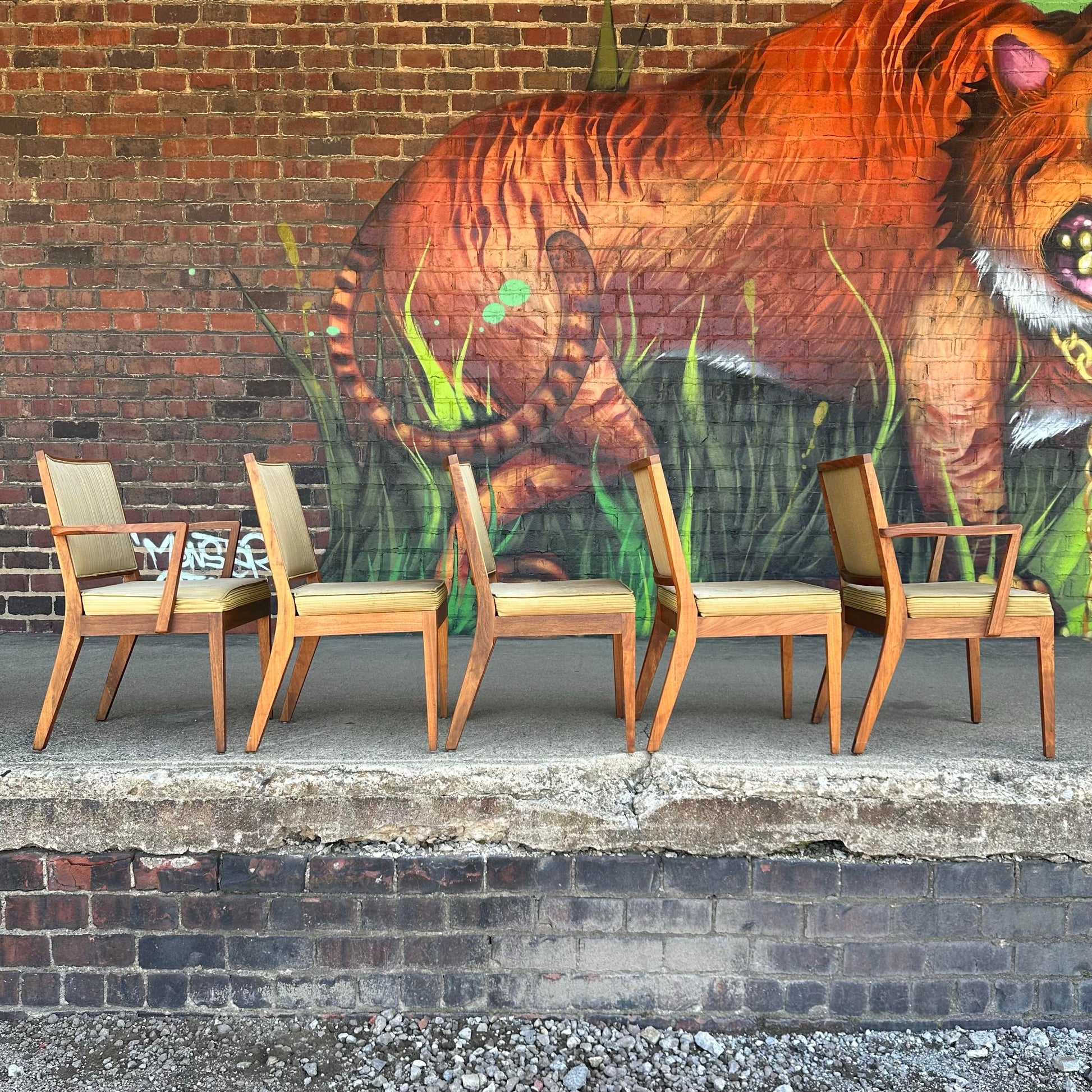 Set of 5 dining chairs by Glenn of California. Beautiful walnut framing with original upholstered seats. Designed by Stewart MacDougall. This set features two armchairs and three side chairs. There is a makers mark on the bottom of the seat. *Measurements for the armchair in the listing.