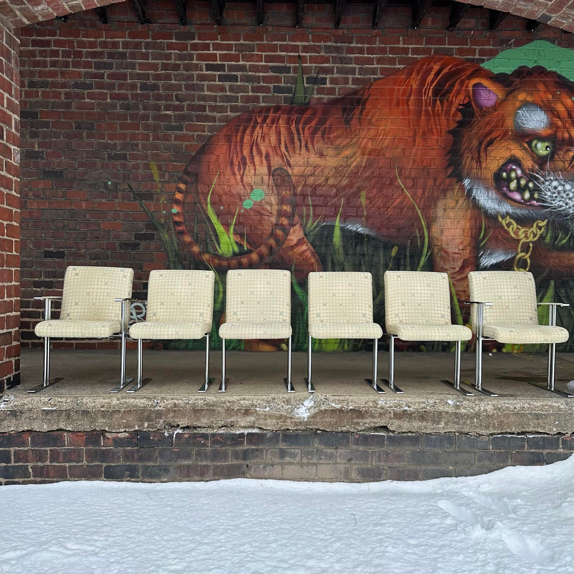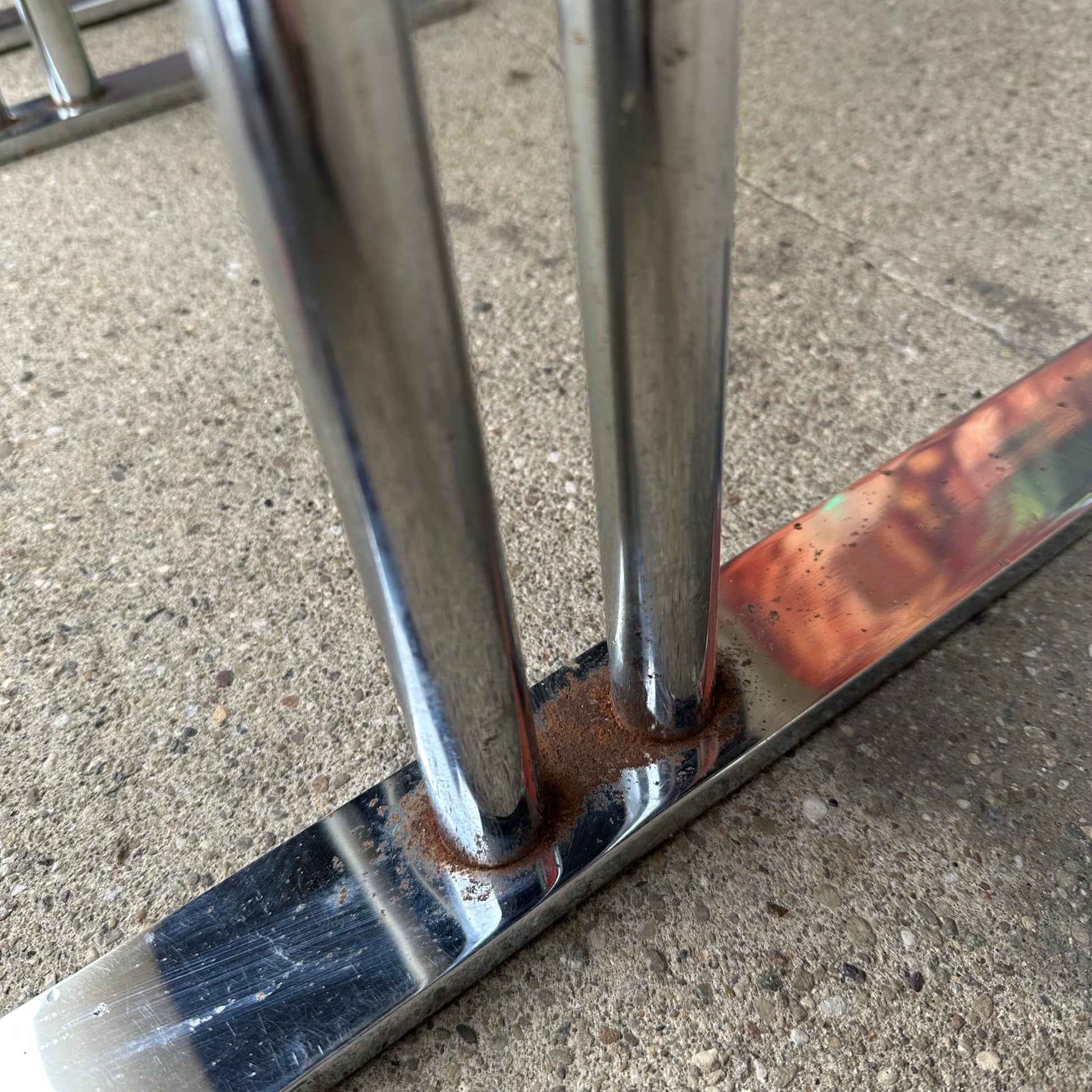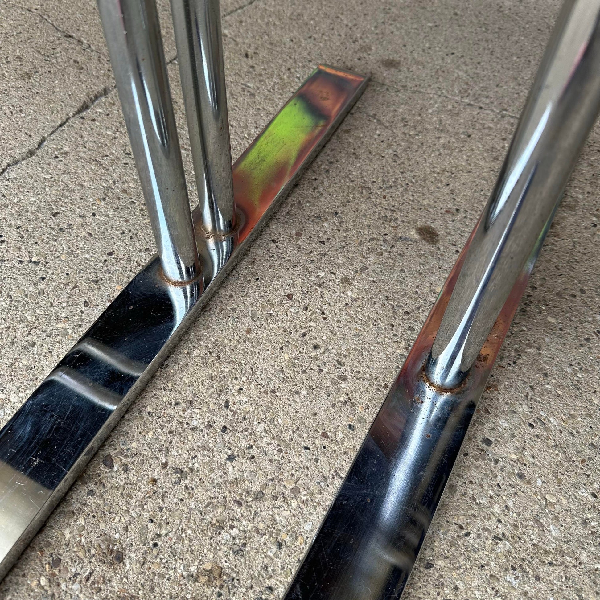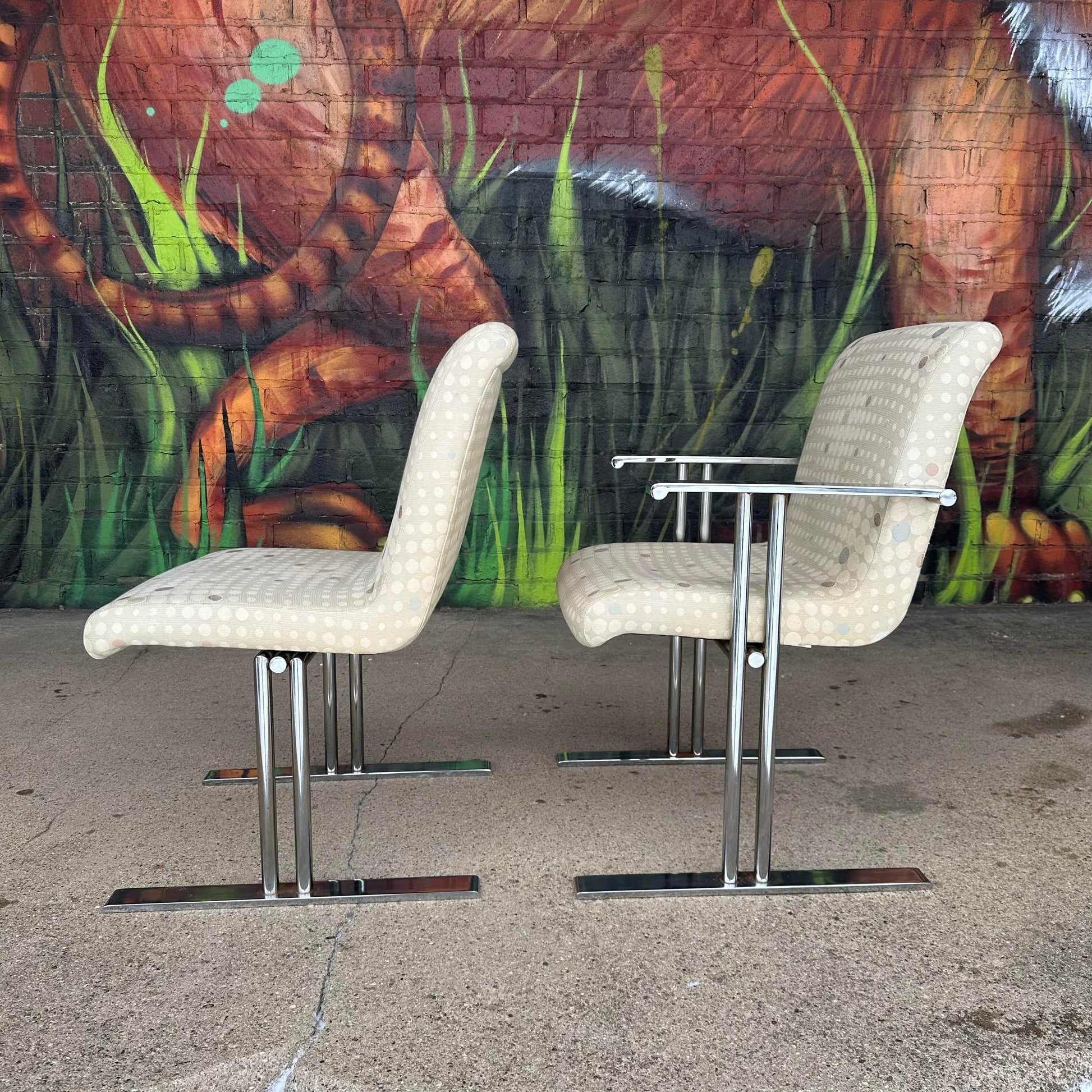 Mid century modern Set of 6 Directional Chrome Dining Chairs. This set of chairs includes 2 arm chairs and 4 side chairs. The chairs feature a square metal polished leg and arm design and a fully upholstered seat. The chairs have no makers mark.