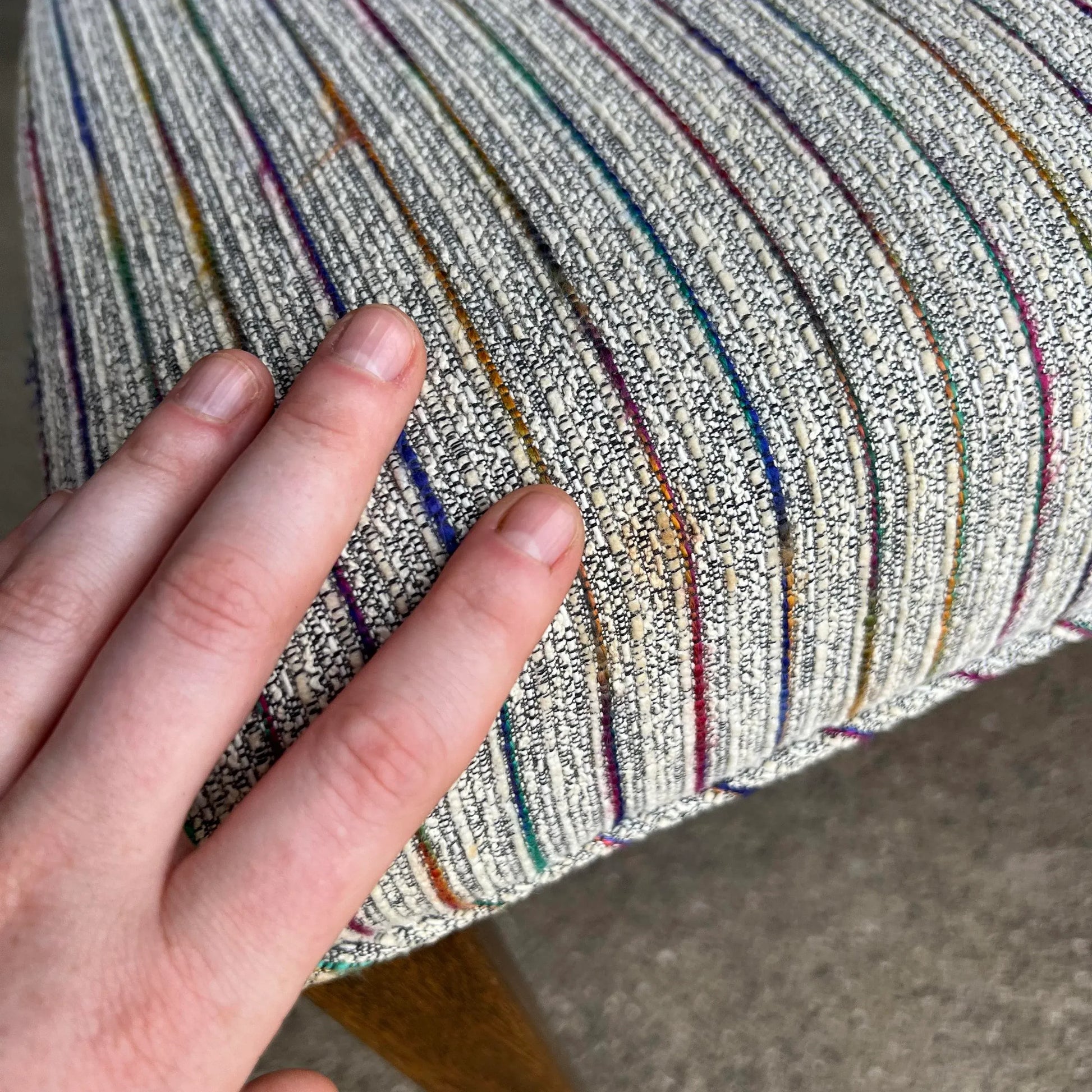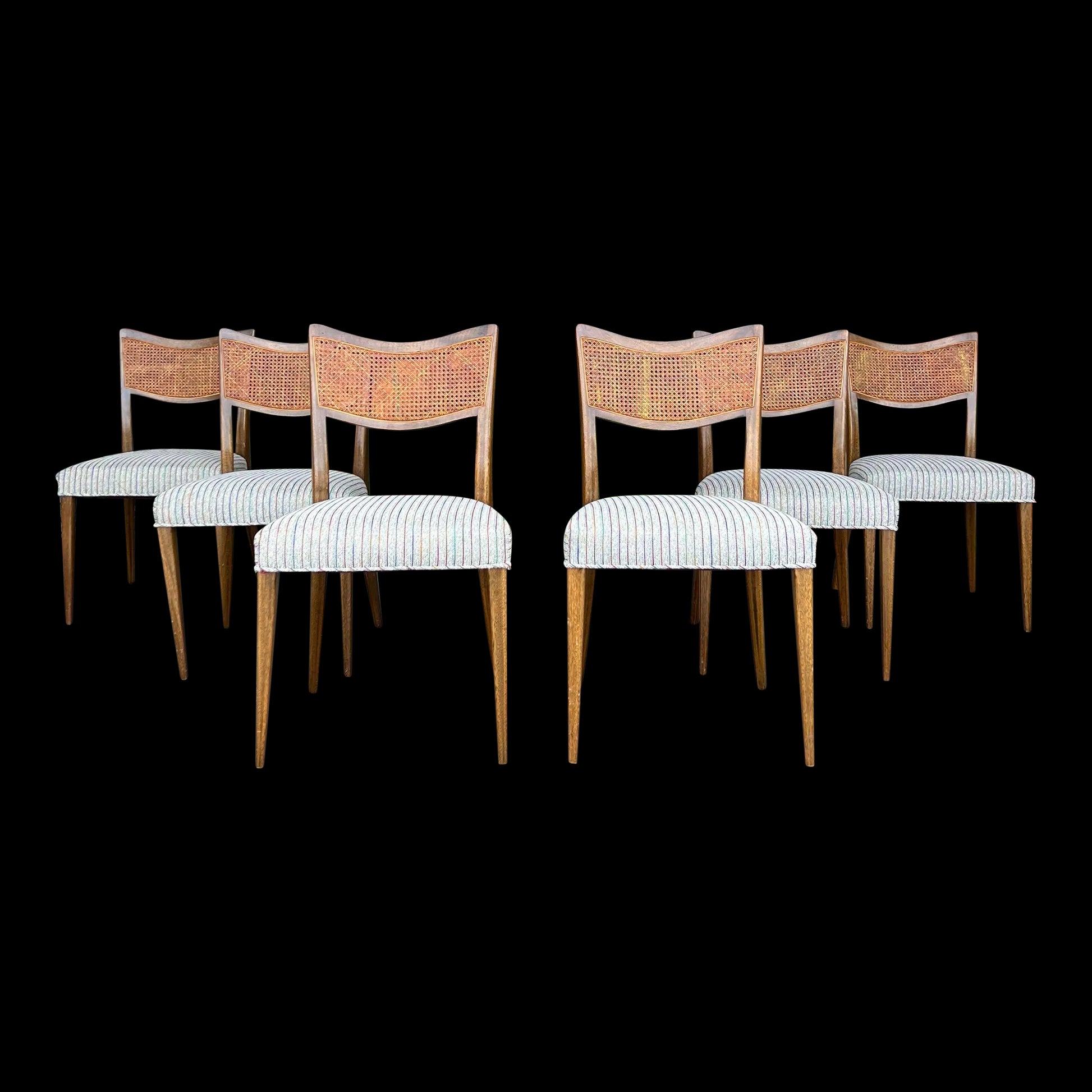 Set of 6 dining chairs designed by Harvey Probber circa 1960s. These chairs feature a mahogany frame, curved and caned back rests, and long tapered legs. The current upholstery boasts multicolored thin stripes on a textured white background with hints of black threading that add dimension to the fabric.