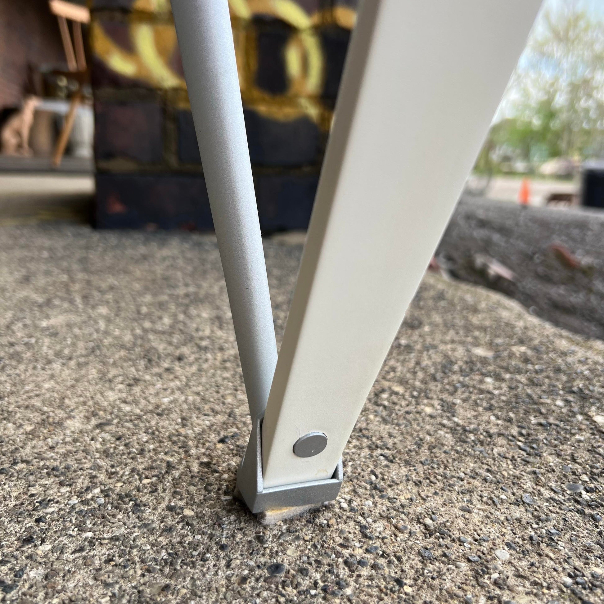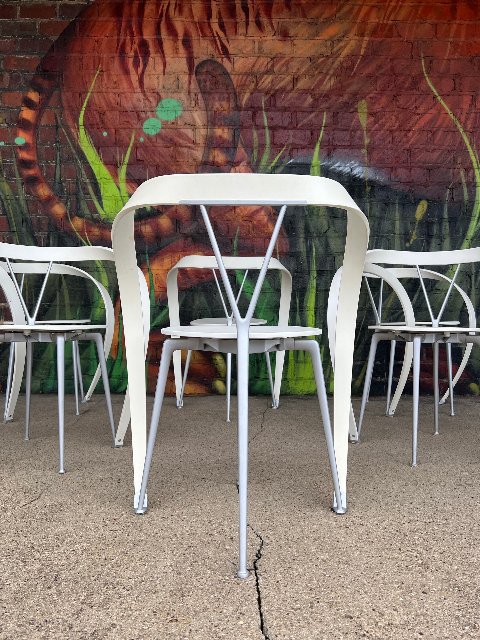 This set of 6 chairs is called the Revers Chair by Andrea Branzi for Cassina. This iconic armchair, dating back to the late 20th century, is a testament to the enduring allure of thoughtful craftsmanship and innovative design. The Revers Chair boasts a distinctive reverse ribbon design that sets it apart as a true work of art. Crafted with precision and passion, it features a matt anodized steel frame that provides a sturdy foundation for the chair's unique aesthetic. The white molded wood back support and arm structure, mirroring the form of a reverse ribbon. The chairs are marked Cassina on the bottom.