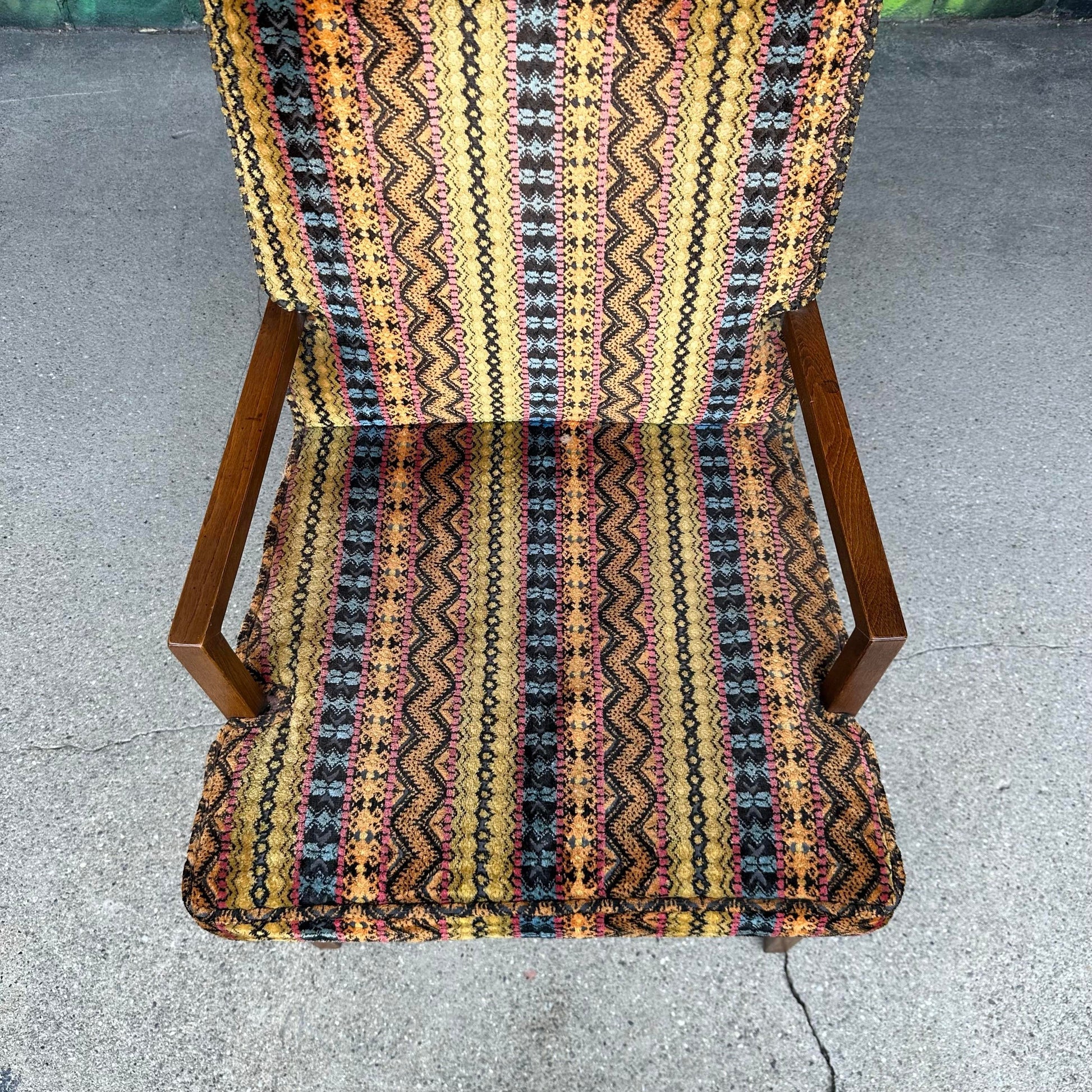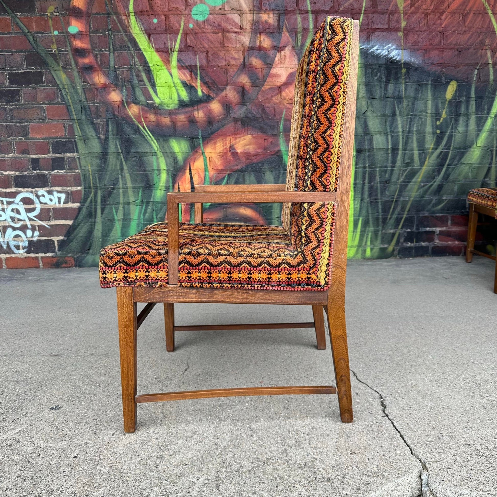 Mid century modern Set of 6 Walnut Founders Dining Chairs. This stunning set is covered in a velvet geometrical design. The chairs have a walnut wood base and tall back design. There are two armchairs and 4 side chairs. The chairs are marked Founders furniture. The dimensions in the listing is the armchair/captain chair.