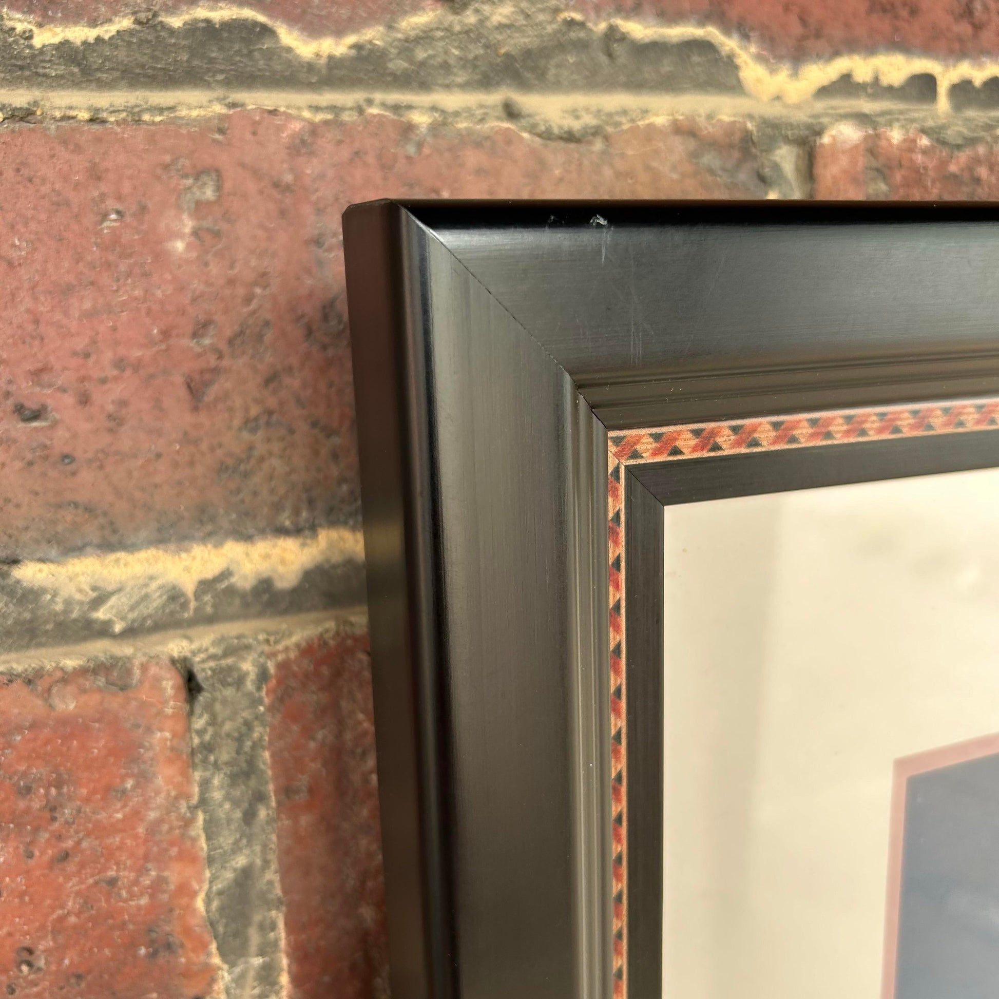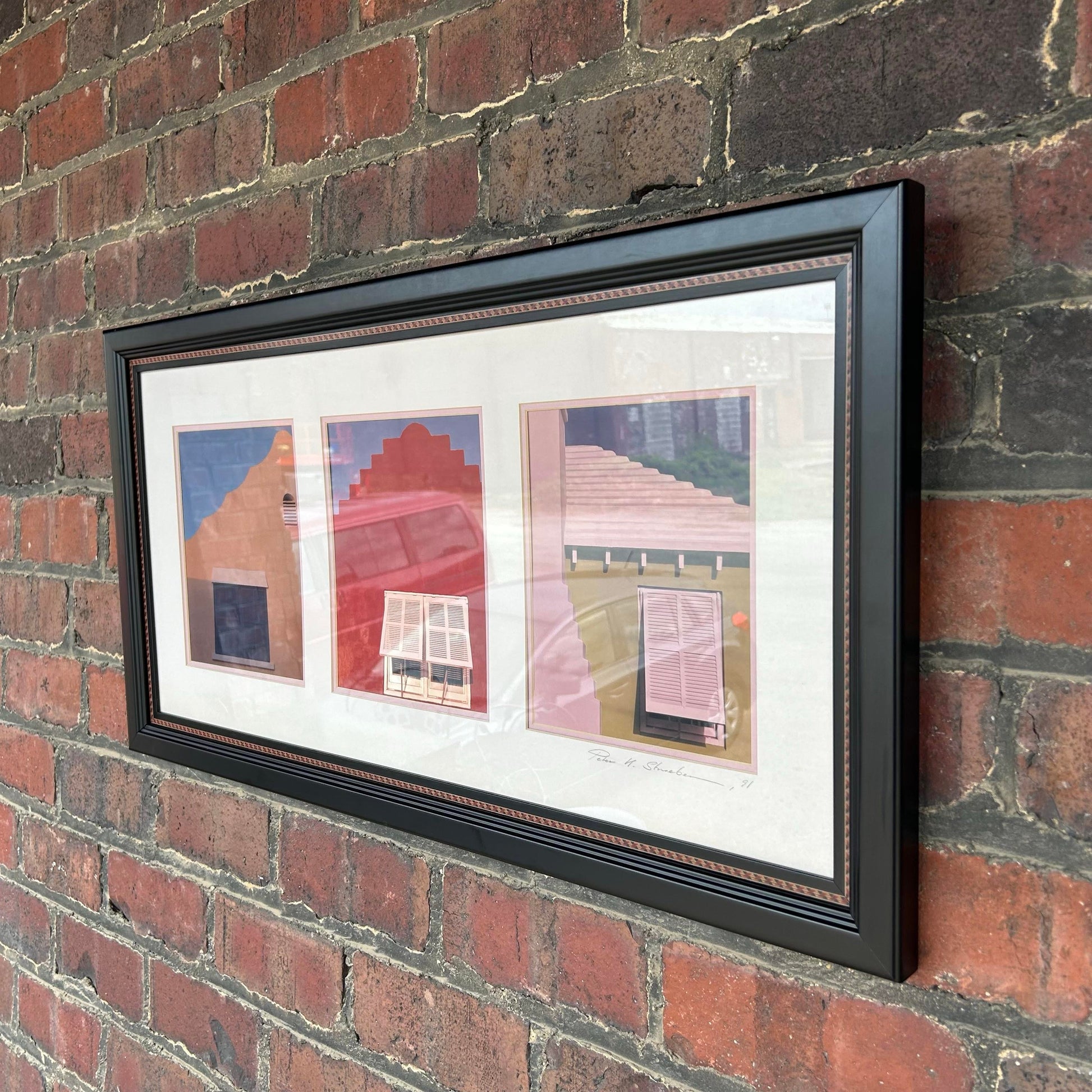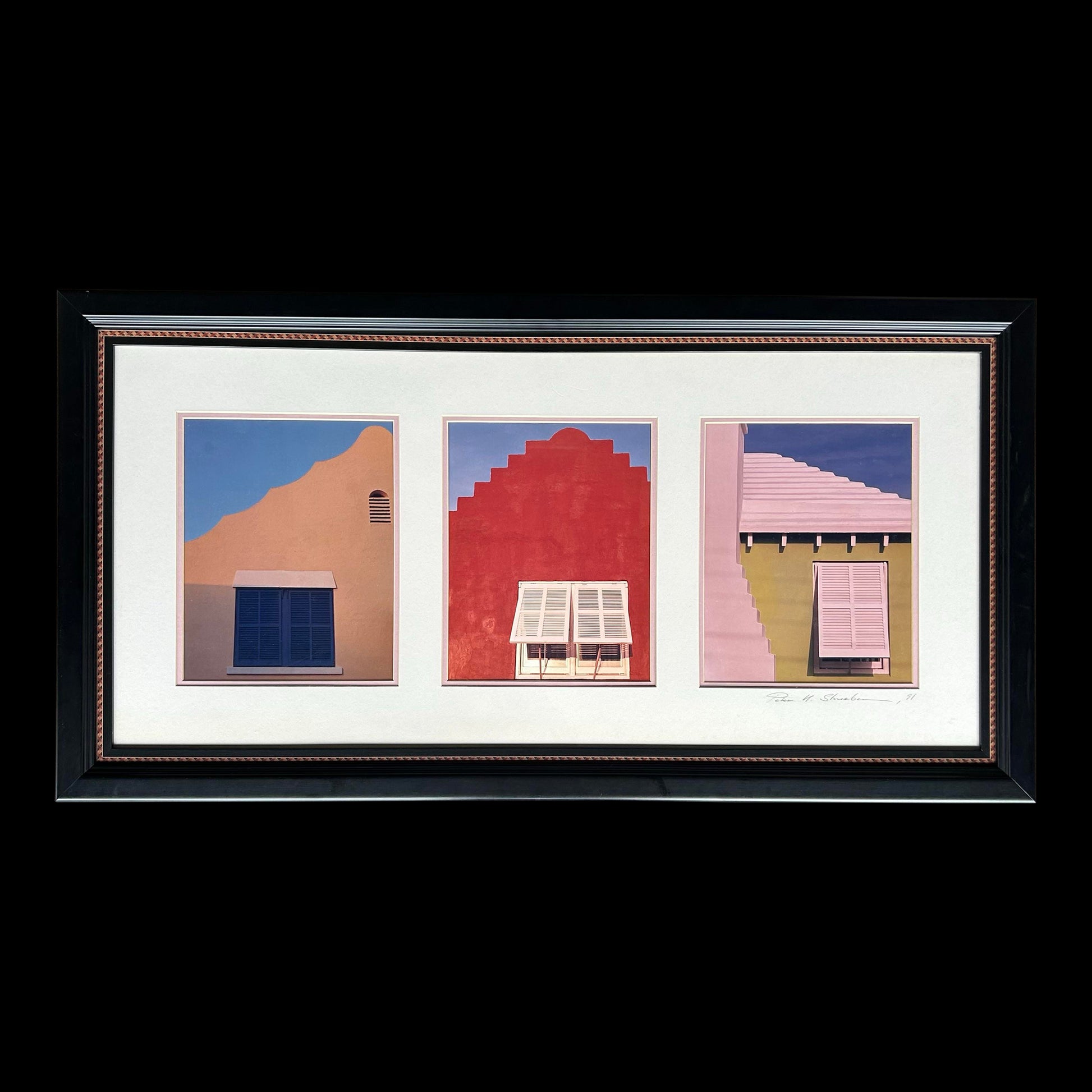 The set of three photographs depicts roofs in the city of Paget Bermuda. The set of photographs has been professionally framed in a black frame and glass. There’s a short biography on the back for the photographer. The set is signed and pencil and dated 1991.