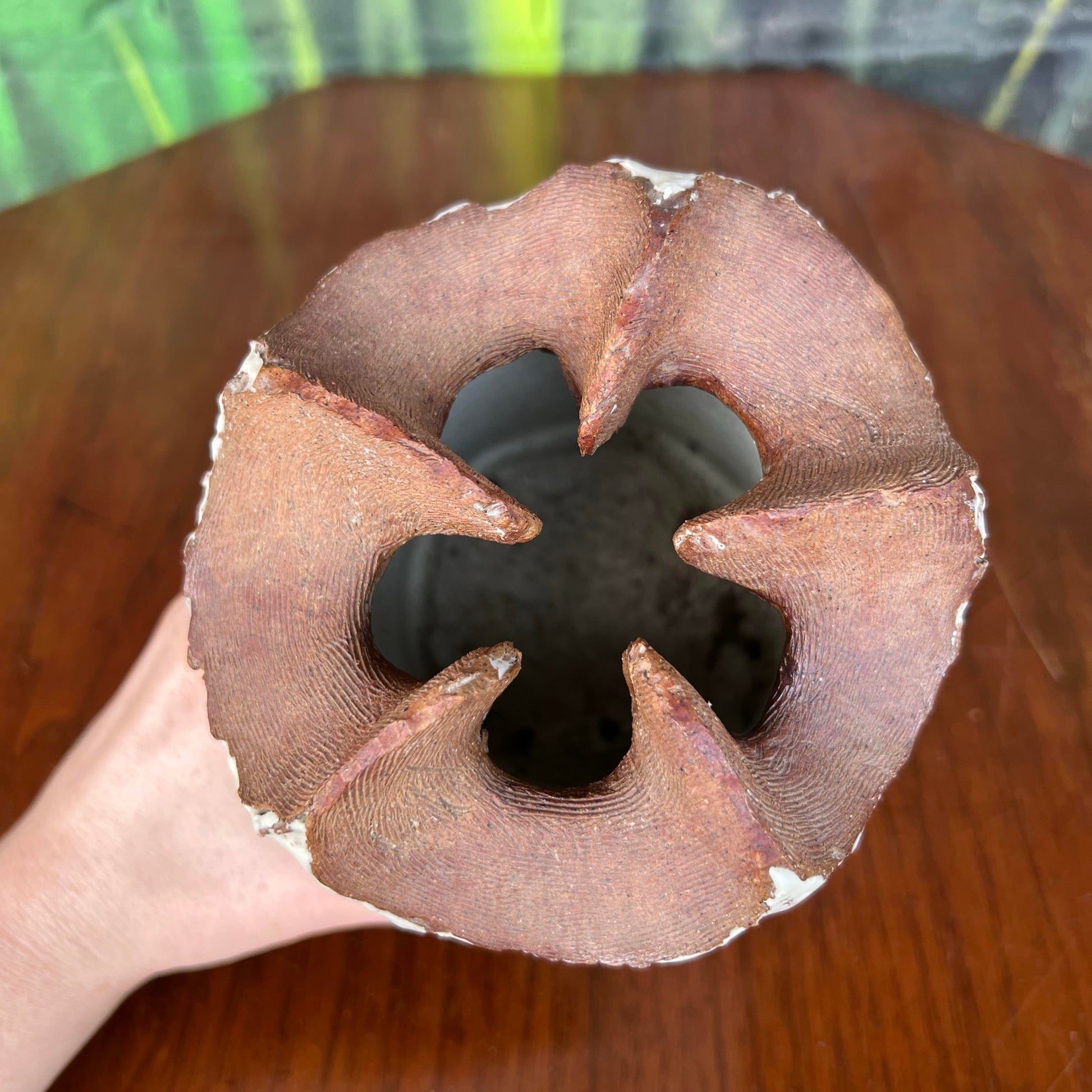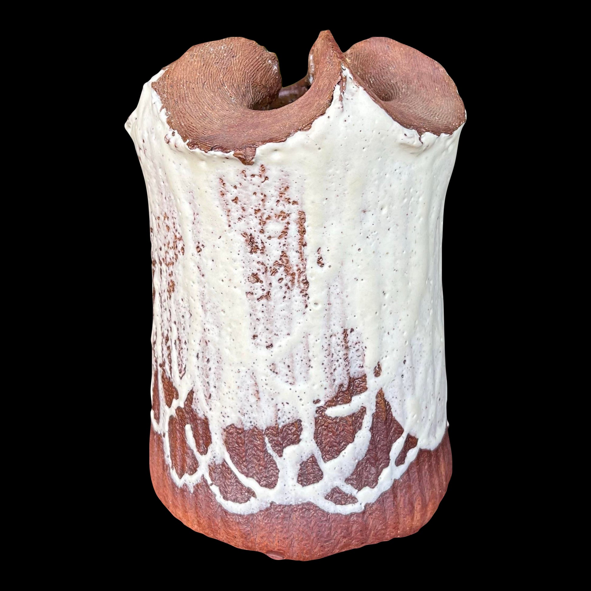 This stoneware made vase features a ribbed surface with a heavily textured white glaze and a sculptural formed and molded top. Signed on bottom. Believe to be a Cleveland artist but do not know the signature.