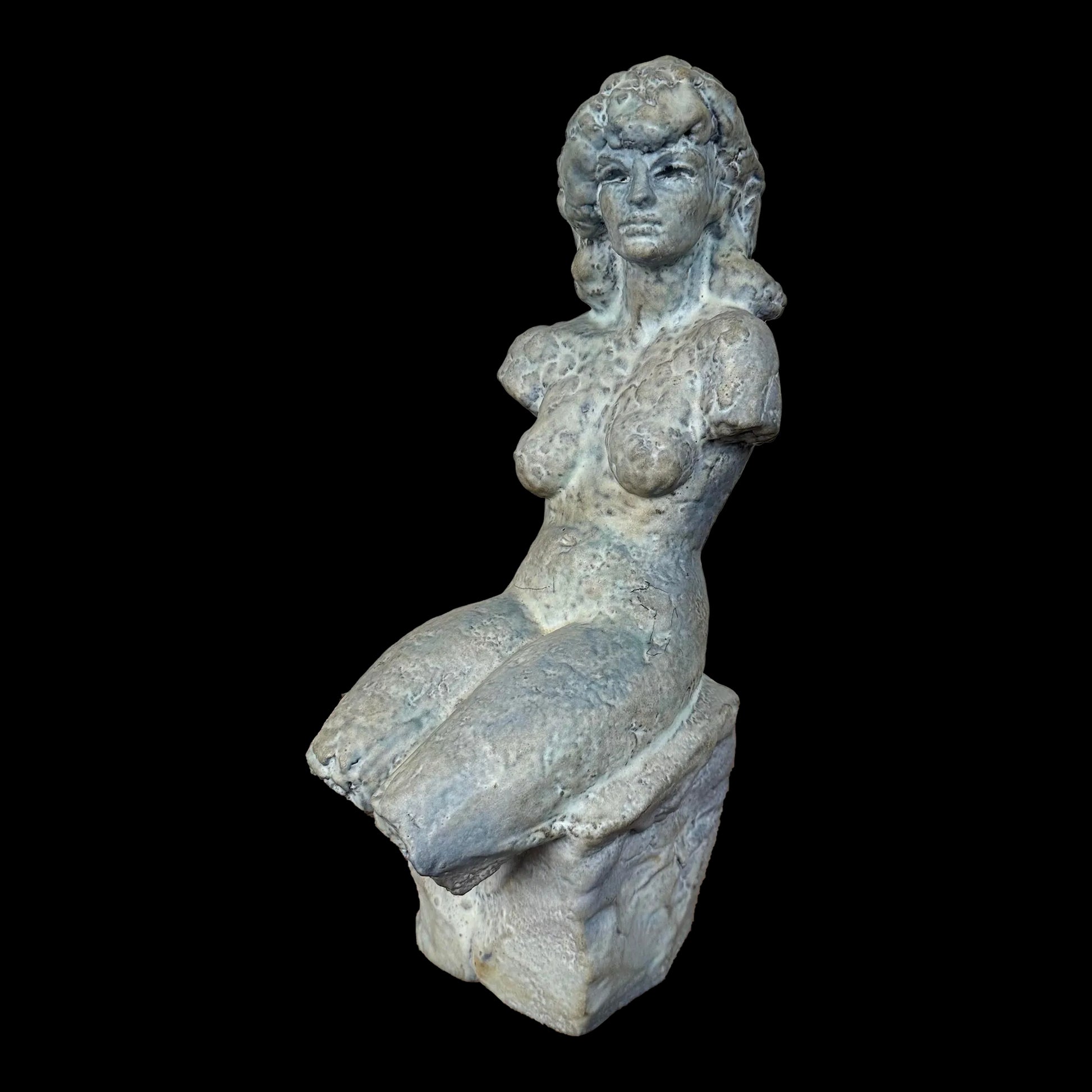 Ceramic Nude Sculpture in Blue Glaze. This sculpture features a nude female model sitting upon a square base. It sculptures has a bluish grey glaze throughout. It does appear to have been signed but it is not legible.