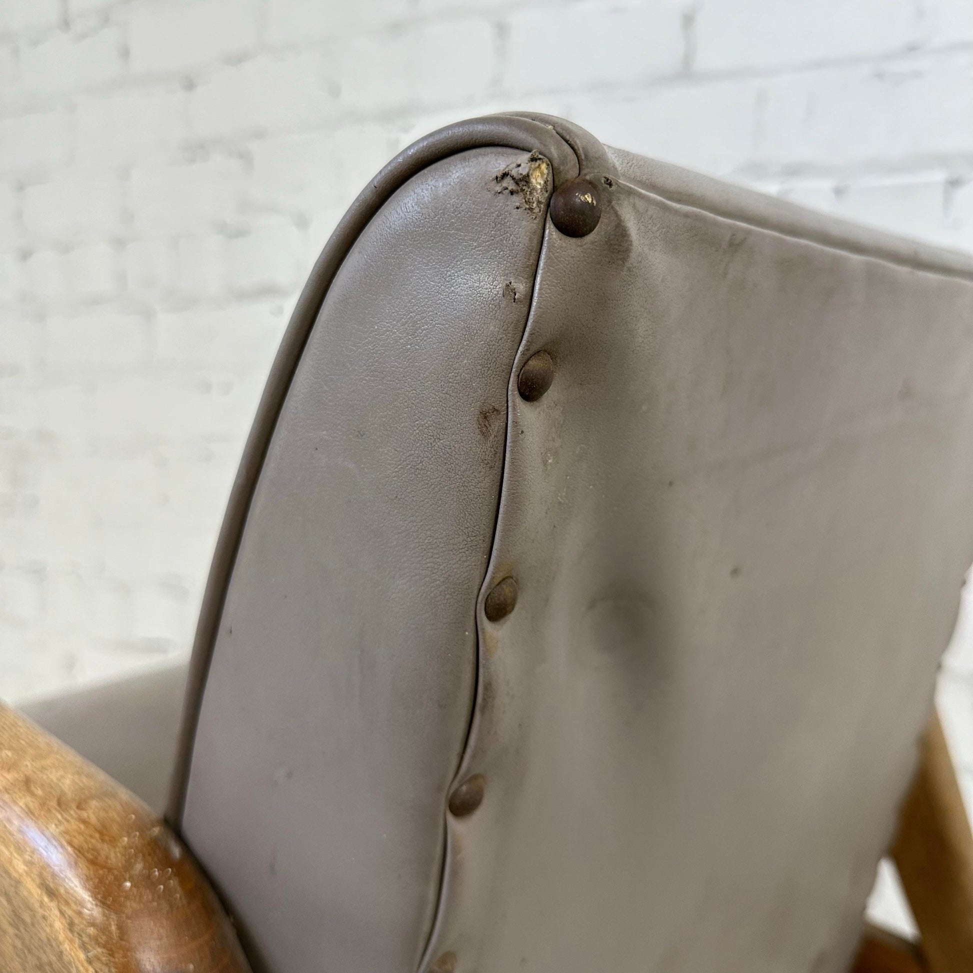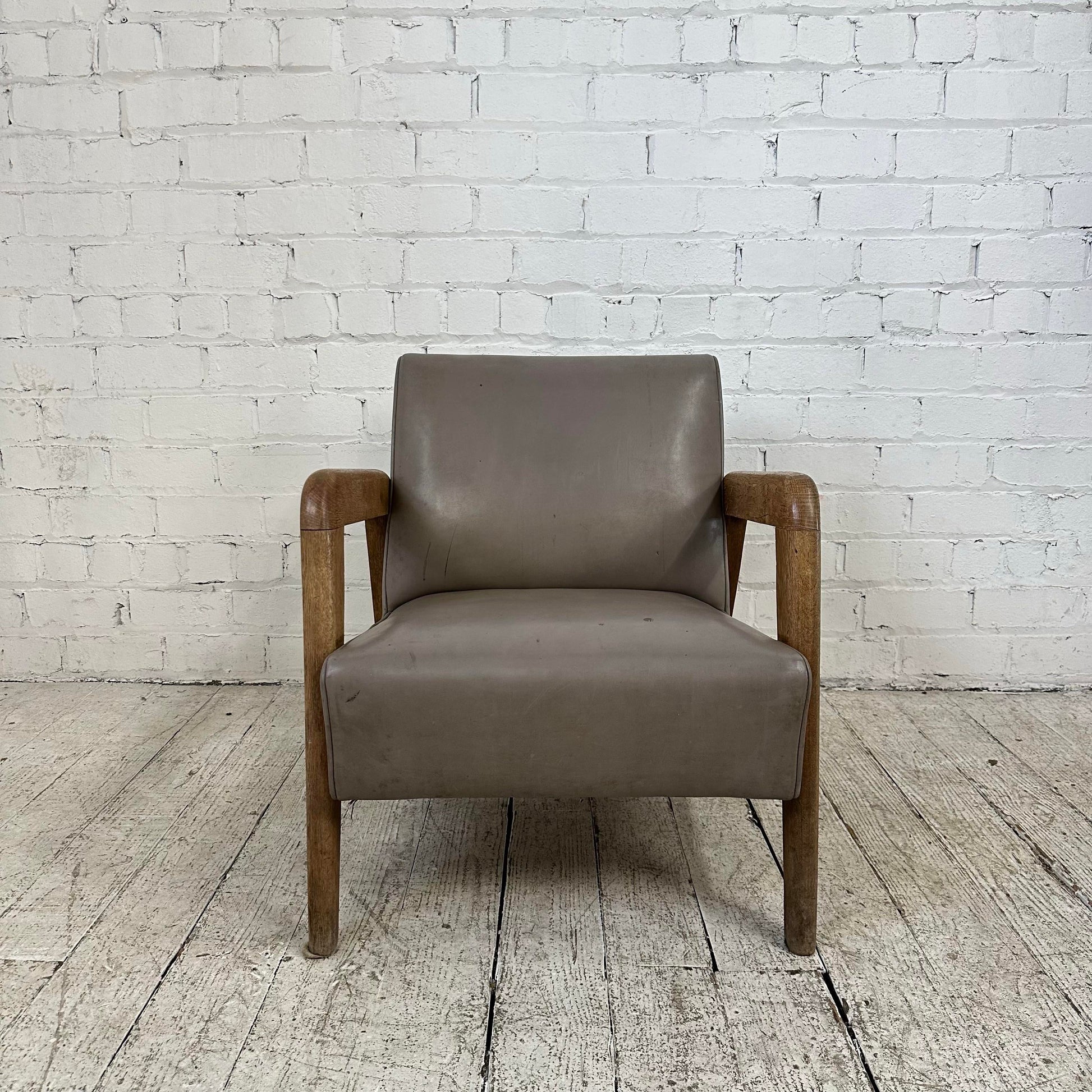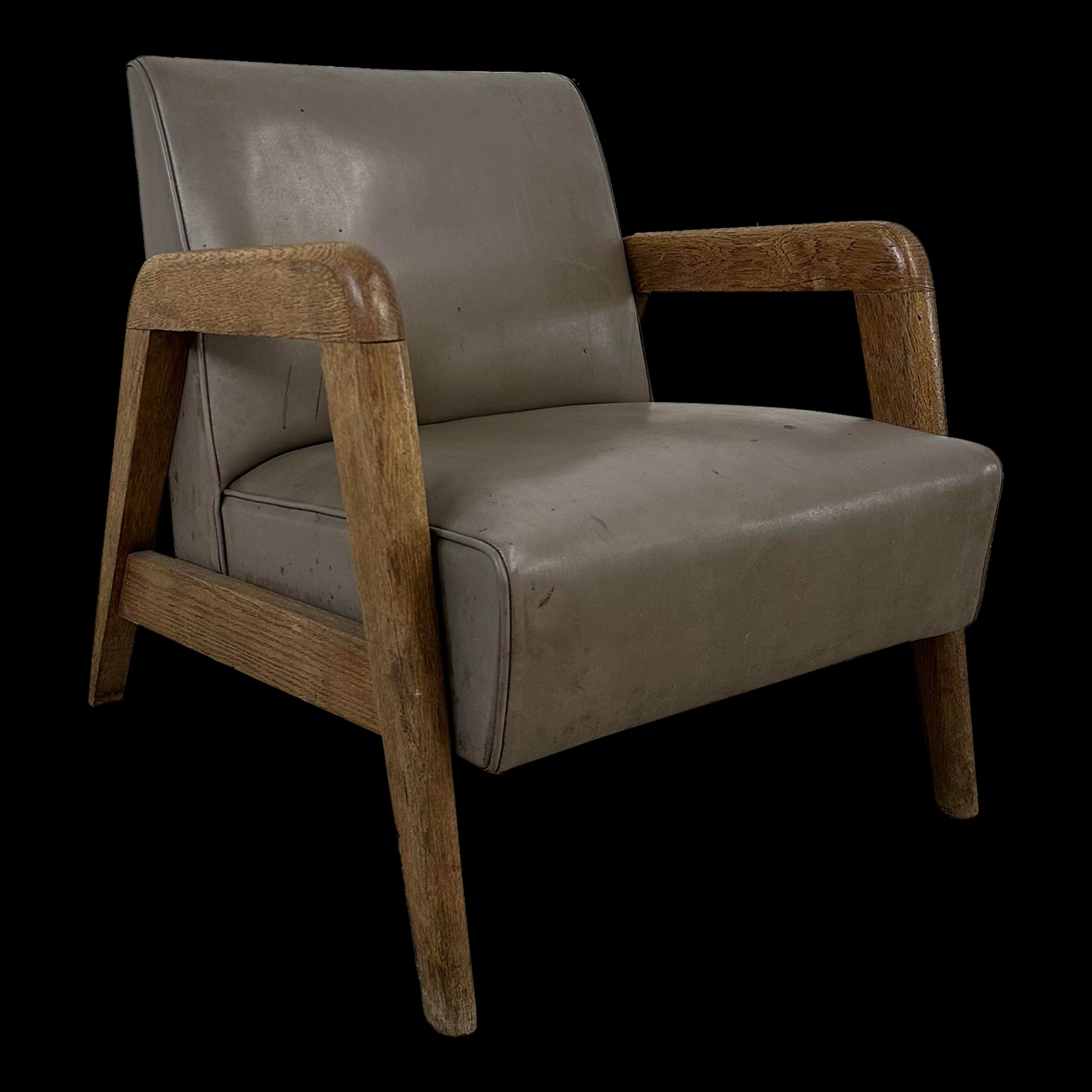 The chair features a low profile design Made with solid oak Wood Frame, and grey Vinyl upholstery. There’s no makers mark on the chair.