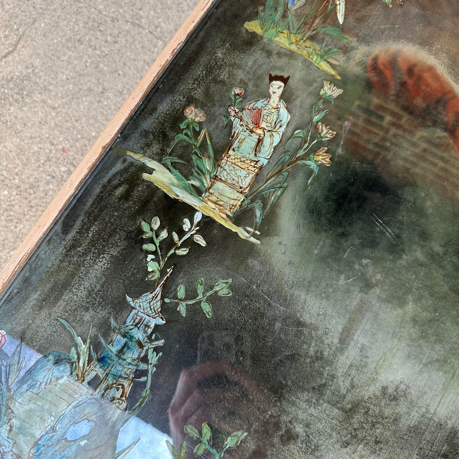 Square-shaped coffee table featuring Asian style scenes hand painted on mirrored glass table top. The wooden base features oversized traditional style tapered legs with ornate carvings.