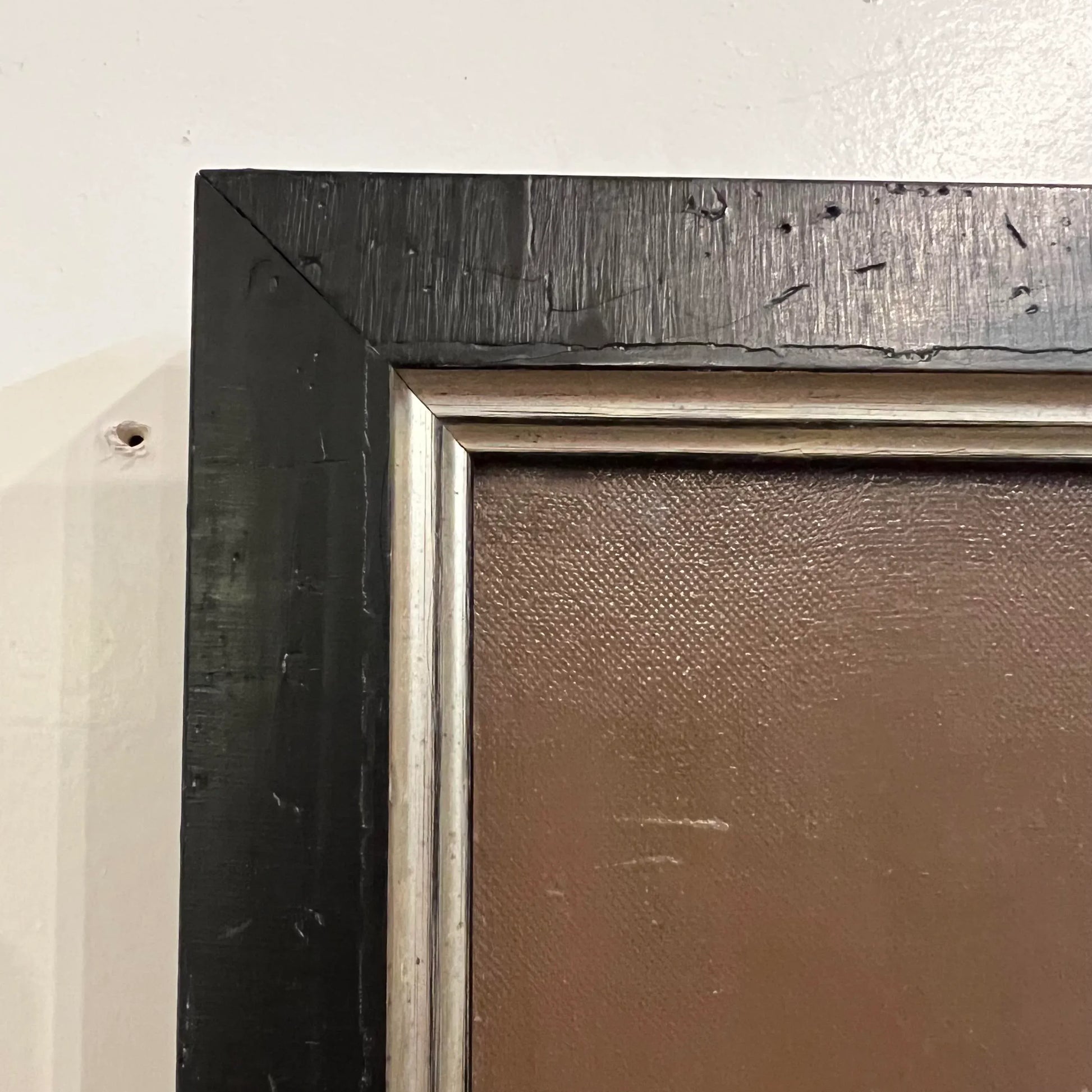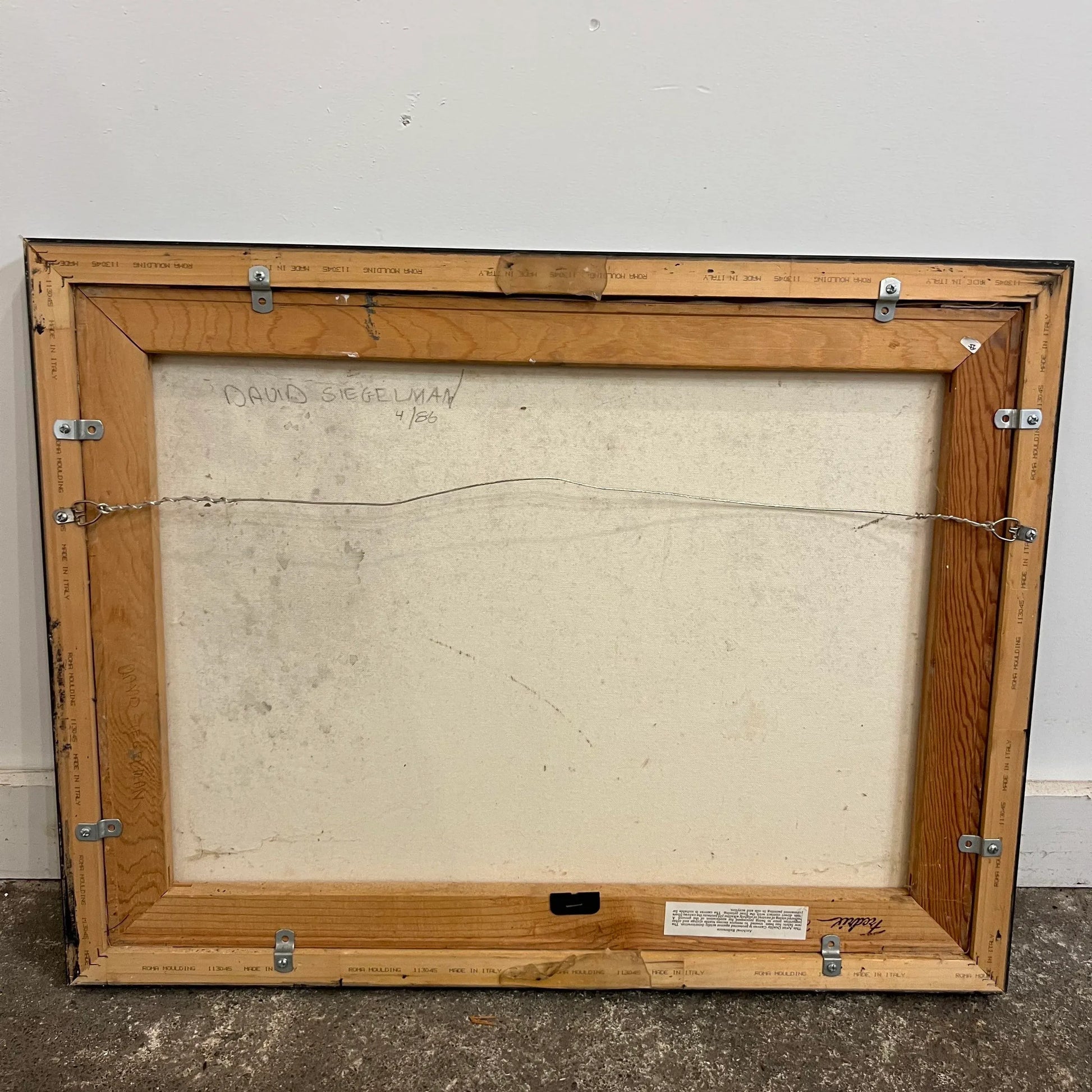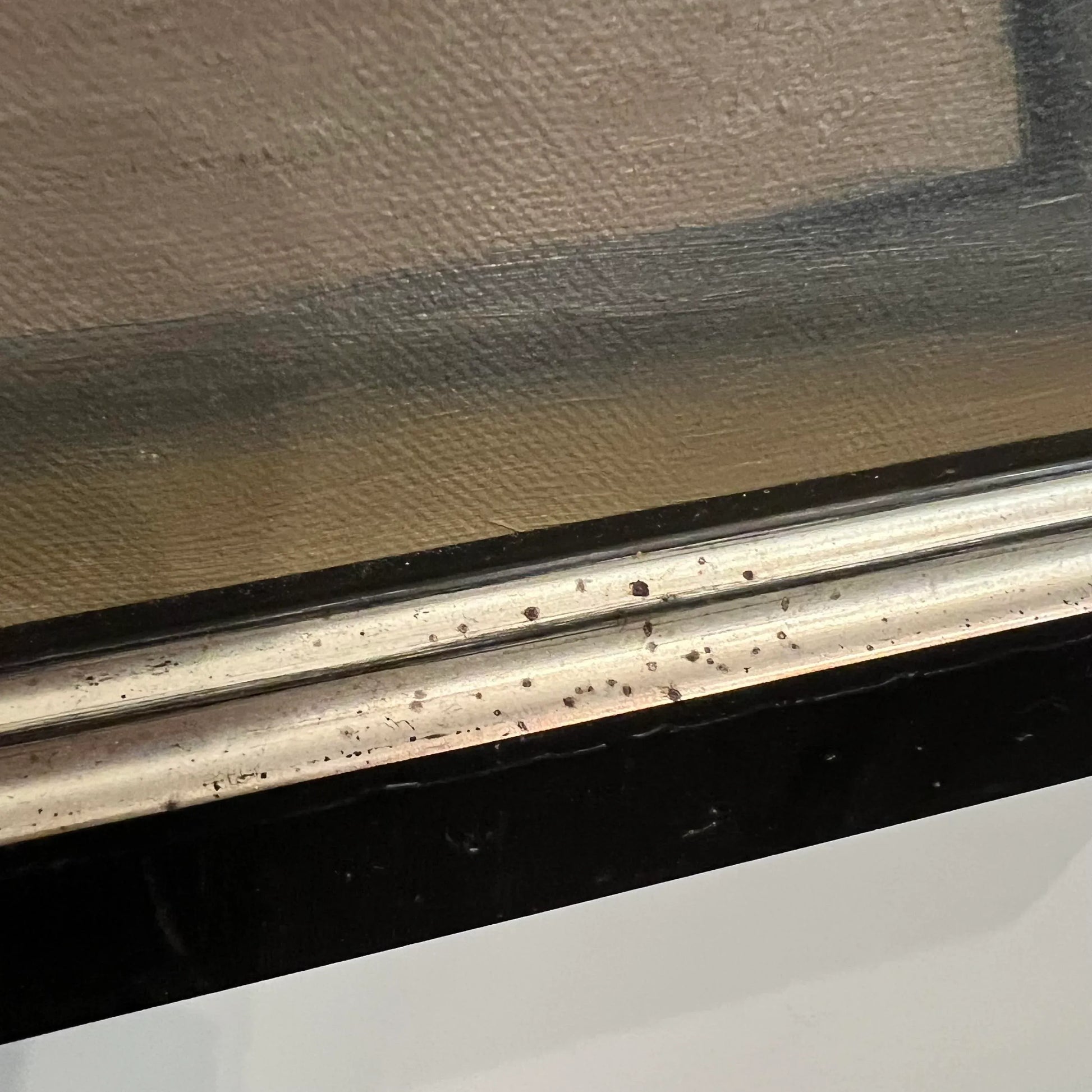 Still life oil painting by David Siegelman depicting a table of household objects including jars, cups, measuring spoons, etc. Frame is made in italy.