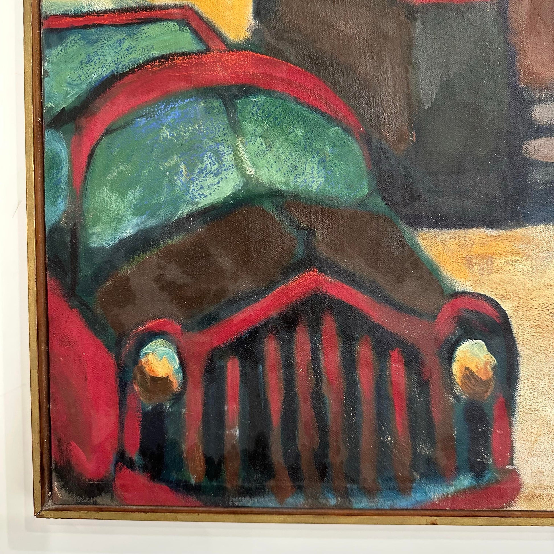 Street Scene Painting Marked Golder Untitled. The paiting depicts a woman figure holding an umbrella is walking on the sidewalk while an older vehicle maybe 1930 or 40s sits beside a storefront. The painting has a small sticker on the back marked “Golder Untitled”