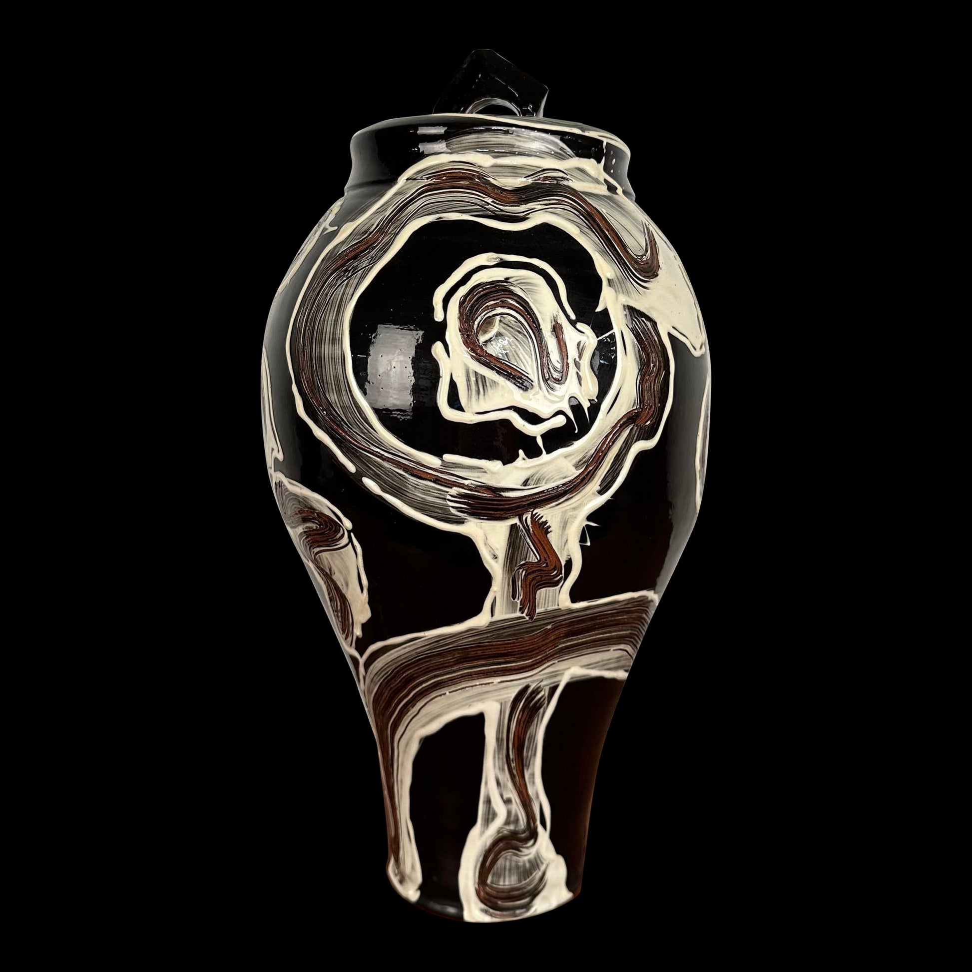 This is a unique piece of Studio Made ceramic hand made by Craig Bird. The piece is a lidded vessel or urn that features black, white, brown glaze. The piece is signed BIRD on the bottom.
