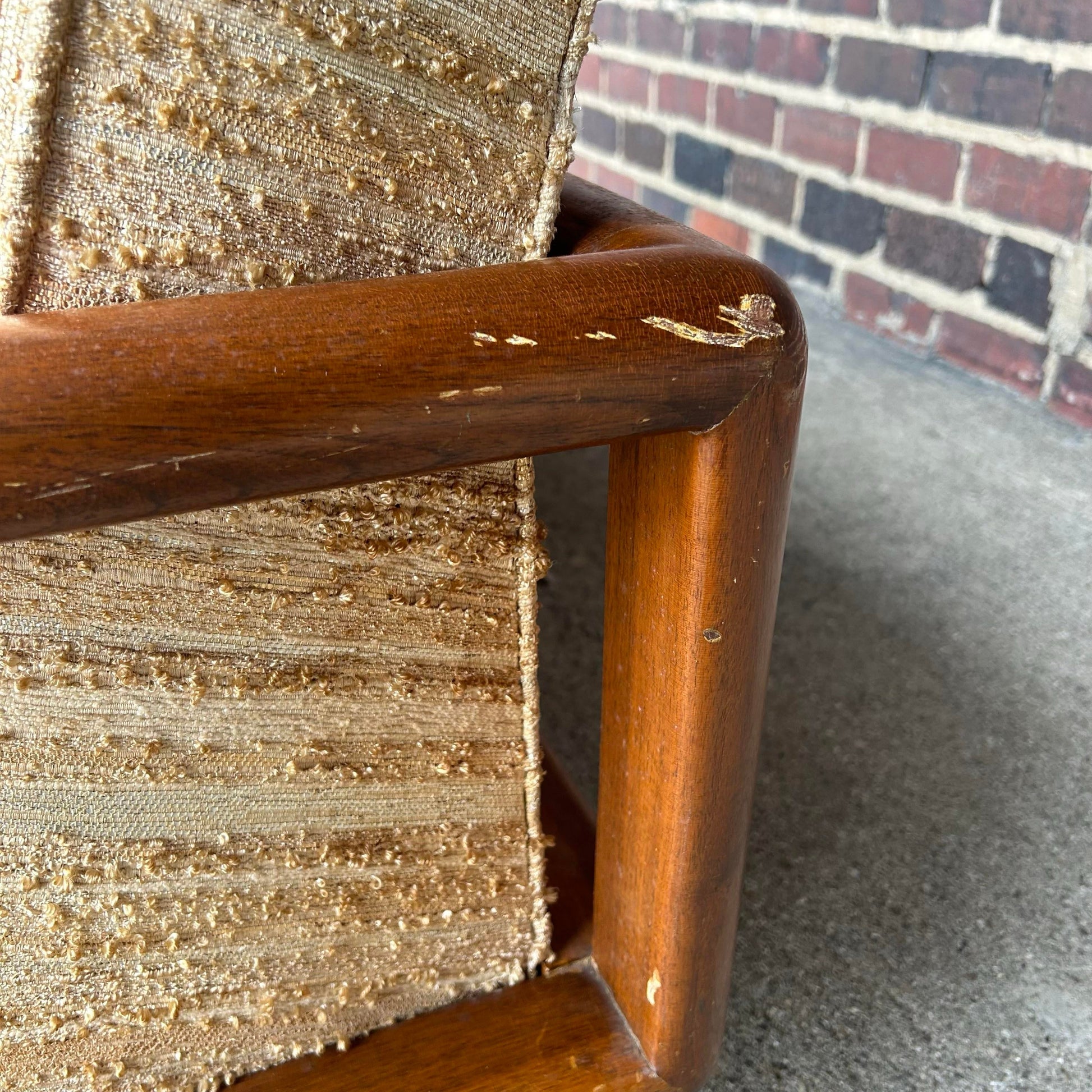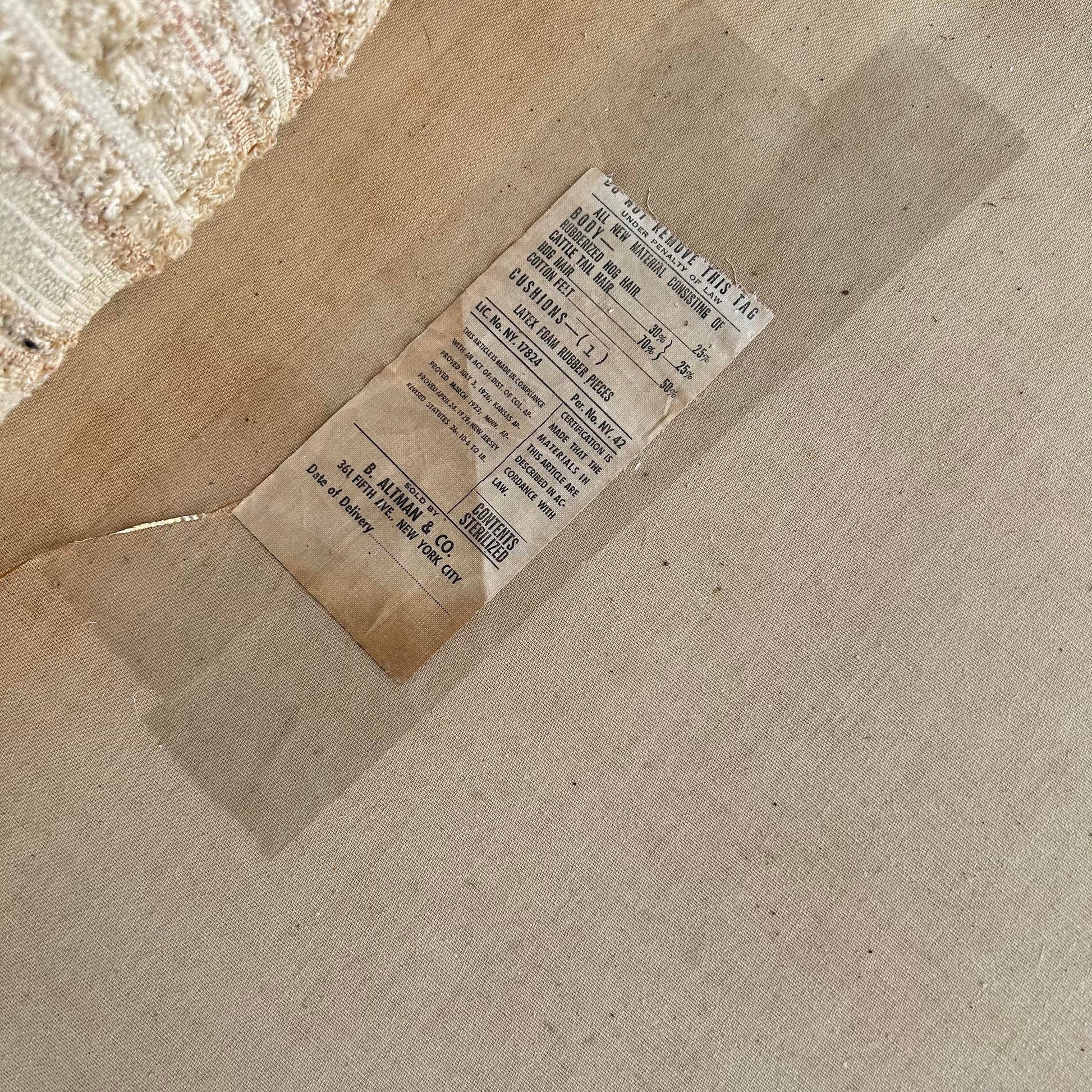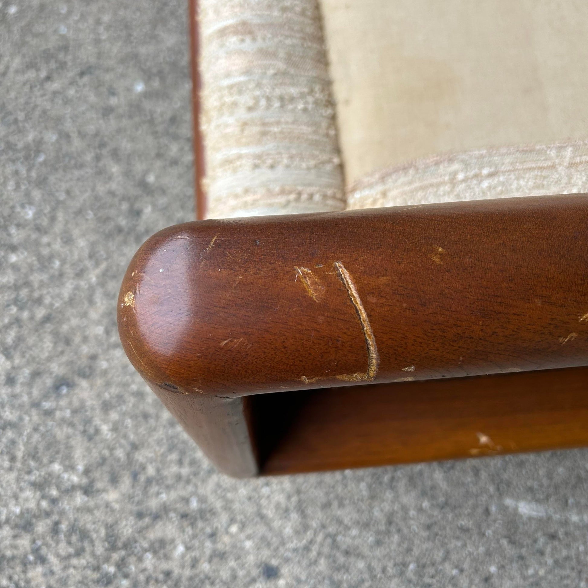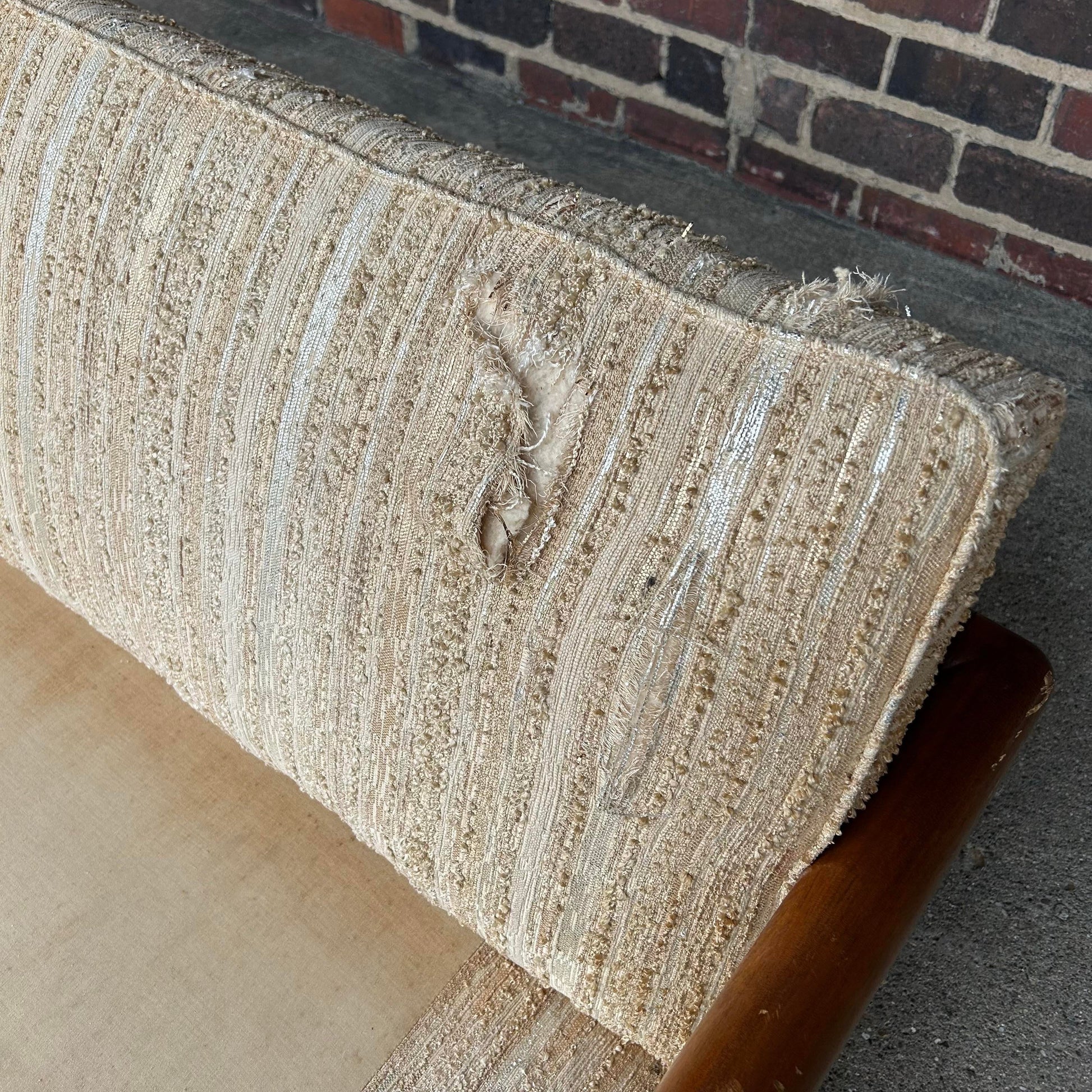 This sofa is incredible. The solid wood frame has the signature Robsjohn Gibbings rounded and curved edges. This sofa has tapered brass legs with lilly pad style feet. Currently the sofa is in need of restoration but would be amazing redone!