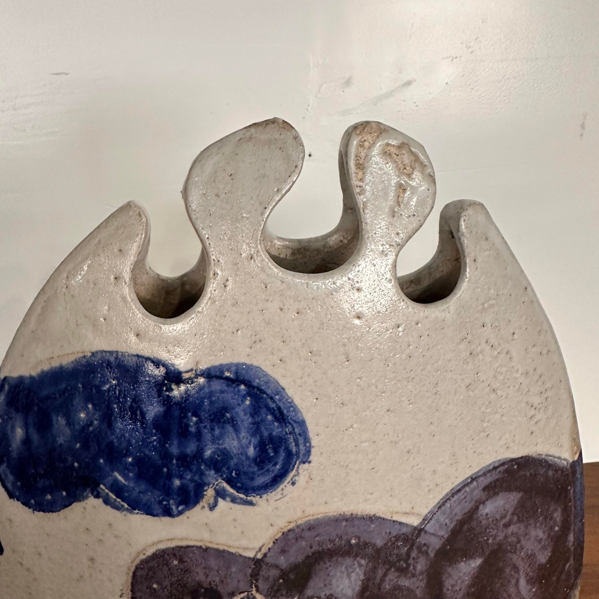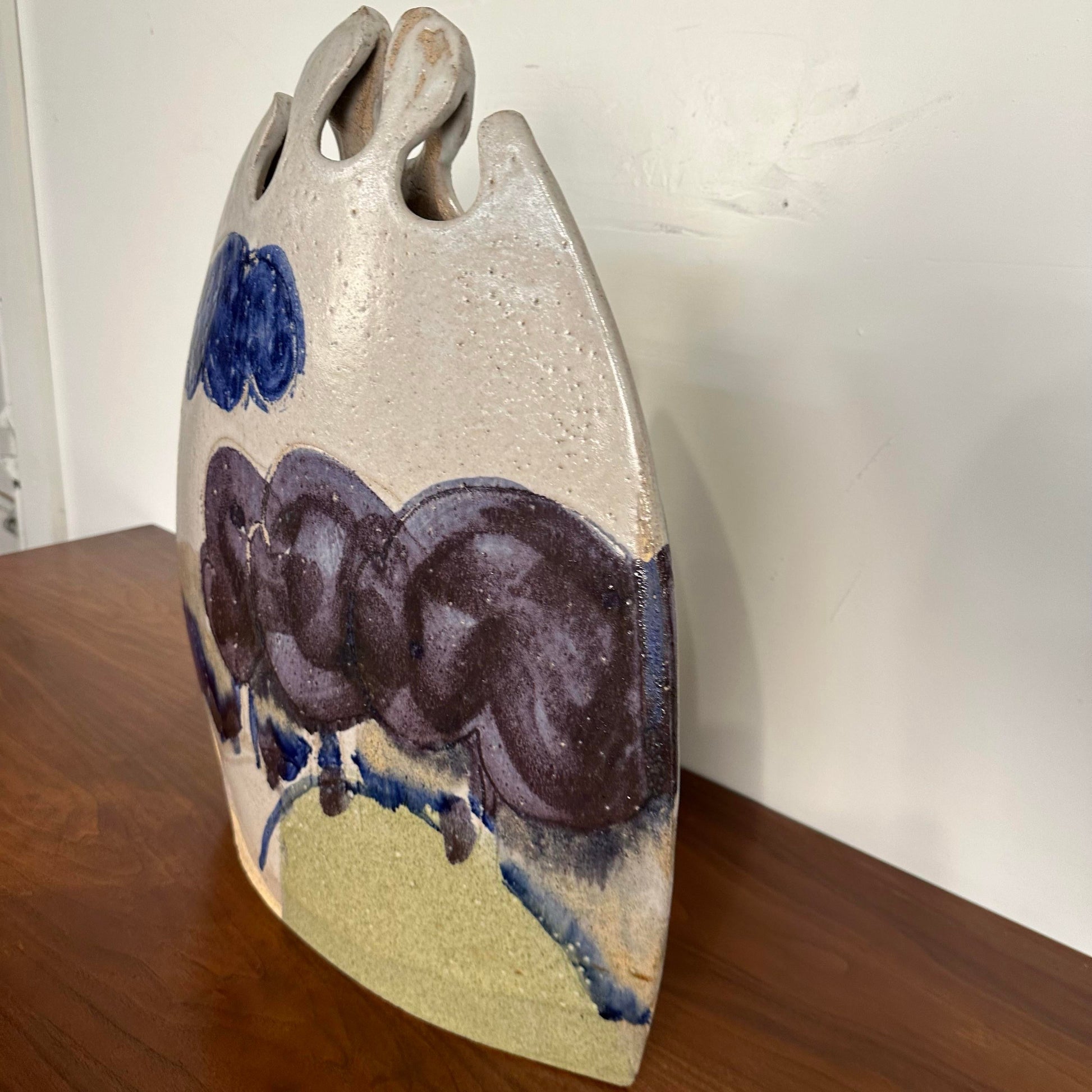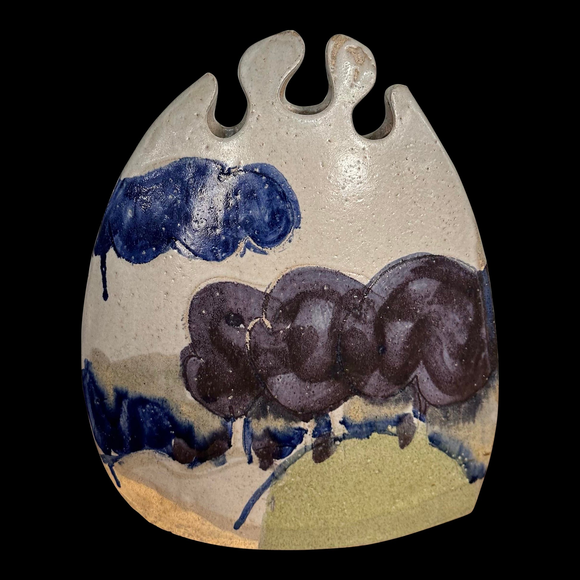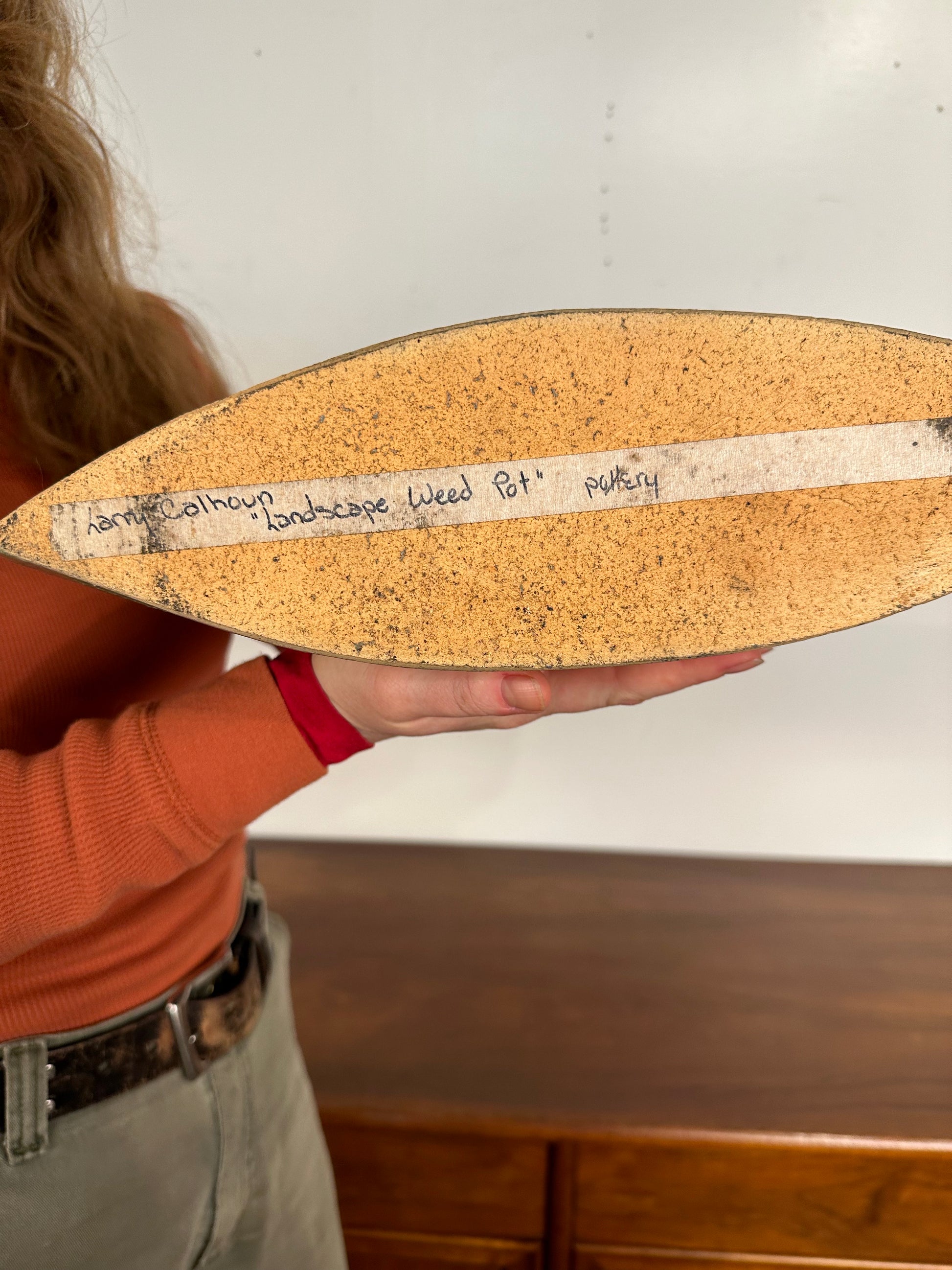This sculptural vase is large and handmade by Ohioan ceramist Larry Calhoun. It features a glazed painted landscape of a forest’s tree line and clouds in the sky. Although there is no signature or date on this piece, it is from the Mid-20th Century and has handwritten label on the bottom from the original owner/buyer. We have the original paper work from the purchase from Gallery.
