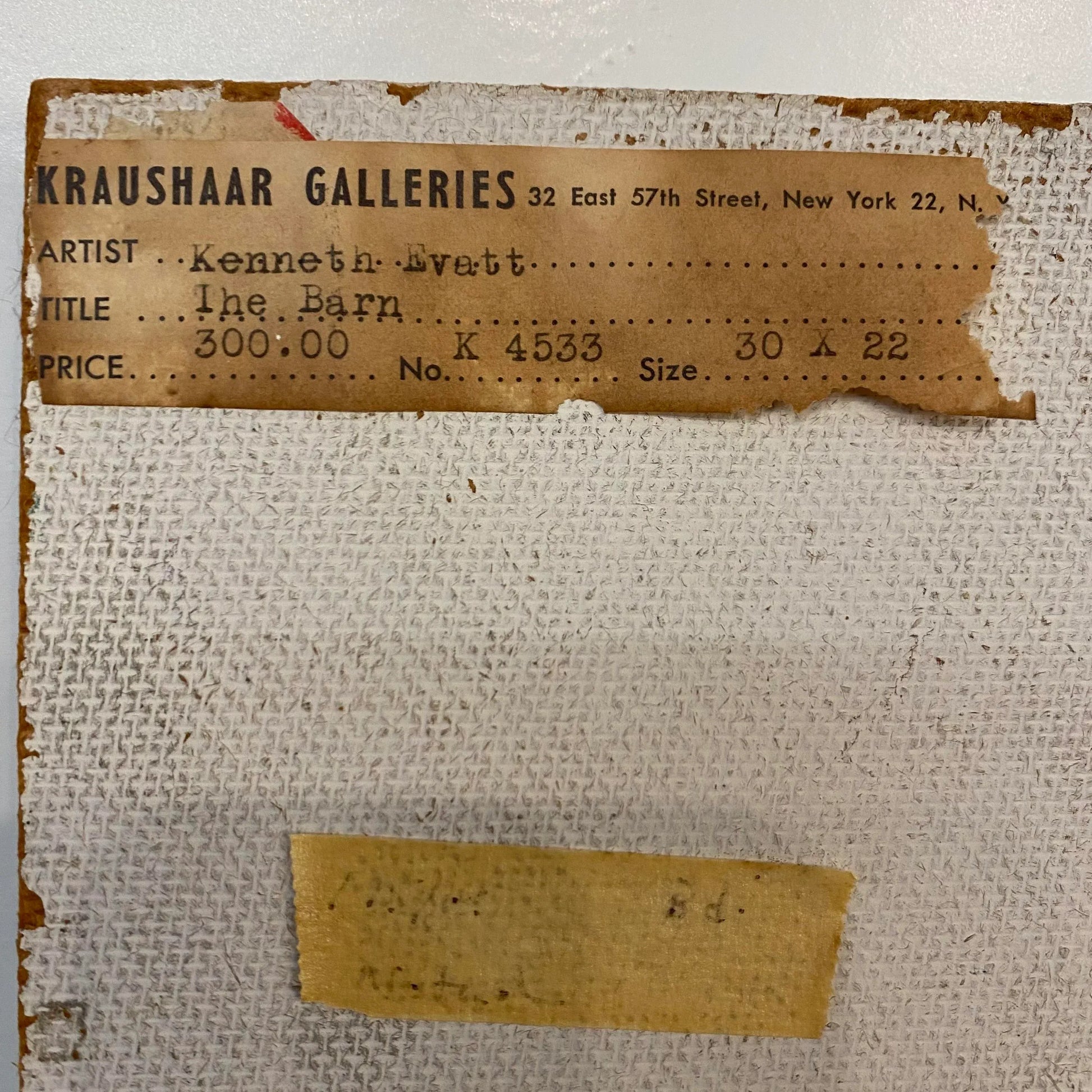 “The Barn” Painting on Panel by Kenneth Evett signed with info on the back. The painting is on a cardboard canvas and is very delicate.