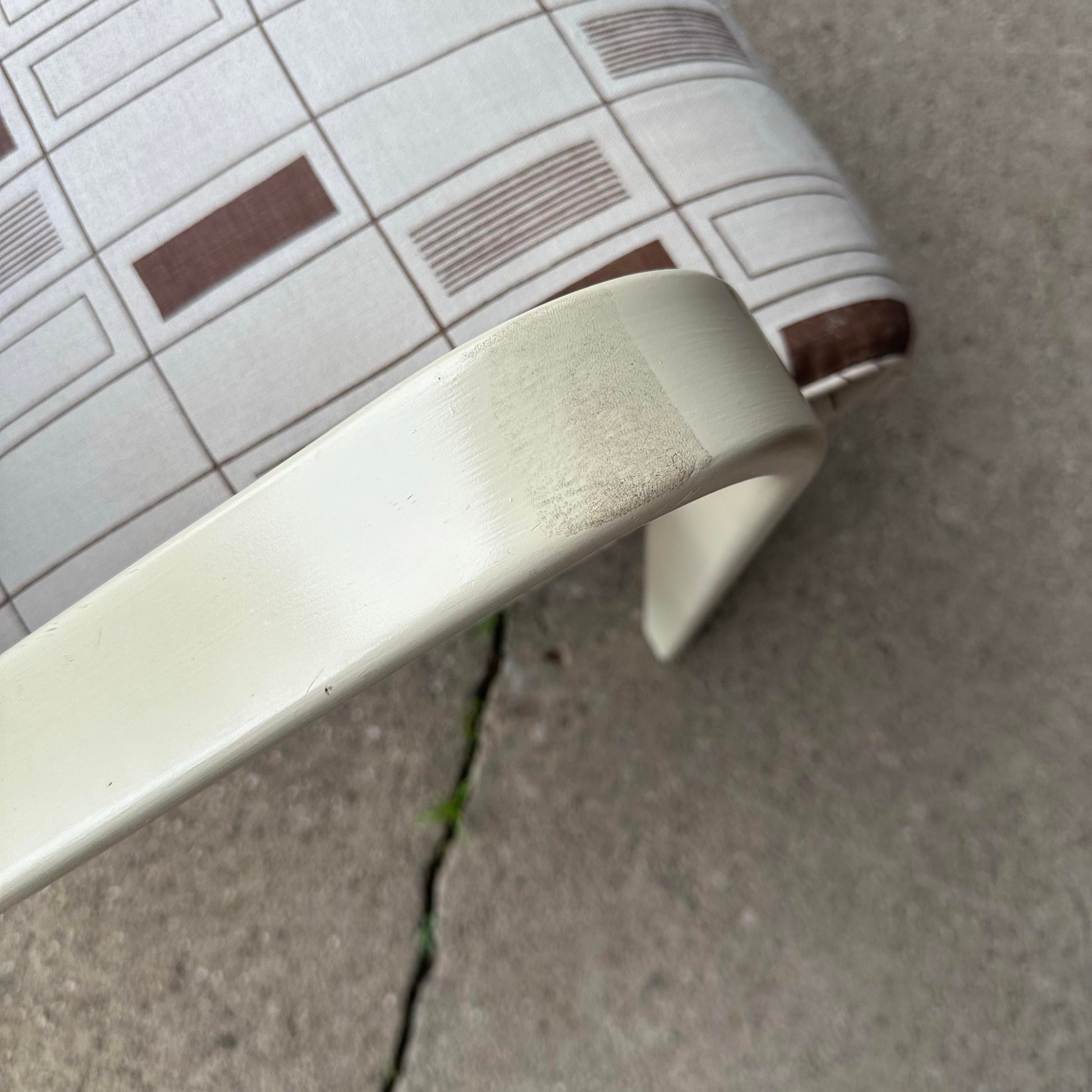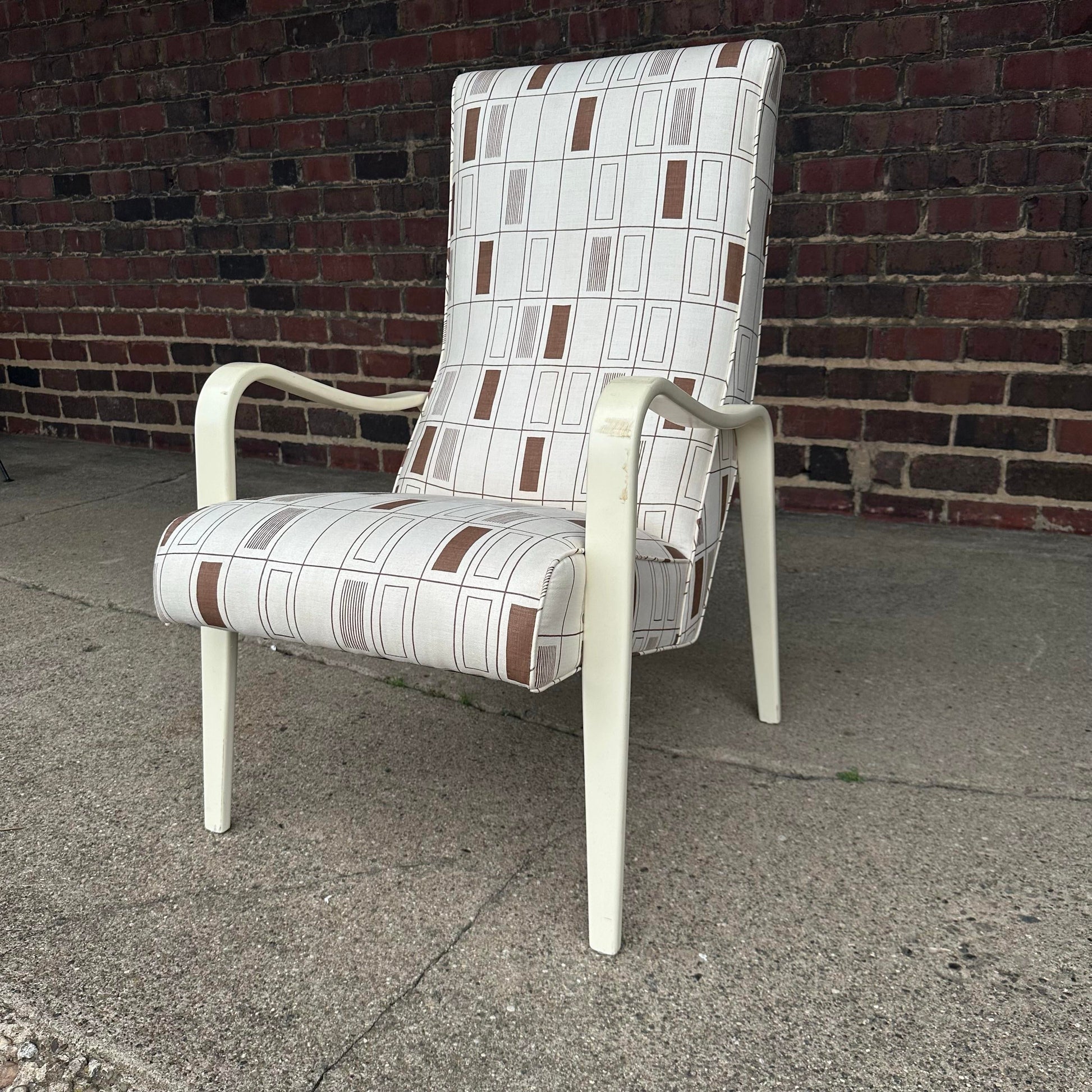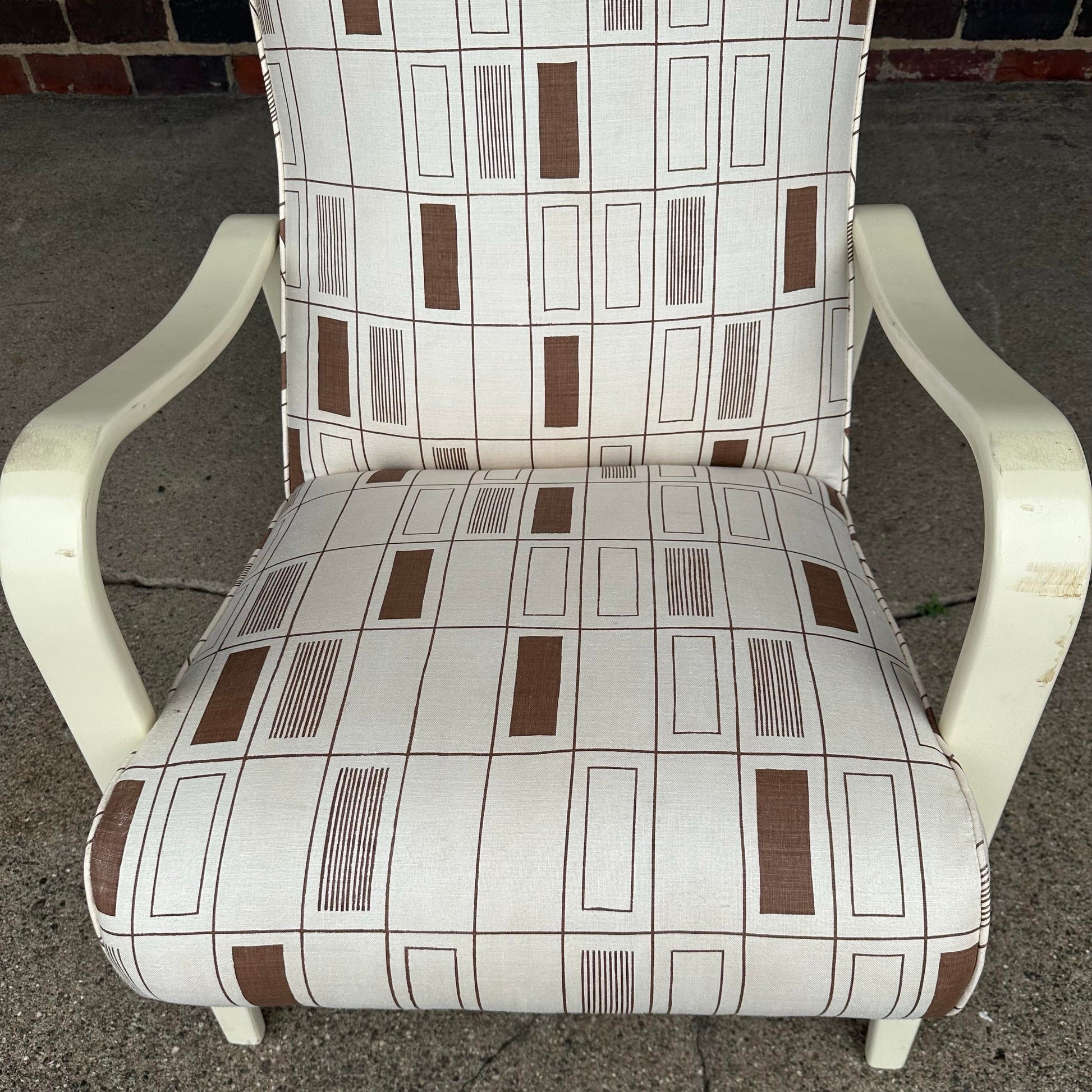 The chair has two Bentwood arms that have been painted white and the upholstery is white and brown fabric. The chair has been reupholstered previously and painted there is no makers mark on the chair.