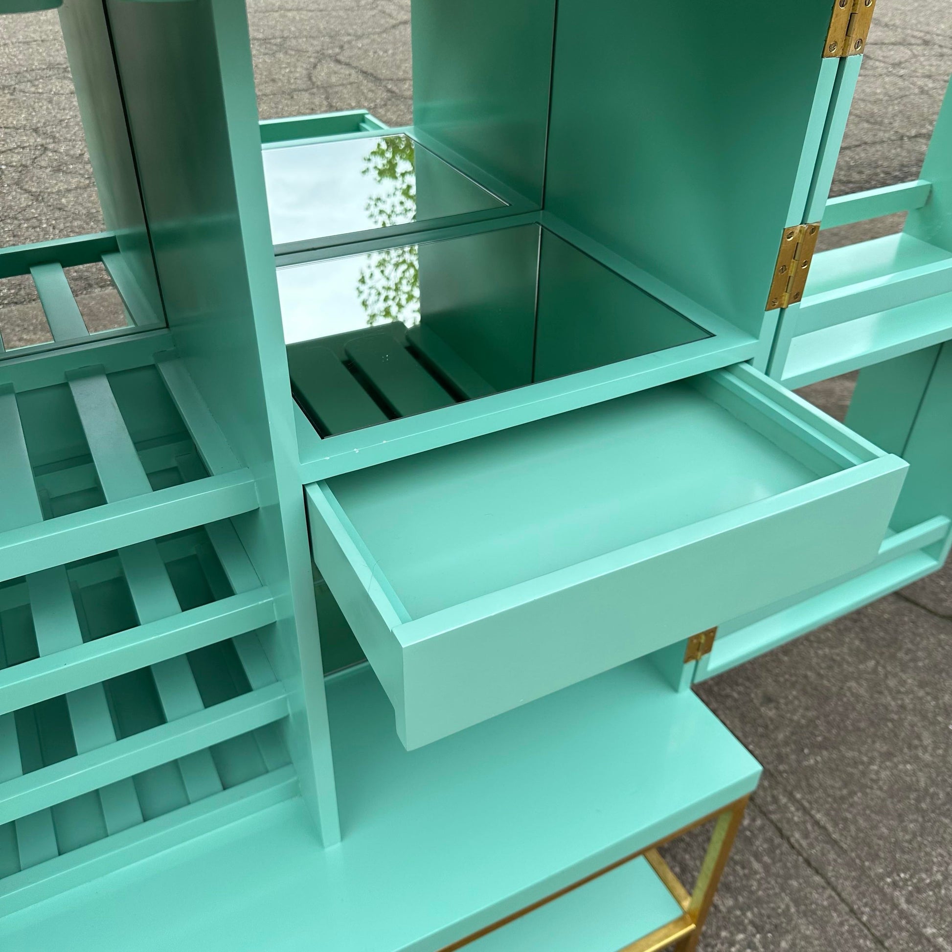 Tiffany blue bar with large doors that open to reveal wine racks, shelves, and glass wear storage. This piece has brass and mirrored accents throughout.