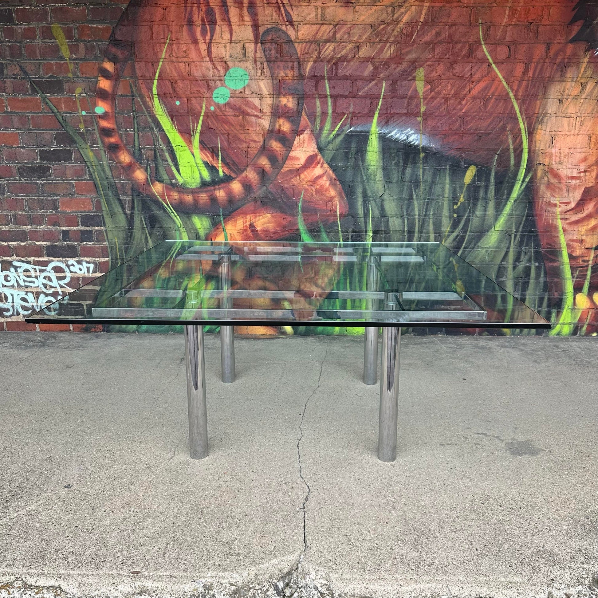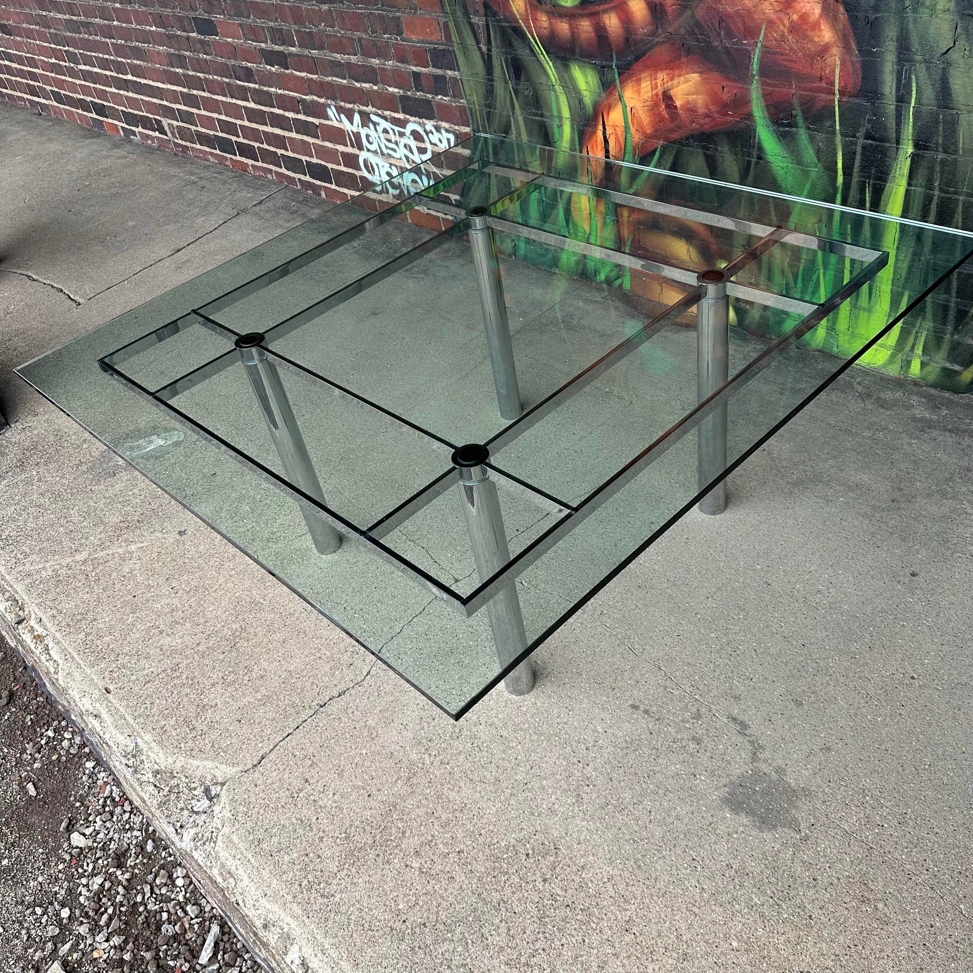 This table makes a colossal statement! Glass and chrome coffee table designed by Afra and Tobia Scarpa for Knoll. The square glass is 3/4” thick and featuring a modern chrome base that is angular yet has cylindrical legs.
