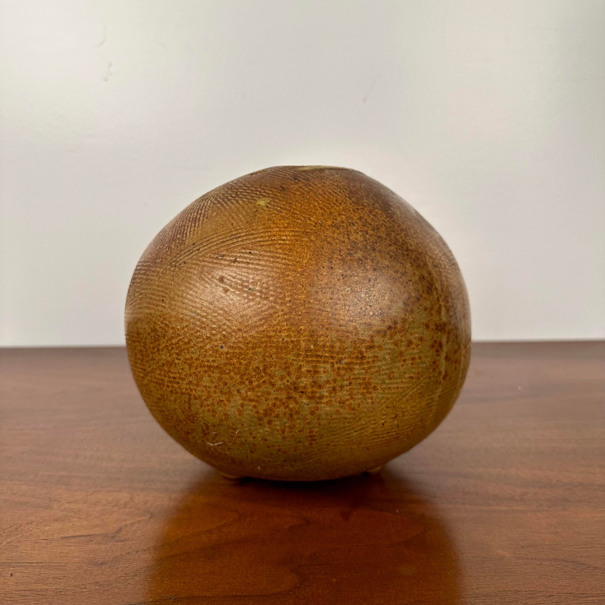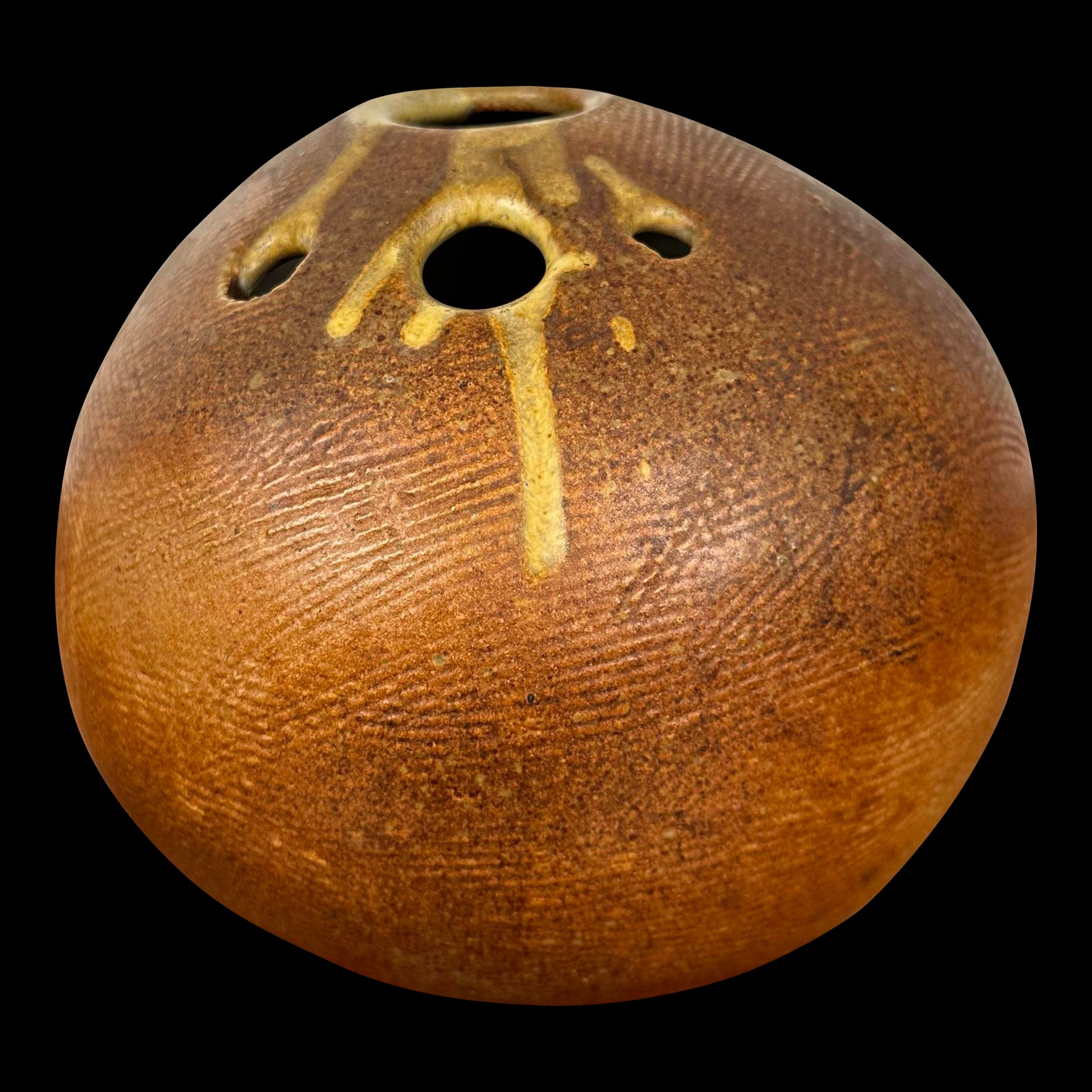 Sphere-shaped bud vase on three little feet. Bud vase has various sized holes along the top with dripped glaze detailing and stamped texture throughout. There is a spiked flower frog inside. No visible signatures.