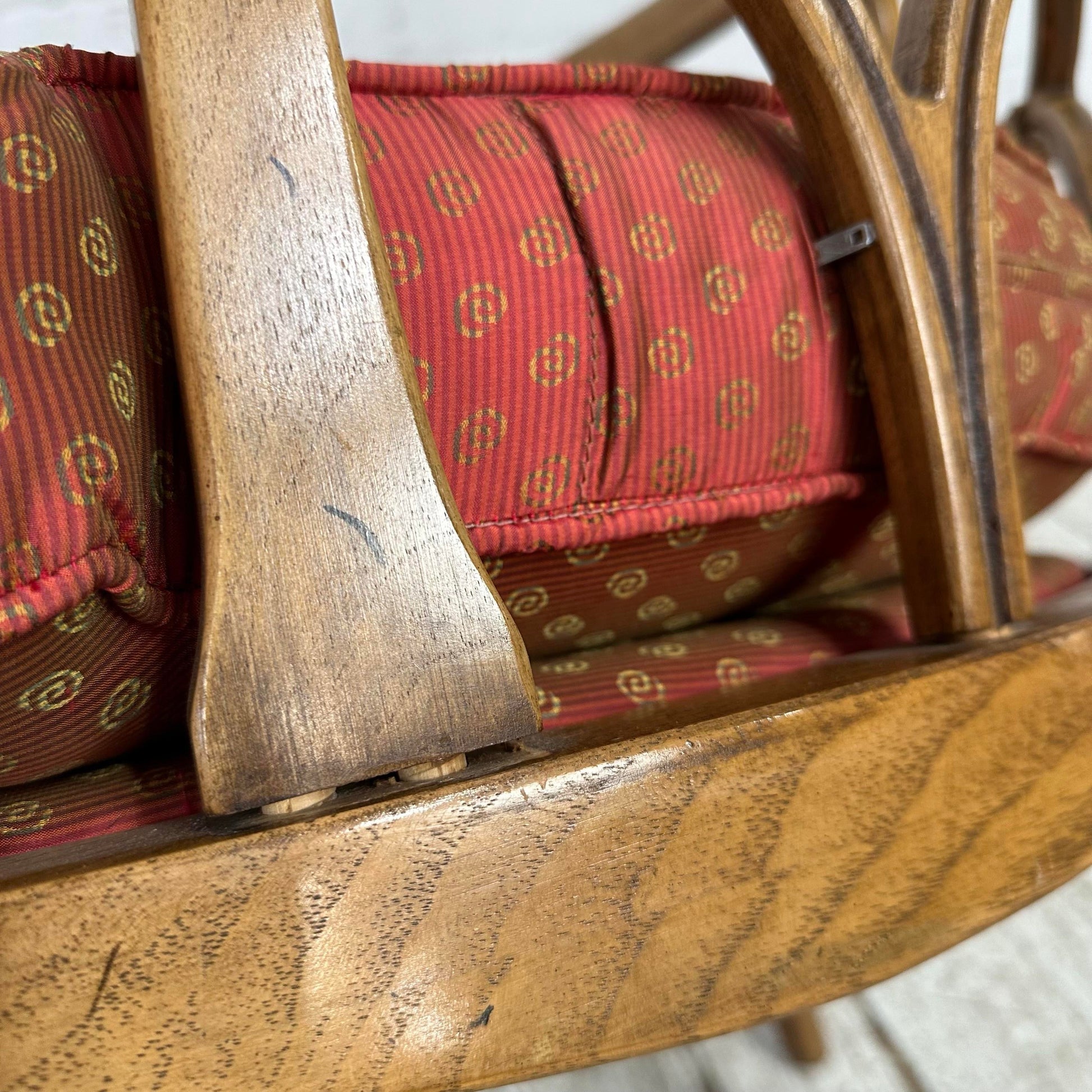 Mid century modern 60s Hollywood Regency lounge chair with spider web barrel back design with solid natural fruit wood and speckled antique finish. Upholstered cushion is removable.