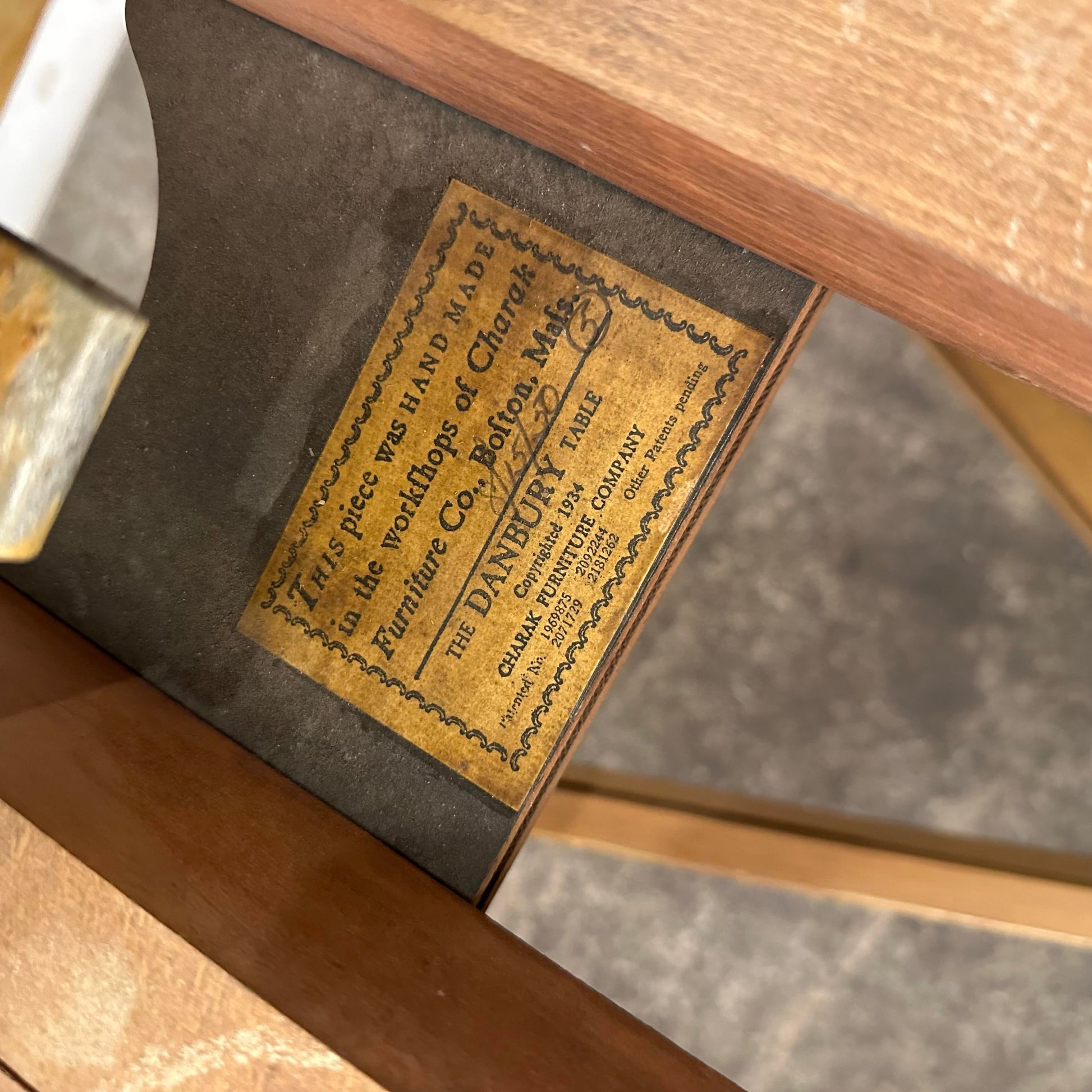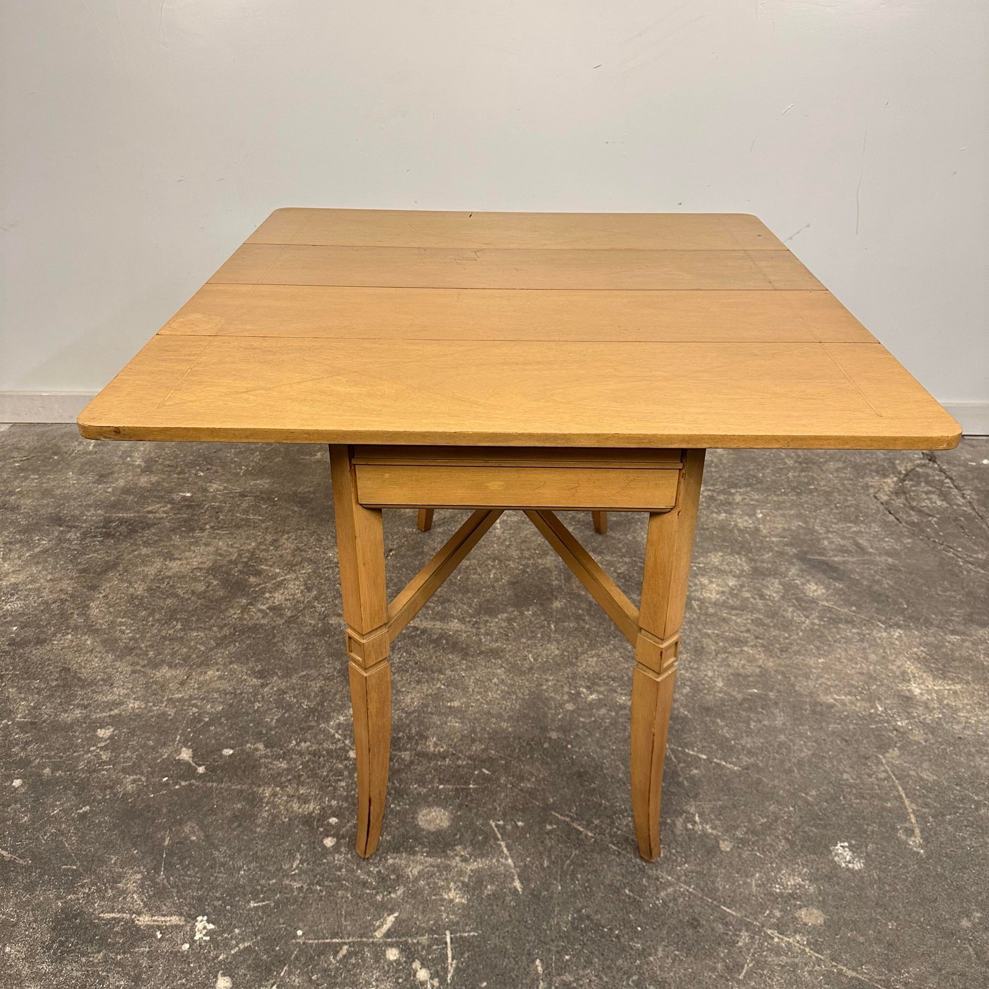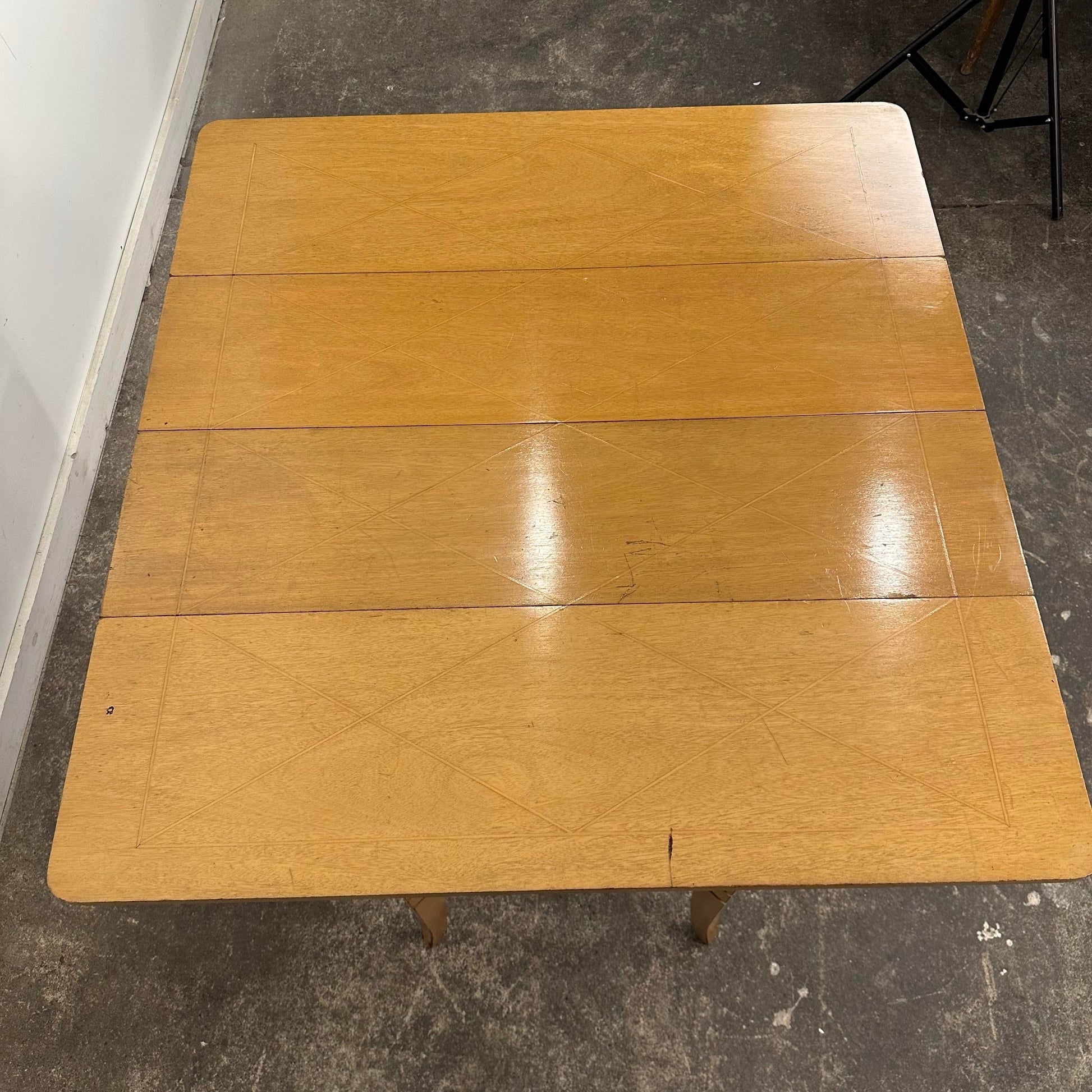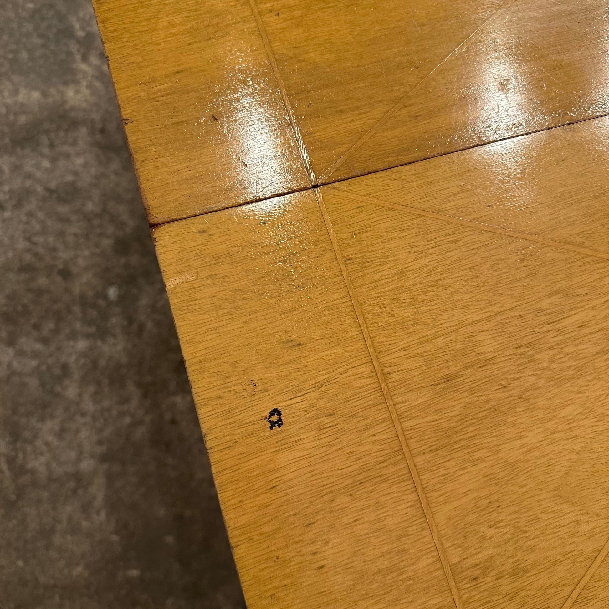 1951 extendable drop-lead dining table by Tommi Parzinger for Charak Furniture Company. This table is crafted with contrasting bleached mahogany and geometric maple inlay. This table has a functional and unique design—the extendable dining table top spins 90 degrees to allow the table’s leaves to drop. Makers mark on inside.