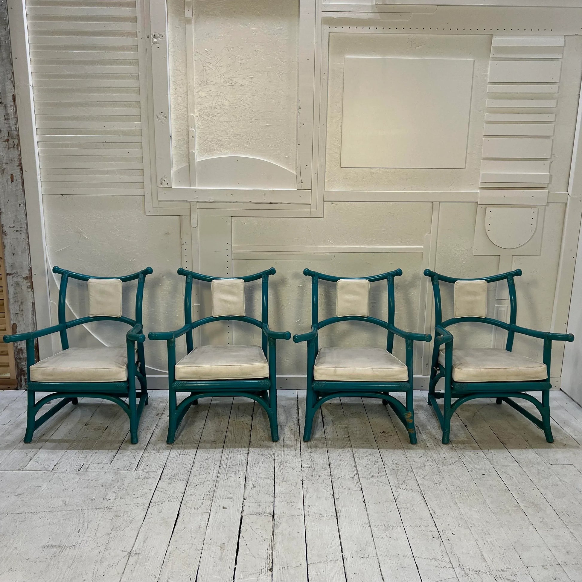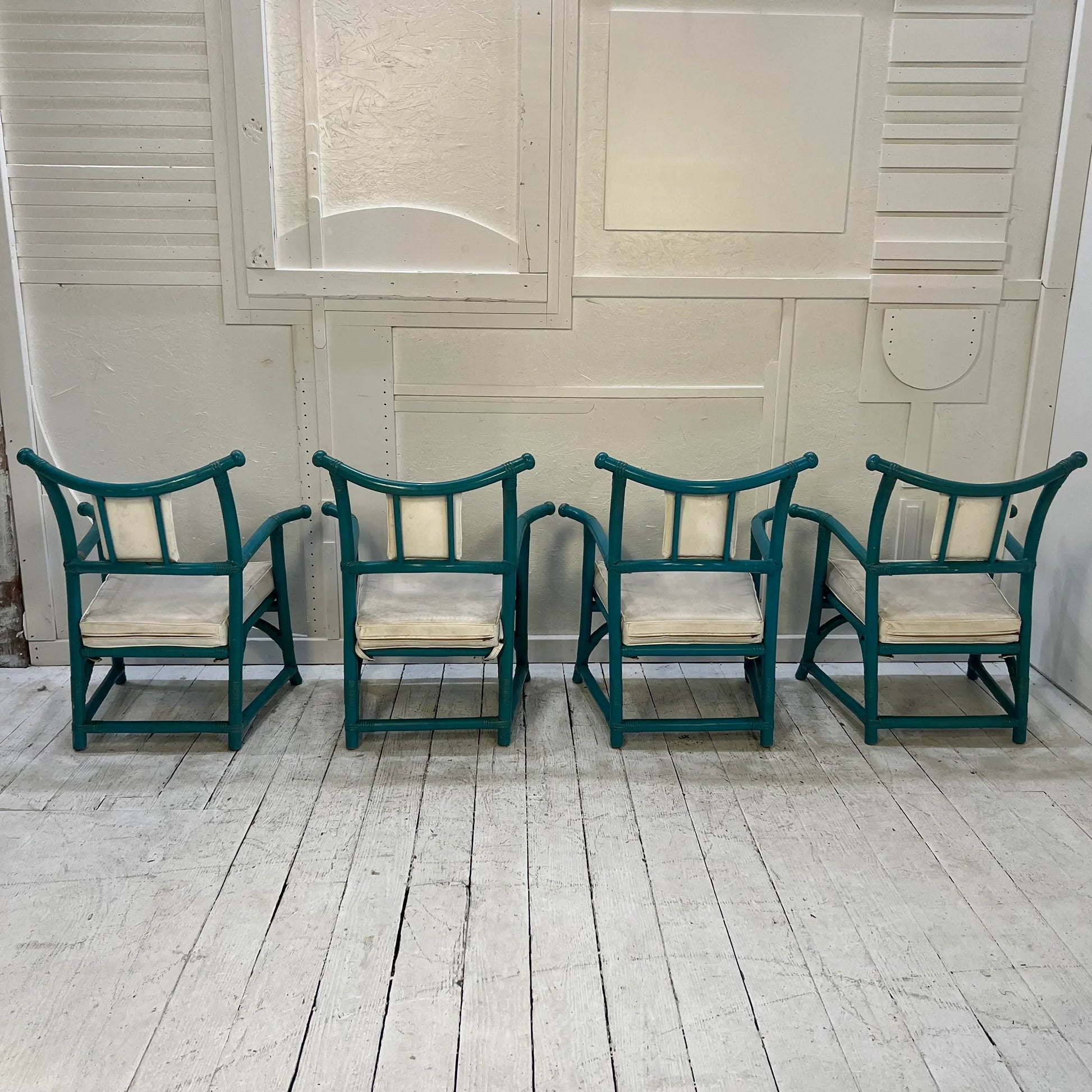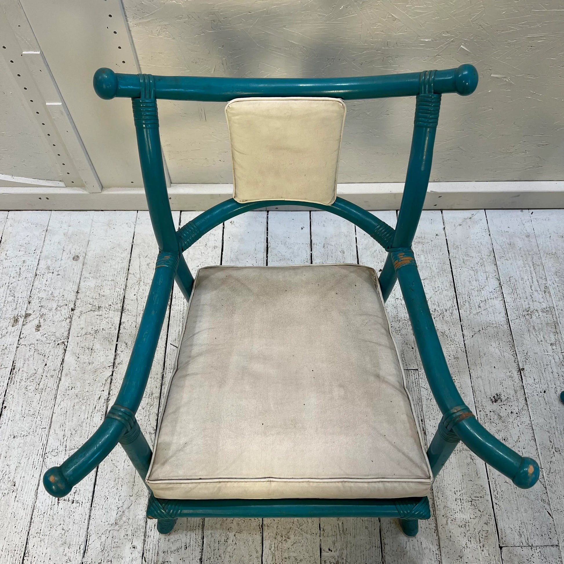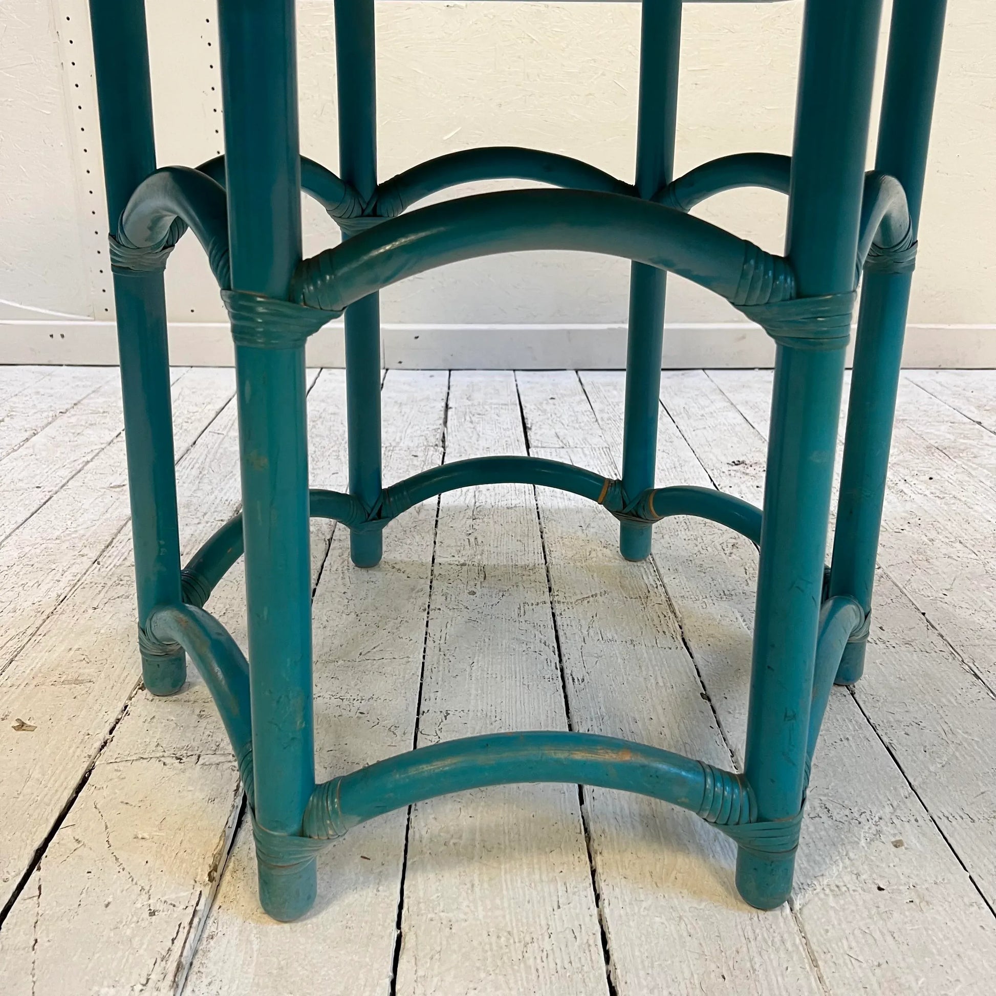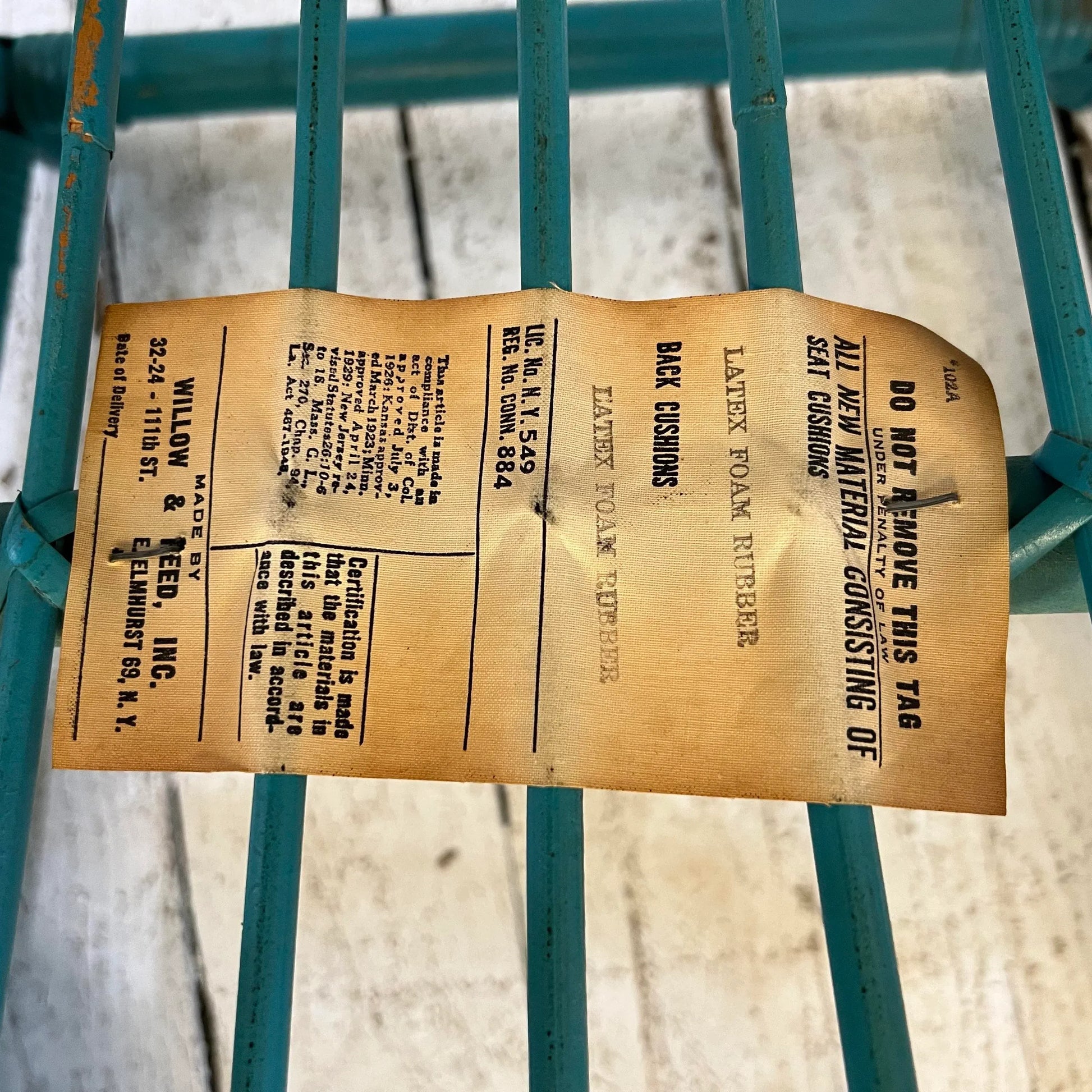 Table set designed by Tommi Parzinger for Willow and Reed. This set is a lovely teal color, with a white table top featuring brass inlays. The chairs have white vinyl cushions on them. This would be a perfect set for a mid century inspired sun room. Original tag on chair.