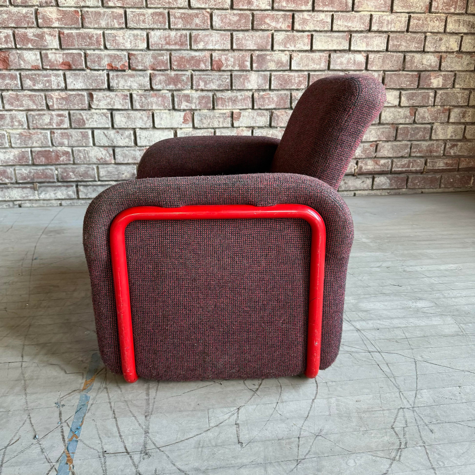 Post modern or Memphis style Tubular Kinetics Furniture lounge Chair. This chair has a unique tubular design that gives it a futuristic and contemporary look. The frame is made of high-quality steel, ensuring durability and stability for years to come. The makers mark is tagged on the bottom of the chair.
