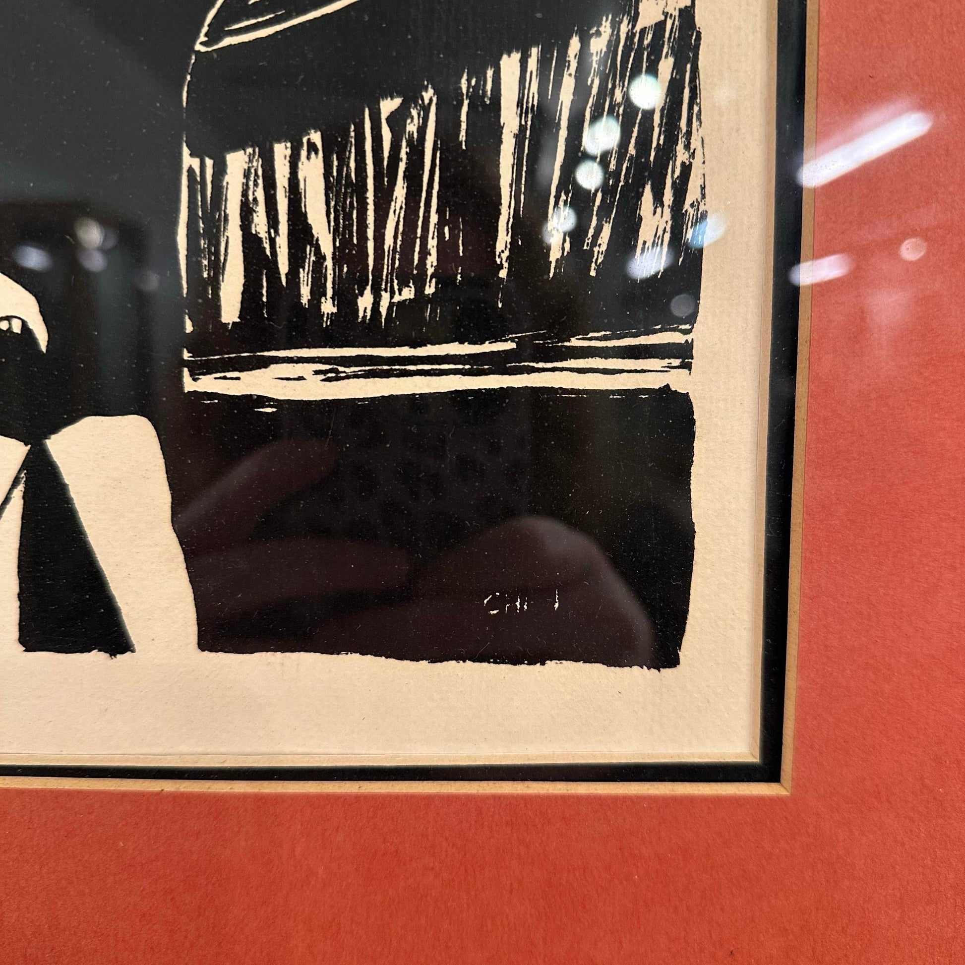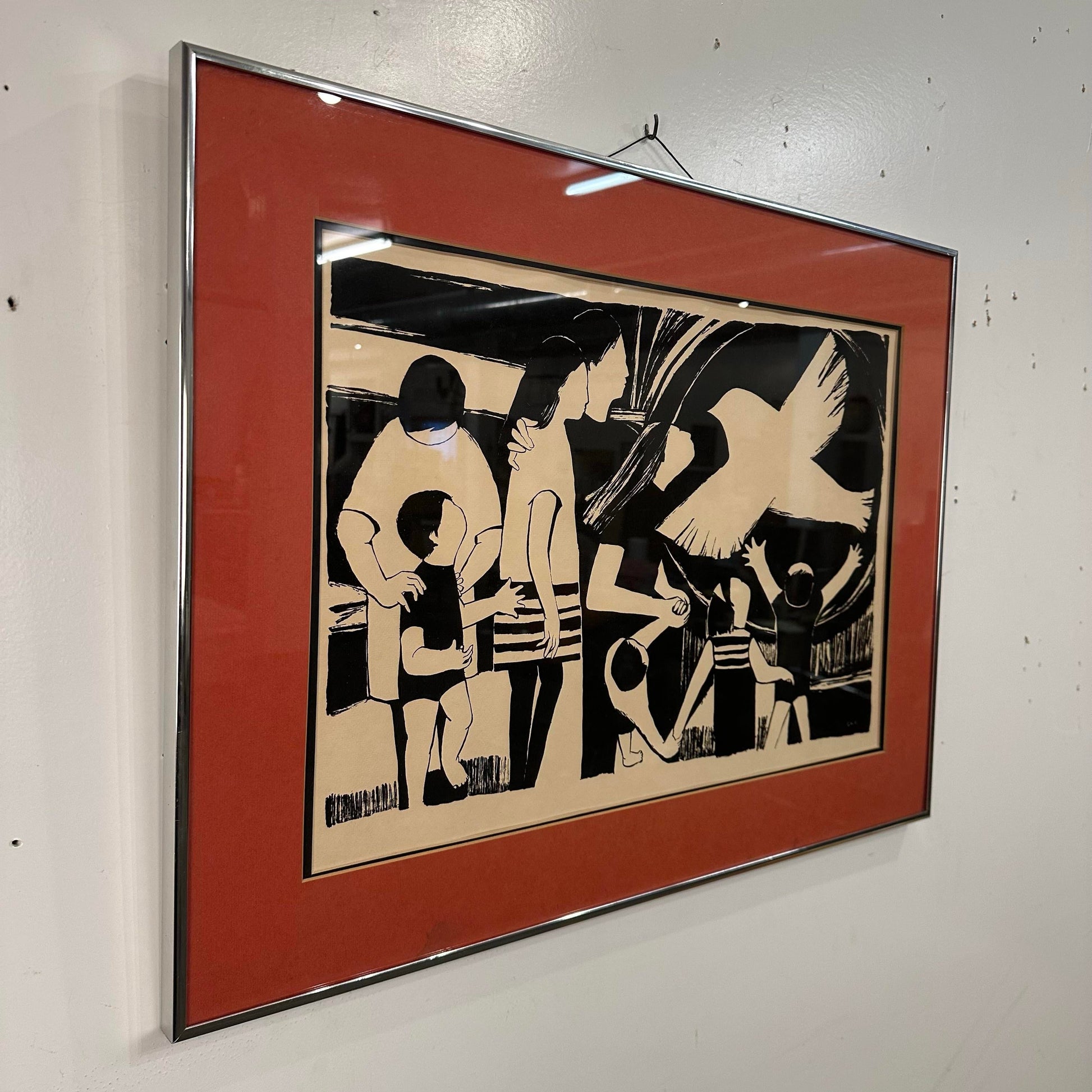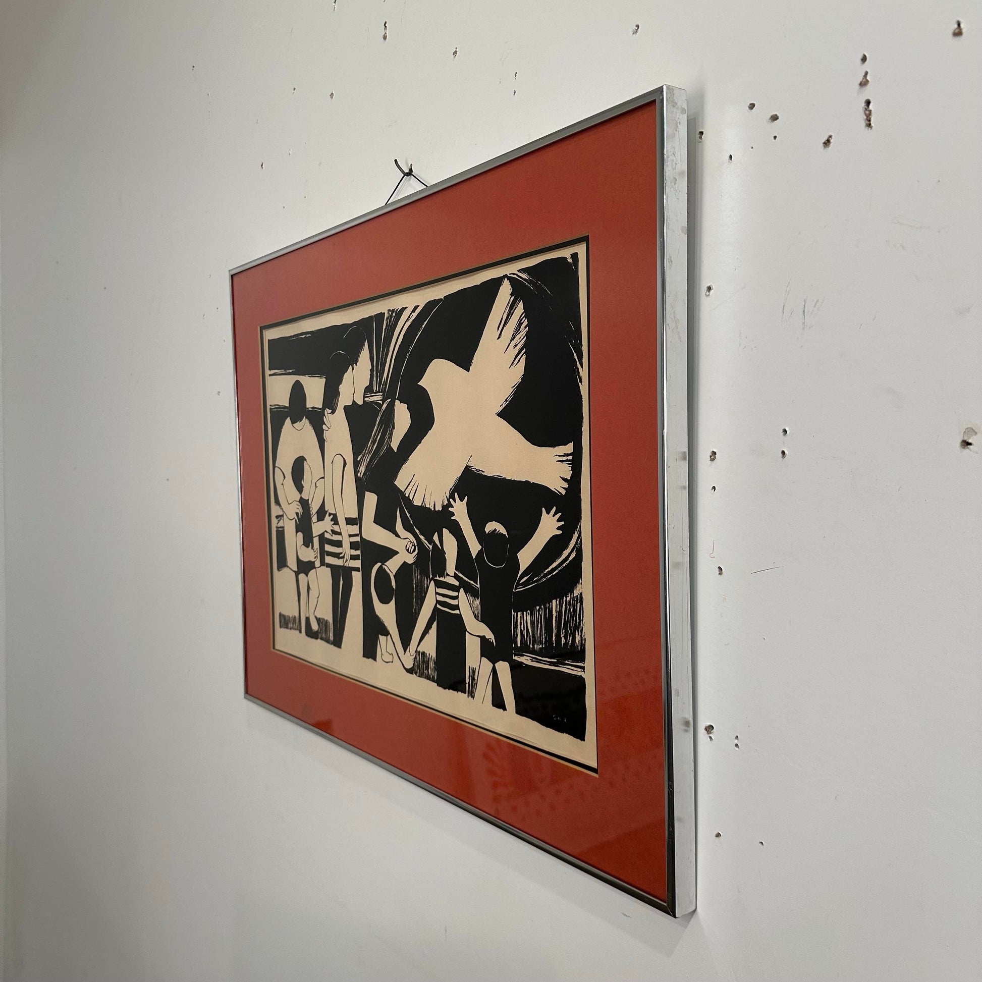 Unknown Artist Woodcut Print Dove. This woodcut print has been professionally framed in a chrome metal frame with a red matte. The print depicts a dove flying overtop a group of people possibly a family. It appears the artists name is in the right corner but we are unable to read the name.