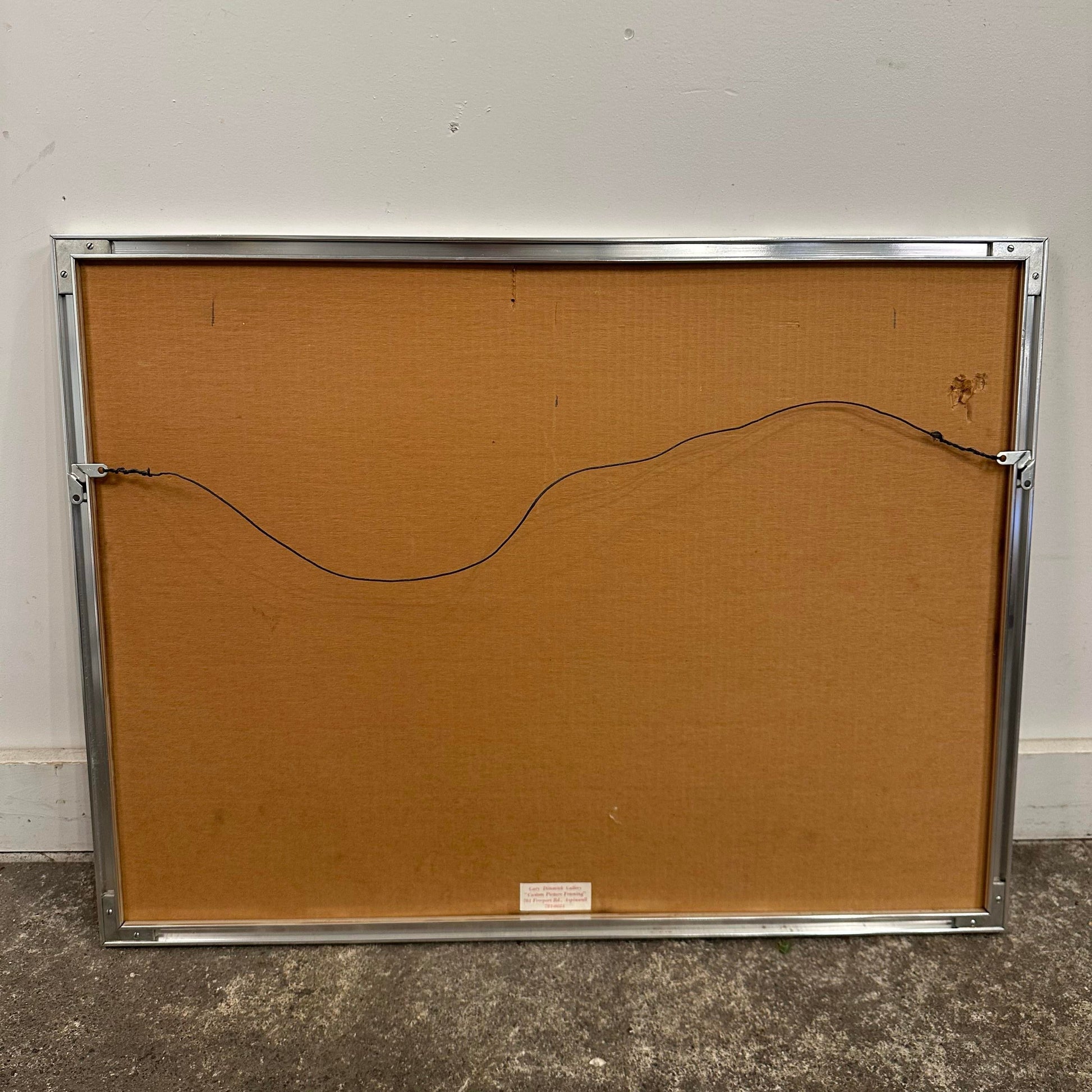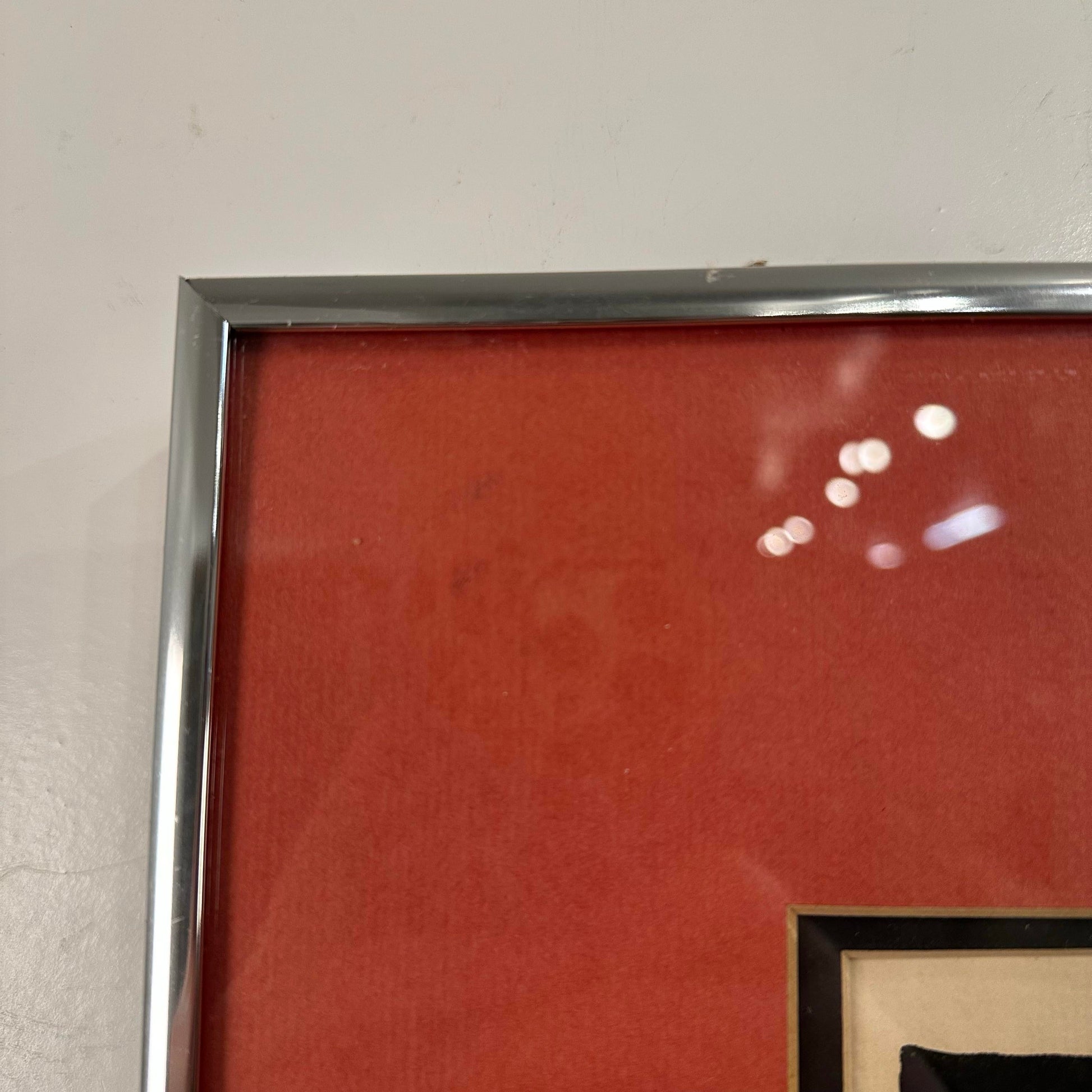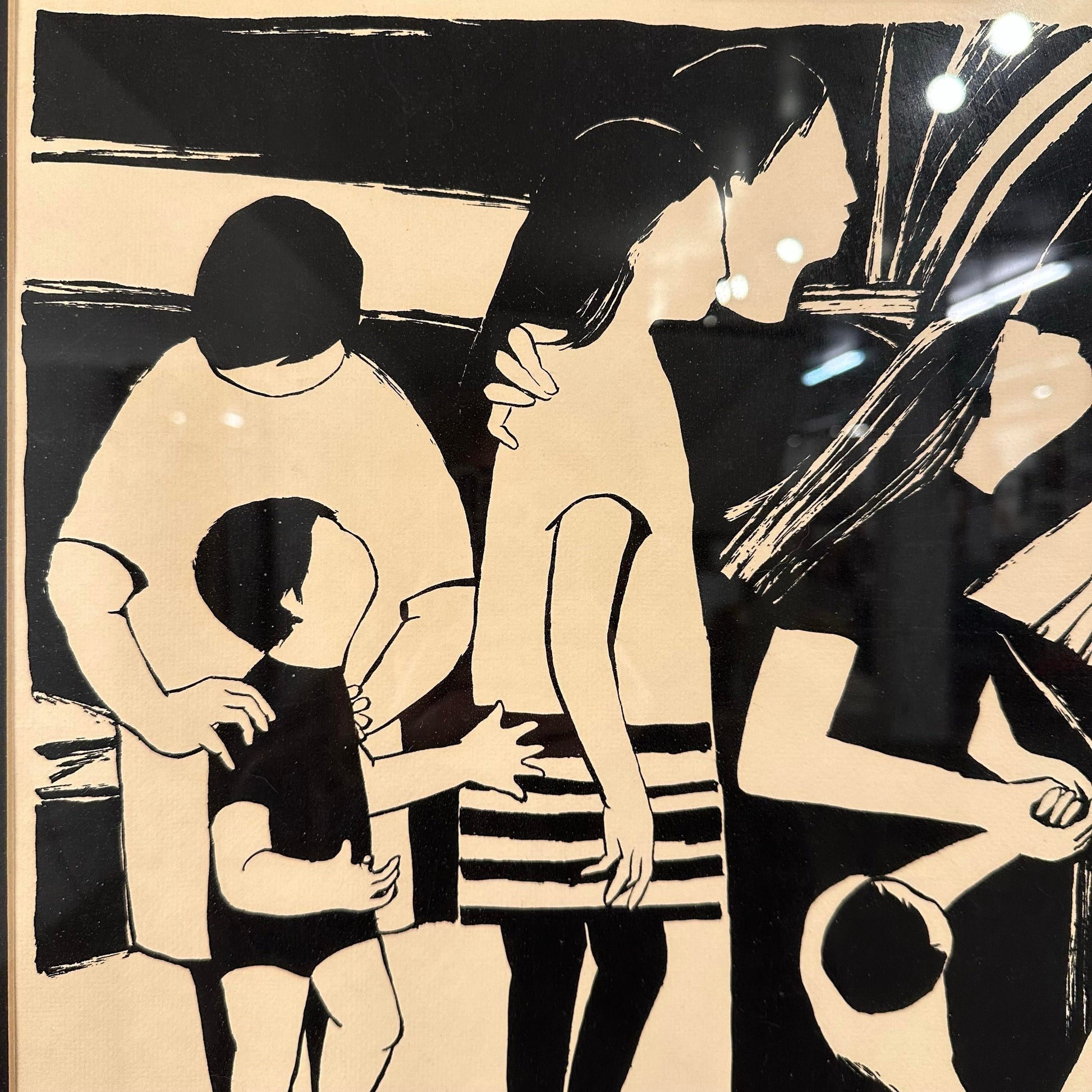 Unknown Artist Woodcut Print Dove. This woodcut print has been professionally framed in a chrome metal frame with a red matte. The print depicts a dove flying overtop a group of people possibly a family. It appears the artists name is in the right corner but we are unable to read the name.