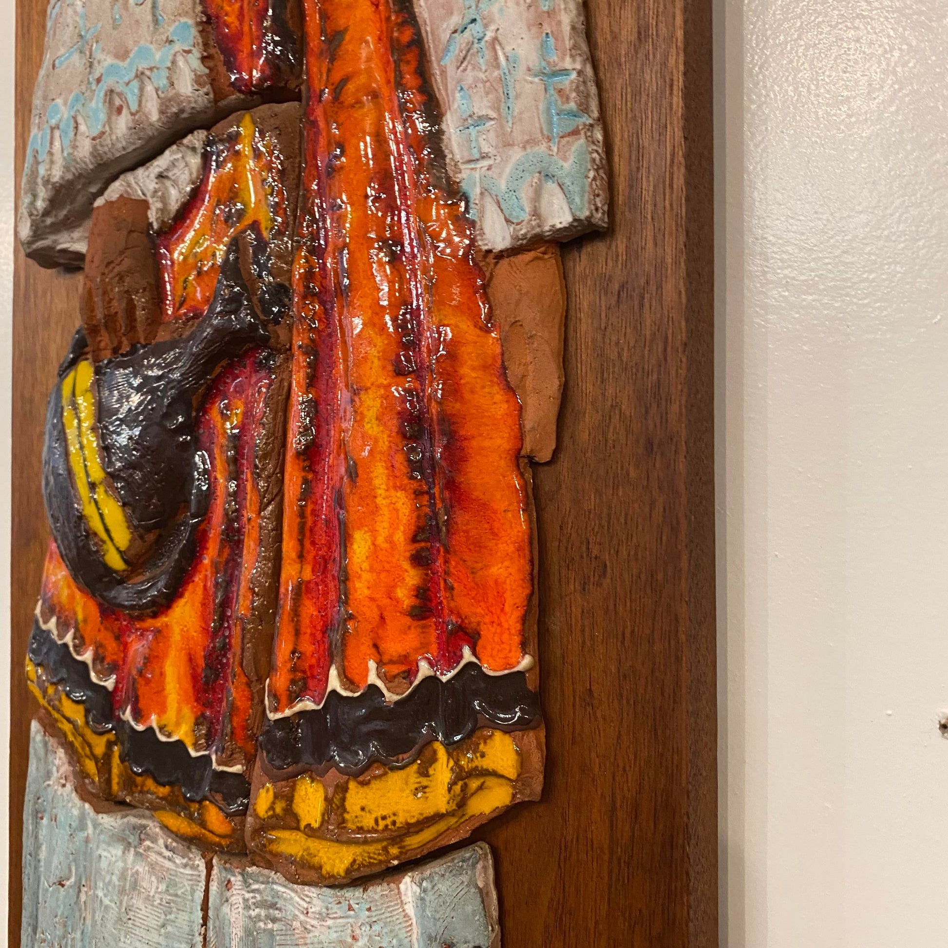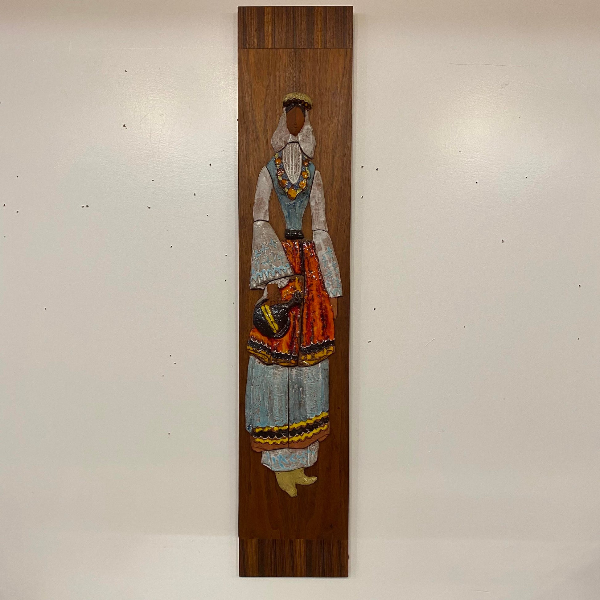 Vintage Ceramic Wall Art of Woman on Walnut and Rosewood Board Mid Century Style of Harris Strong