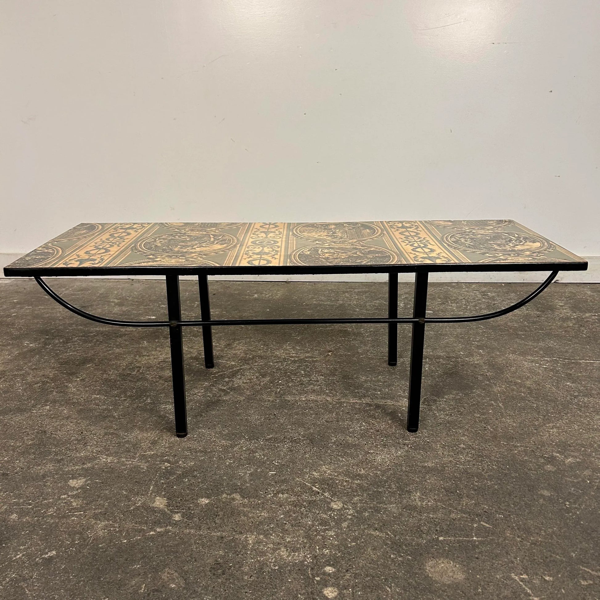 A very nice petite fornassetti style coffee table with iron legs. The table top depicts an unidentified Italian print with a lacquer finish.